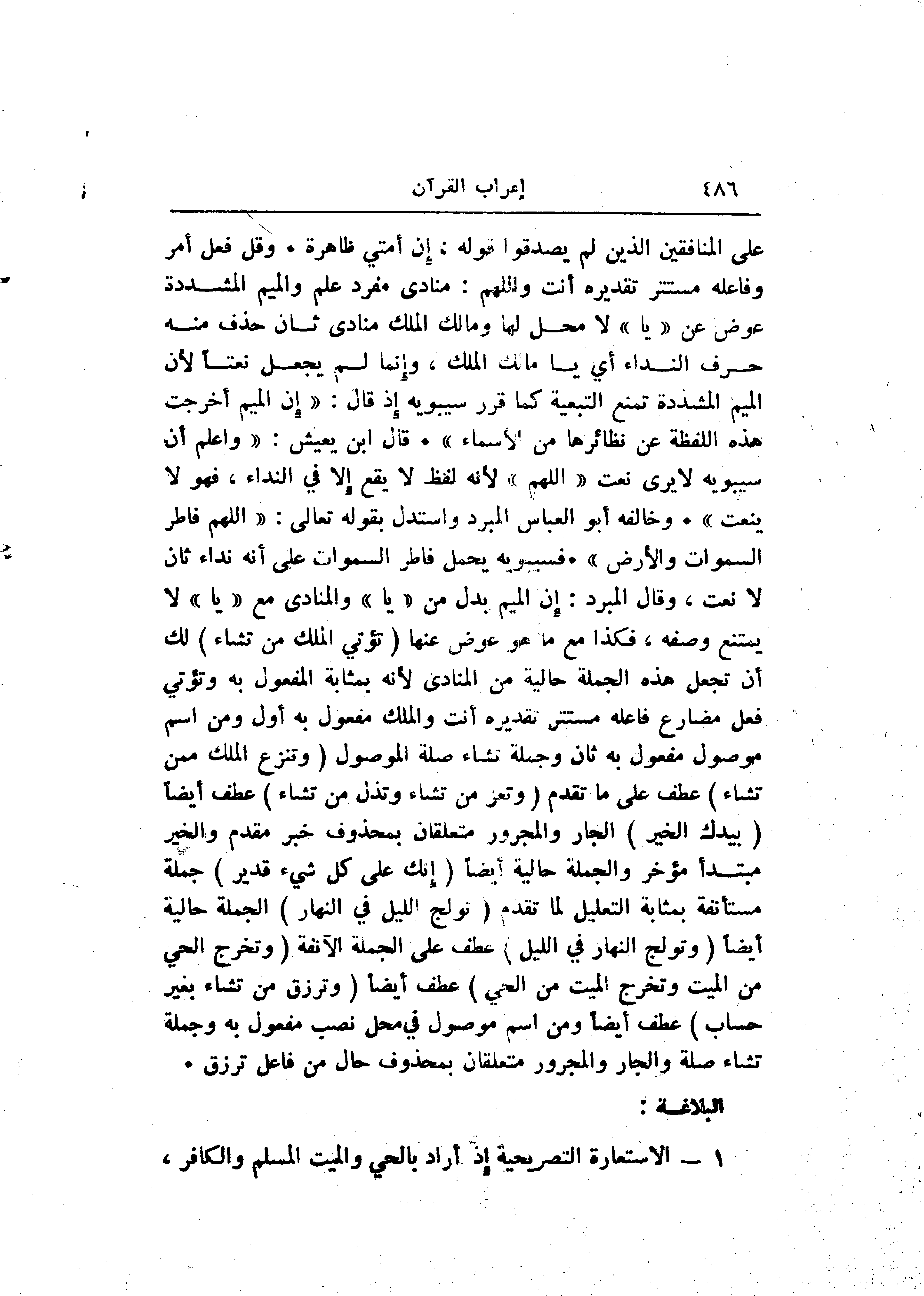 على المنافقين الذين لم يصدقوا قوله: إن أمتي ظاهرة. وقل فعل أمر وفاعله مستتر تقديره أنت واللهم: منادى مفرد علم والميم المشددة عوض عن «يا» لا محل لها ومالك الملك منادى ثان حذف منه حرف النداء أي يا مالك الملك، وإنما لم يجعل نعتا لأن الميم المشددة تمنع التبعية كما قرر سيبويه إذ قال: «إن الميم أخرجت هذه اللفظة عن نظائرها من الأسماء» . قال ابن يعيش: «واعلم أن سيبويه لا يرى نعت «اللهم» لأنه لفظ لا يقع إلا في النداء، فهو لا ينعت» . وخالفه أبو العباس المبرد واستدل بقوله تعالى: «اللهم فاطر السموات والأرض» . سيبويه يحمل فاطر السموات على أنه نداء ثان لا نعت، وقال المبرد: إن الميم بدل من «يا» والمنادى مع «يا» لا يمتنع وصفه، فكذا مع ما هو عوض عنها (تُؤْتِي الْمُلْكَ مَنْ تَشاءُ) لك أن تجعل هذه الجملة حالية من المنادى لأنه بمثابة المفعول به وتؤتي فعل مضارع فاعله مستتر تقديره أنت والملك مفعول به أول ومن اسم موصول مفعول به ثان وجملة تشاء صلة الموصول (وَتَنْزِعُ الْمُلْكَ مِمَّنْ تَشاءُ) عطف على ما تقدم (وَتُعِزُّ مَنْ تَشاءُ وَتُذِلُّ مَنْ تَشاءُ) عطف أيضا (بِيَدِكَ الْخَيْرُ) الجار والمجرور متعلقان بمحذوف خبر مقدم والخير مبتدأ مؤخر والجملة حالية أيضا (إِنَّكَ عَلى كُلِّ شَيْءٍ قَدِيرٌ) جملة مستأنفة بمثابة التعليل لما تقدم (تُولِجُ اللَّيْلَ فِي النَّهارِ) الجملة حالية أيضا (وَتُولِجُ النَّهارَ فِي اللَّيْلِ) عطف على الجملة الآنفة (وَتُخْرِجُ الْحَيَّ مِنَ الْمَيِّتِ وَتُخْرِجُ الْمَيِّتَ مِنَ الْحَيِّ) عطف أيضا (وَتَرْزُقُ مَنْ تَشاءُ بِغَيْرِ حِسابٍ) عطف أيضا ومن اسم موصول في محل نصب مفعول به وجملة تشاء صلة والجار والمجرور متعلقان بمحذوف حال من فاعل ترزق.