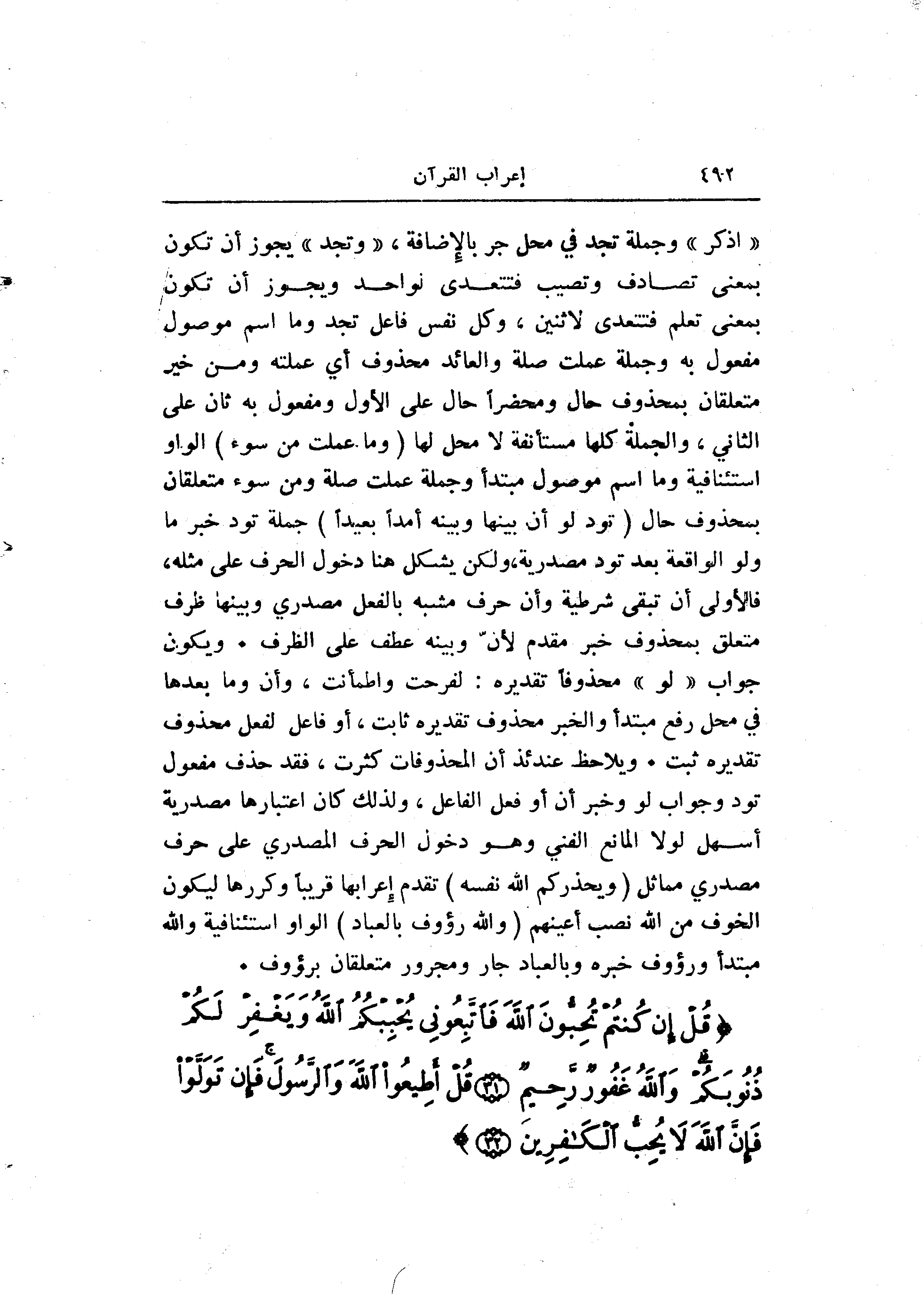 «اذكر» وجملة تجد في محل جر بالإضافة، «وتجد» يجوز أن تكون بمعنى تصادف وتصيب فتتعدى لواحد ويجوز أن تكون بمعنى تعلم فتتعدى لاثنين، وكل نفس فاعل تجد وما اسم موصول مفعول به وجملة عملت صلة والعائد محذوف أي عملته ومن خير متعلقان بمحذوف حال ومحضرا حال على الأول ومفعول به ثان على الثاني، والجملة كلها مستأنفة لا محل لها (وَما عَمِلَتْ مِنْ سُوءٍ) الواو استئنافية وما اسم موصول مبتدأ وجملة عملت صلة ومن سوء متعلقان بمحذوف حال (تَوَدُّ لَوْ أَنَّ بَيْنَها وَبَيْنَهُ أَمَداً بَعِيداً) جملة تود خبر ما ولو الواقعة بعد تود مصدرية، ولكن يشكل هنا دخول الحرف على مثله، فالأولى أن تبقى شرطية وأن حرف مشبه بالفعل مصدري وبينها ظرف متعلق بمحذوف خبر مقدم لأنّ وبينه عطف على الظرف. ويكون جواب «لو» محذوفا تقديره: لفرحت واطمأنت، وأن وما بعدها في محل رفع مبتدأ والخبر محذوف تقديره ثابت، أو فاعل لفعل محذوف تقديره ثبت. ويلاحظ عندئذ أن المحذوفات كثرت، فقد حذف مفعول تود وجواب لو وخبر أن أو فعل الفاعل، ولذلك كان اعتبارها مصدرية أسهل لولا المانع الفني وهو دخول الحرف المصدري على حرف مصدري مماثل (وَيُحَذِّرُكُمُ اللَّهُ نَفْسَهُ) تقدم إعرابها قريبا وكررها ليكون الخوف من الله نصب أعينهم (وَاللَّهُ رَؤُفٌ بِالْعِبادِ) الواو استئنافية والله مبتدأ ورؤوف خبره وبالعباد جار ومجرور متعلقان برؤوف.