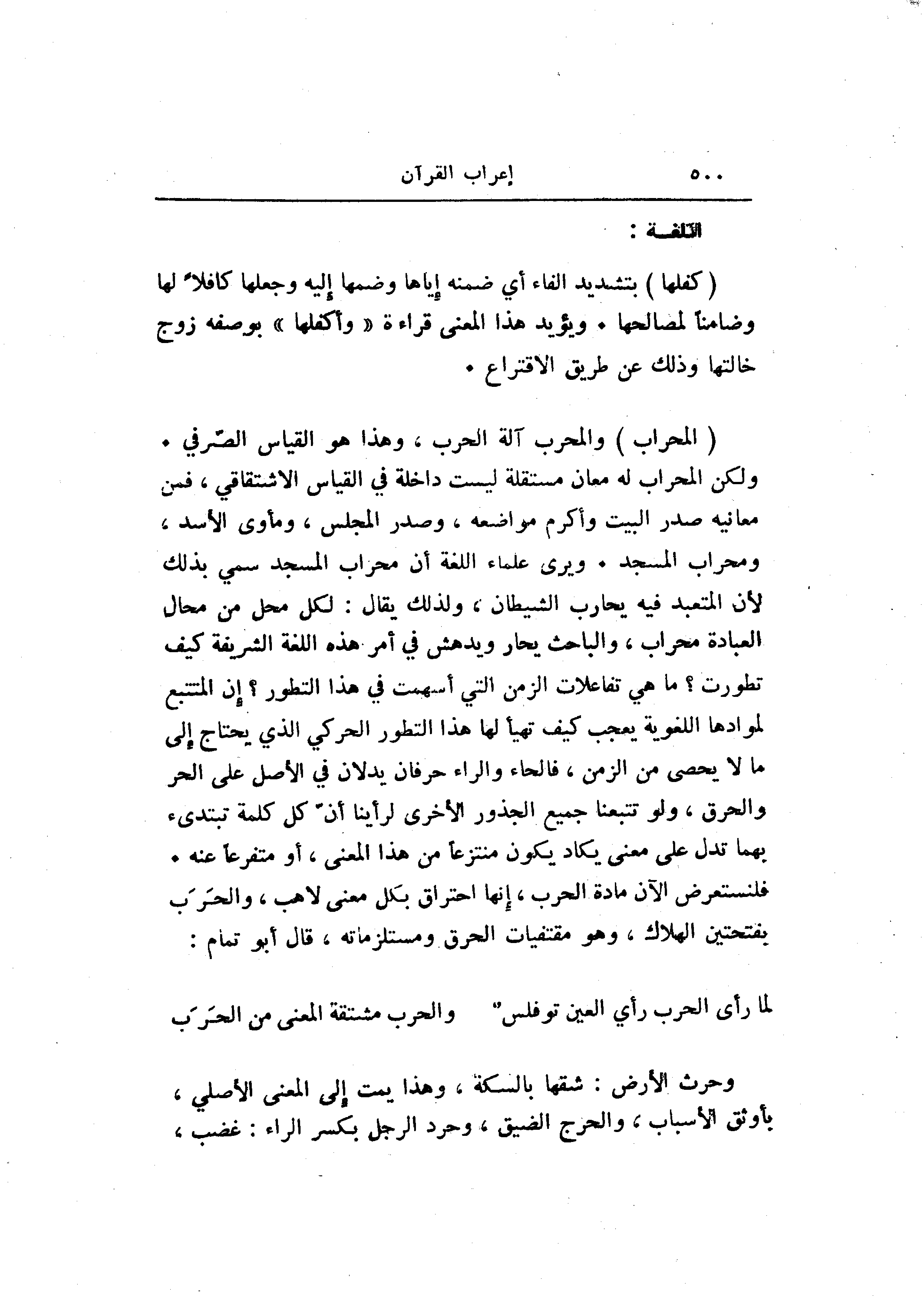 ولكن المحراب له معان مستقلة ليست داخلة في القياس الاشتقاقي، فمن معانيه صدر البيت وأكرم مواضعه، وصدر المجلس، ومأوى الأسد، ومحراب المسجد. ويرى علماء اللغة أن محراب المسجد سمي بذلك لأن المتعبد فيه يحارب الشيطان، ولذلك يقال: لكل محل من محال العبادة محراب، والباحث يحار ويدهش في أمر هذه اللغة الشريفة كيف تطورت؟ ما هي تفاعلات الزمن التي أسهمت في هذا التطور؟ إن المتتبع لموادها اللغوية يعجب كيف تهيأ لها هذا التطور الحركي الذي يحتاج إلى ما لا يحصى من الزمن، فالحاء والراء حرفان يدلان في الأصل على الحر والحرق، ولو تتبعنا جميع الجذور الأخرى لرأينا أنّ كل كلمة تبتدئ بهما تدل على معنى يكاد يكون منتزعا من هذا المعنى، أو متفرعا عنه.