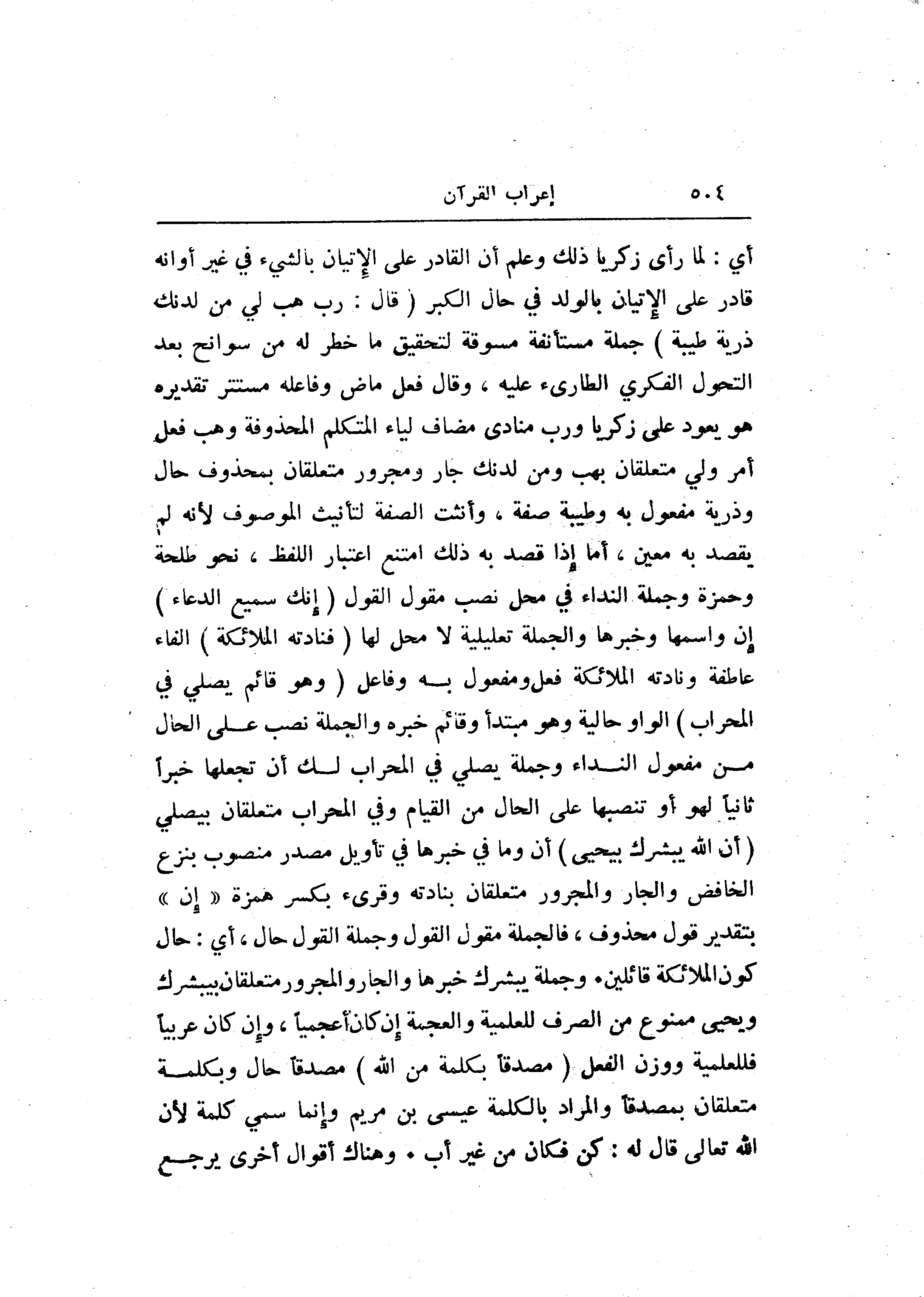 أي: لما رأى زكريا ذلك وعلم أن القادر على الإتيان بالشيء في غير أوانه قادر على الإتيان بالولد في حال الكبر (قالَ: رَبِّ هَبْ لِي مِنْ لَدُنْكَ ذُرِّيَّةً طَيِّبَةً) جملة مستأنفة مسوقة لتحقيق ما خطر له من سوانح بعد التحول الفكري الطارئ عليه، وقال فعل ماض وفاعله مستتر تقديره هو يعود على زكريا ورب منادى مضاف لياء المتكلم المحذوفة وهب فعل أمر ولي متعلقان بهب ومن لدنك جار ومجرور متعلقان بمحذوف حال وذرية مفعول به وطيبة صفة، وأنثت الصفة لتأنيث الموصوف لأنه لم يقصد به معين، أما إذا قصد به ذلك امتنع اعتبار اللفظ، نحو طلحة وحمزة وجملة النداء في محل نصب مقول القول (إِنَّكَ سَمِيعُ الدُّعاءِ) إن واسمها وخبرها والجملة تعليلية لا محل لها (فَنادَتْهُ الْمَلائِكَةُ) الفاء عاطفة ونادته الملائكة فعل ومفعول به وفاعل (وَهُوَ قائِمٌ يُصَلِّي فِي الْمِحْرابِ) الواو حالية وهو مبتدأ وقائم خبره والجملة نصب على الحال من مفعول النداء وجملة يصلي في المحراب لك أن تجعلها خبرا ثانيا لهو أو تنصبها على الحال من القيام وفي المحراب متعلقان بيصلي (أَنَّ اللَّهَ يُبَشِّرُكَ بِيَحْيى) أن وما في خبرها في تأويل مصدر منصوب بنزع الخافض والجار والمجرور متعلقان بنادته وقرىء بكسر همزة «إن» بتقدير قول محذوف، فالجملة مقول القول وجملة القول حال، أي: حال كون الملائكة قائلين. وجملة يبشرك خبرها والجار والمجرور متعلقان بيبشرك ويحيى ممنوع من الصرف للعلمية والعجمة إن كان أعجميا، وإن كان عربيا فللعلمية ووزن الفعل (مُصَدِّقاً بِكَلِمَةٍ مِنَ اللَّهِ) مصدقا حال وبكلمة متعلقان بمصدقا والمراد بالكلمة عيسى بن مريم وإنما سمي كلمة لأن الله تعالى قال له: كن فكان من غير أب. وهناك أقوال أخرى يرجع