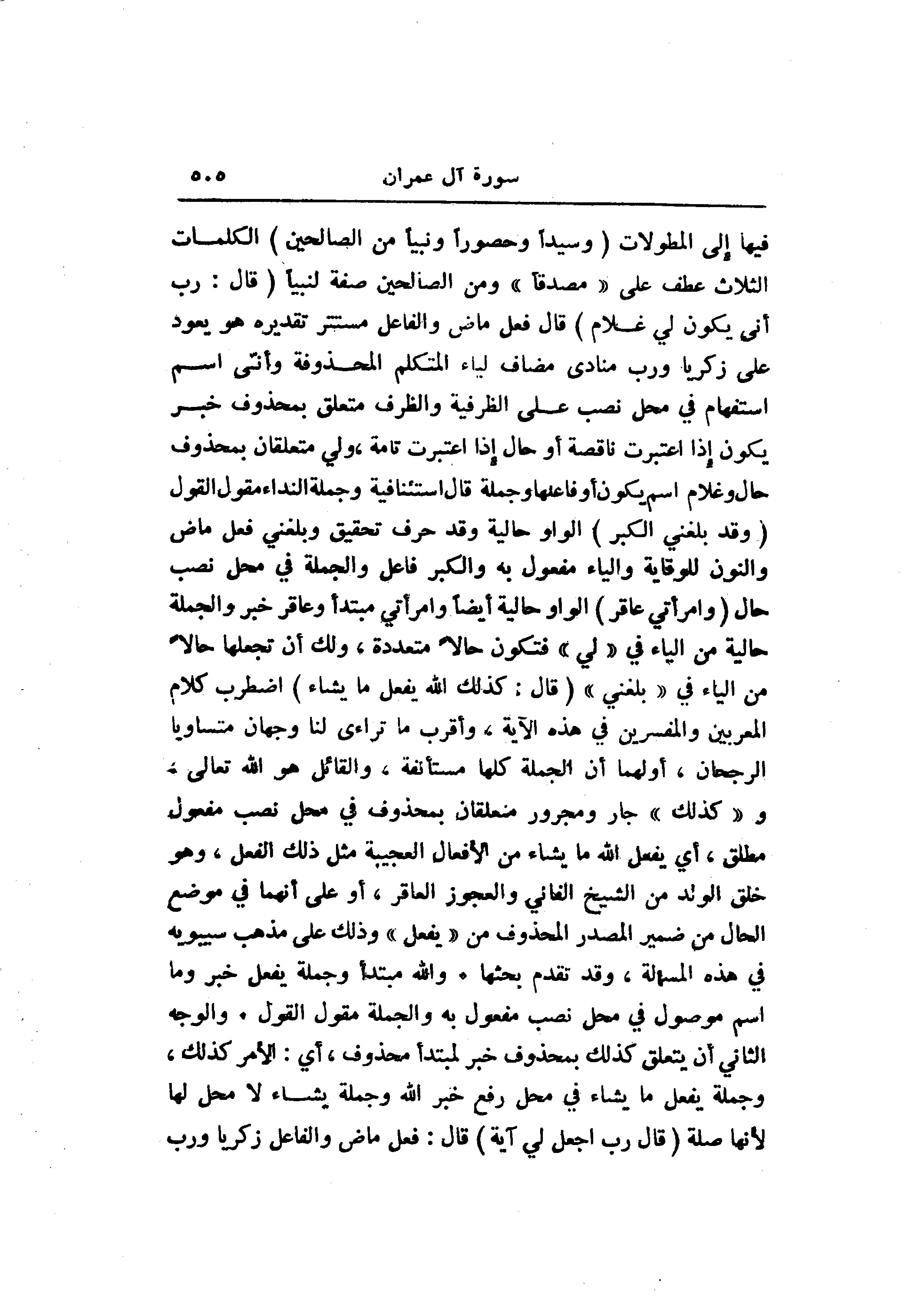 فيها إلى المطولات (وَسَيِّداً وَحَصُوراً وَنَبِيًّا مِنَ الصَّالِحِينَ) الكلمات الثلاث عطف على «مصدقا» ومن الصالحين صفة لنبيا (قالَ: رَبِّ أَنَّى يَكُونُ لِي غُلامٌ) قال فعل ماض والفاعل مستتر تقديره هو يعود على زكريا ورب منادى مضاف لياء المتكلم المحذوفة وأنّى اسم استفهام في محل نصب على الظرفية والظرف متعلق بمحذوف خبر يكون إذا اعتبرت ناقصة أو حال إذا اعتبرت تامة، ولي متعلقان بمحذوف حال وغلام اسم يكون أو فاعلها وجملة قال استئنافية وجملة النداء مقول القول (وَقَدْ بَلَغَنِيَ الْكِبَرُ) الواو حالية وقد حرف تحقيق وبلغني فعل ماض والنون للوقاية والياء مفعول به والكبر فاعل والجملة في محل نصب حال (وَامْرَأَتِي عاقِرٌ) الواو حالية أيضا وامرأتي مبتدأ وعاقر خبر والجملة حالية من الياء في «لي» فتكون حالا متعددة، ولك أن تجعلها حالا من الياء في «بلغني» (قالَ: كَذلِكَ اللَّهُ يَفْعَلُ ما يَشاءُ) اضطرب كلام المعربين والمفسرين في هذه الآية، وأقرب ما تراءى لنا وجهان متساويا الرجحان، أولهما أن الجملة كلها مستأنفة، والقائل هو الله تعالى، و «كذلك» جار ومجرور متعلقان بمحذوف في محل نصب مفعول مطلق، أي يفعل الله ما يشاء من الأفعال العجيبة مثل ذلك الفعل، وهو خلق الولد من الشيخ الفاني والعجوز العاقر، أو على أنهما في موضع الحال من ضمير المصدر المحذوف من «يفعل» وذلك على مذهب سيبويه في هذه المسألة، وقد تقدم بحثها. والله مبتدأ وجملة يفعل خبر وما اسم موصول في محل نصب مفعول به والجملة مقول القول. والوجه الثاني أن يتعلق كذلك بمحذوف خبر لمبتدأ محذوف، أي: الأمر كذلك، وجملة يفعل ما يشاء في محل رفع خبر الله وجملة يشاء لا محل لها لأنها صلة (قالَ رَبِّ اجْعَلْ لِي آيَةً) قال: فعل ماض والفاعل زكريا ورب