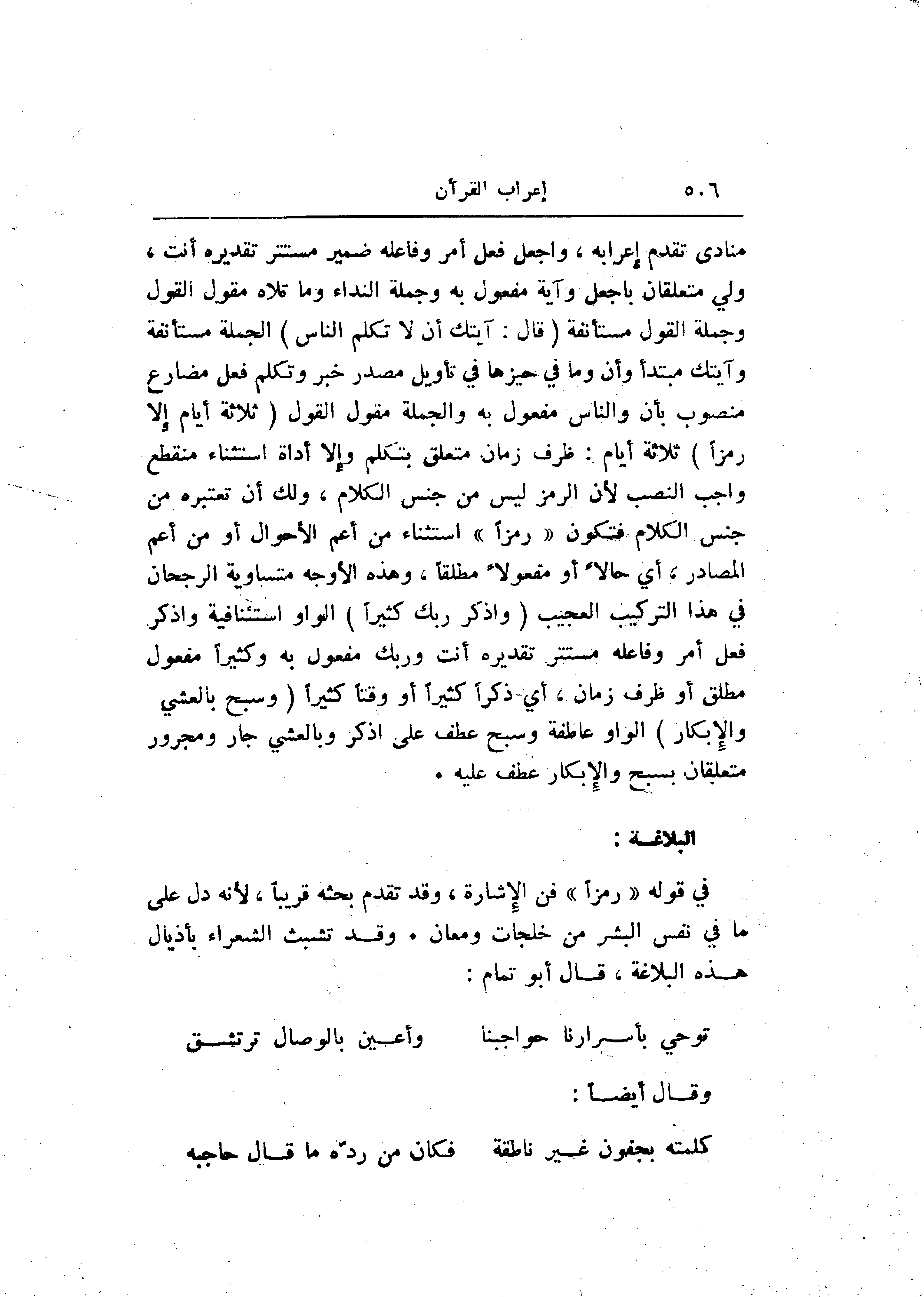 منصوب بأن والناس مفعول به والجملة مقول القول (ثَلاثَةَ أَيَّامٍ إِلَّا رَمْزاً) ثلاثة أيام: ظرف زمان متعلق بتكلم وإلا أداة استثناء منقطع واجب النصب لأن الرمز ليس من جنس الكلام، ولك أن تعتبره من جنس الكلام فتكون «رمزا» استثناء من أعم الأحوال أو من أعم المصادر، أي حالا أو مفعولا مطلقا، وهذه الأوجه متساوية الرجحان في هذا التركيب العجيب (وَاذْكُرْ رَبَّكَ كَثِيراً) الواو استئنافية واذكر فعل أمر وفاعله مستتر تقديره أنت وربك مفعول به وكثيرا مفعول مطلق أو ظرف زمان، أي ذكرا كثيرا أو وقتا كثيرا (وَسَبِّحْ بِالْعَشِيِّ وَالْإِبْكارِ) الواو عاطفة وسبح عطف على اذكر وبالعشي جار ومجرور متعلقان بسبح والإبكار عطف عليه.
