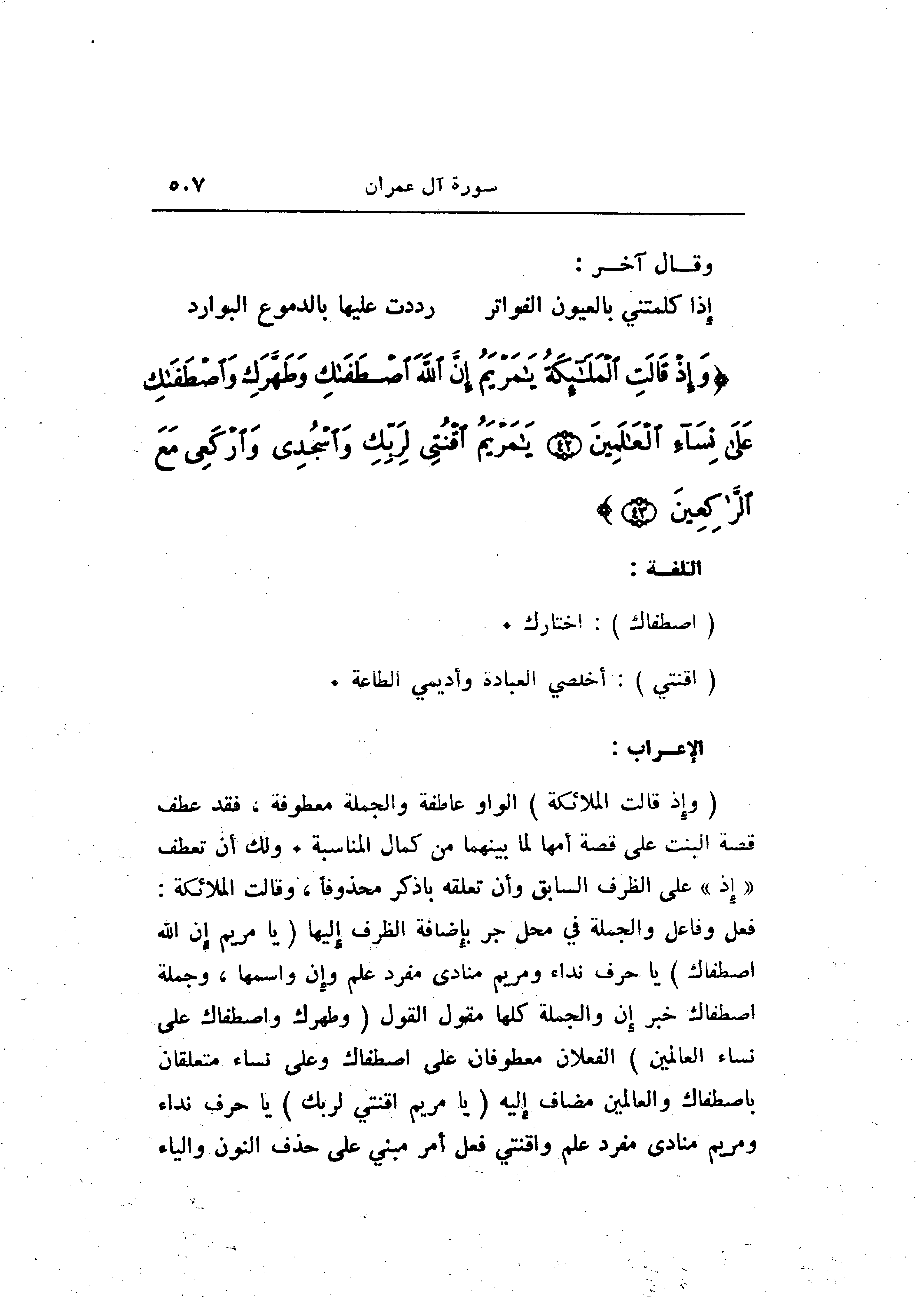 فعل وفاعل والجملة في محل جر بإضافة الظرف إليها (يا مَرْيَمُ إِنَّ اللَّهَ اصْطَفاكِ) يا حرف نداء ومريم منادى مفرد علم وإن واسمها، وجملة اصطفاك خبر إن والجملة كلها مقول القول (وَطَهَّرَكِ وَاصْطَفاكِ عَلى نِساءِ الْعالَمِينَ) الفعلان معطوفان على اصطفاك وعلى نساء متعلقان باصطفاك والعالمين مضاف إليه (يا مَرْيَمُ اقْنُتِي لِرَبِّكِ) يا حرف نداء ومريم منادى مفرد علم واقنتي فعل أمر مبني على حذف النون والياء