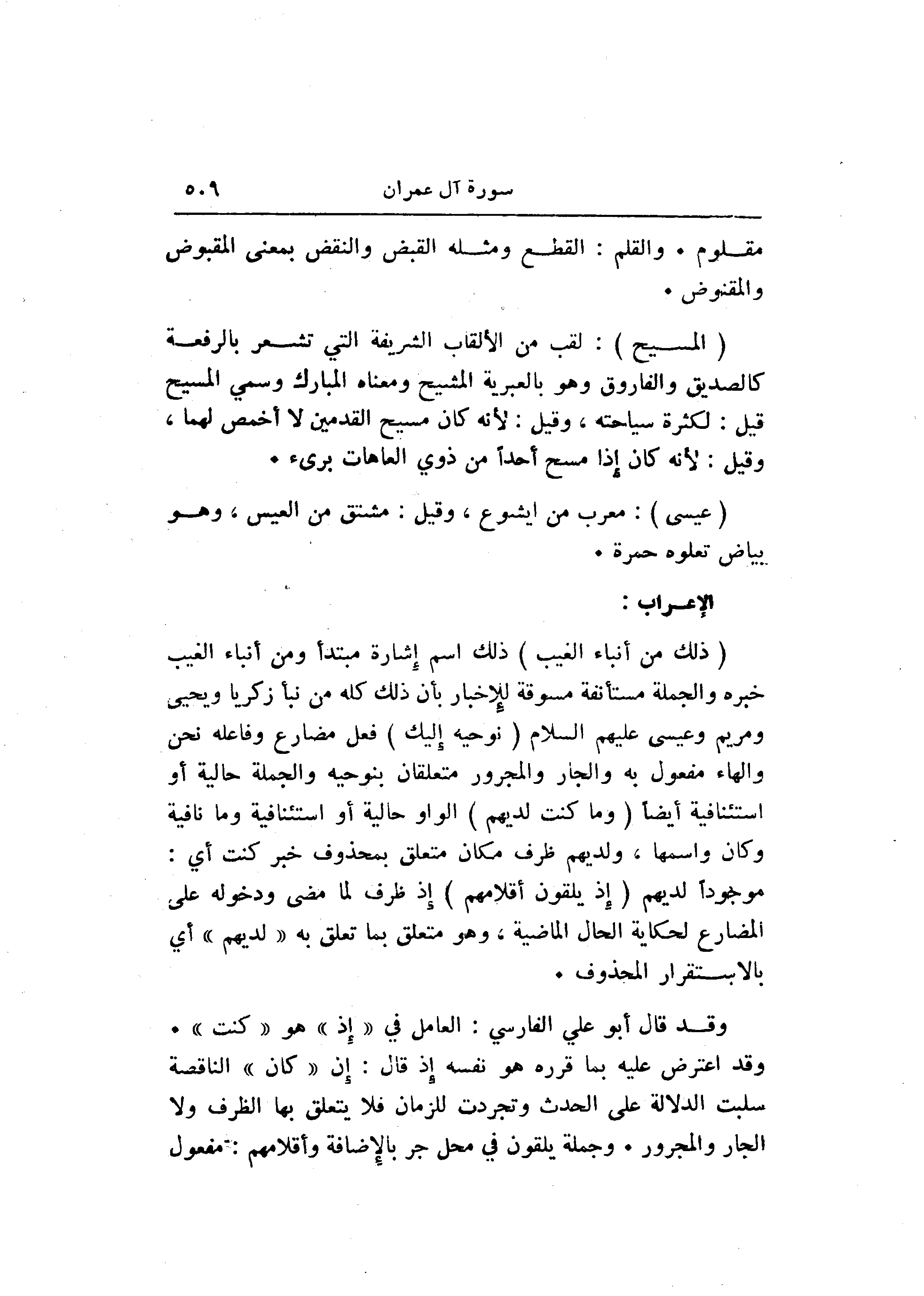 وقد اعترض عليه بما قرره هو نفسه إذ قال: إن «كان» الناقصة سلبت الدلالة على الحدث وتجردت للزمان فلا يتعلق بها الظرف ولا الجار والمجرور. وجملة يلقون في محل جر بالإضافة وأقلامهم: مفعول