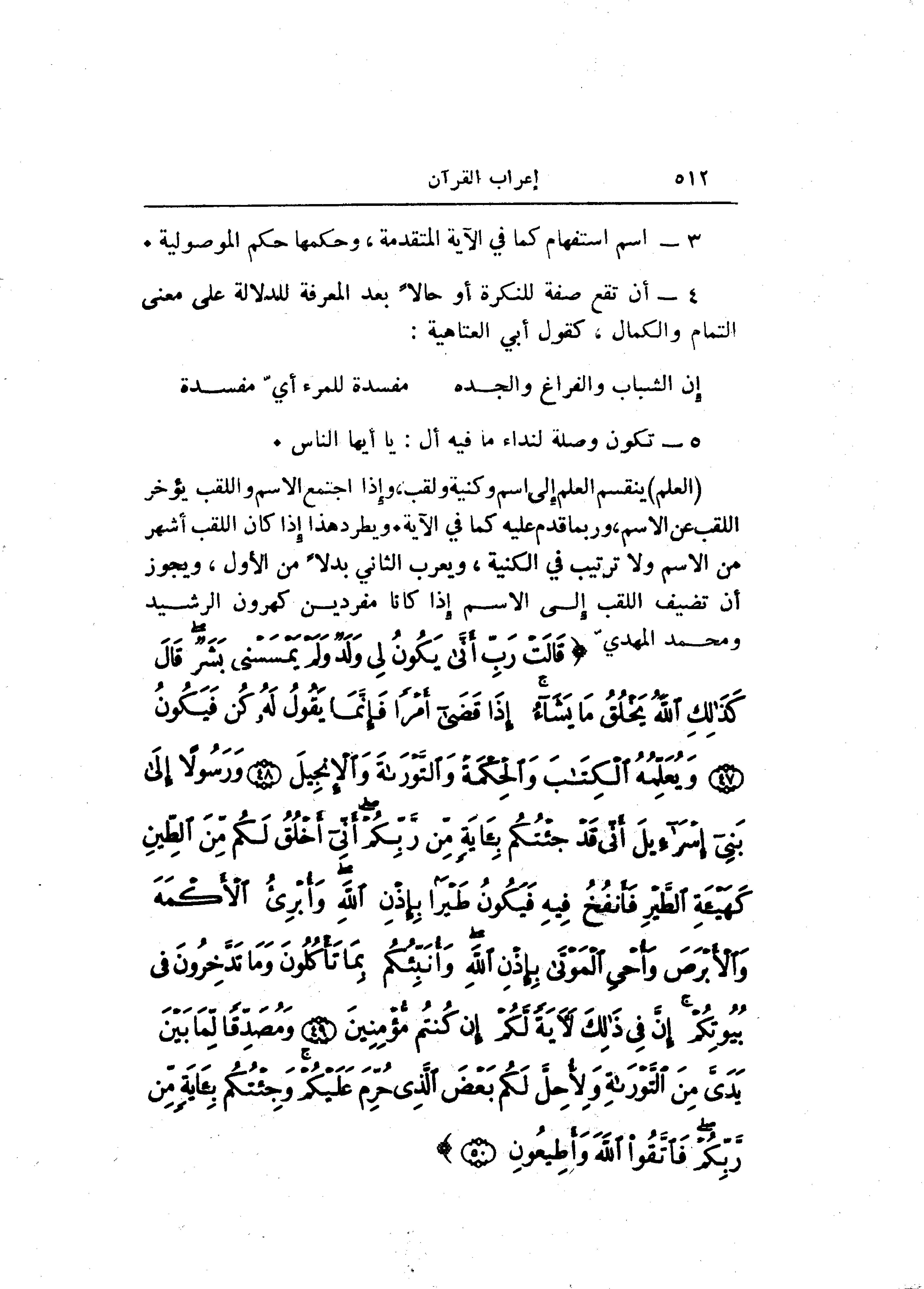 (العلم) ينقسم العلم إلى اسم وكنية ولقب، وإذا اجتمع الاسم واللقب يؤخر اللقب عن الاسم، وربما قدم عليه كما في الآية. ويطرد هذا إذا كان اللقب أشهر من الاسم ولا ترتيب في الكنية، ويعرب الثاني بدلا من الأول، ويجوز أن تضيف اللقب إلى الاسم إذا كانا مفردين كهرون الرشيد ومحمد المهديّ