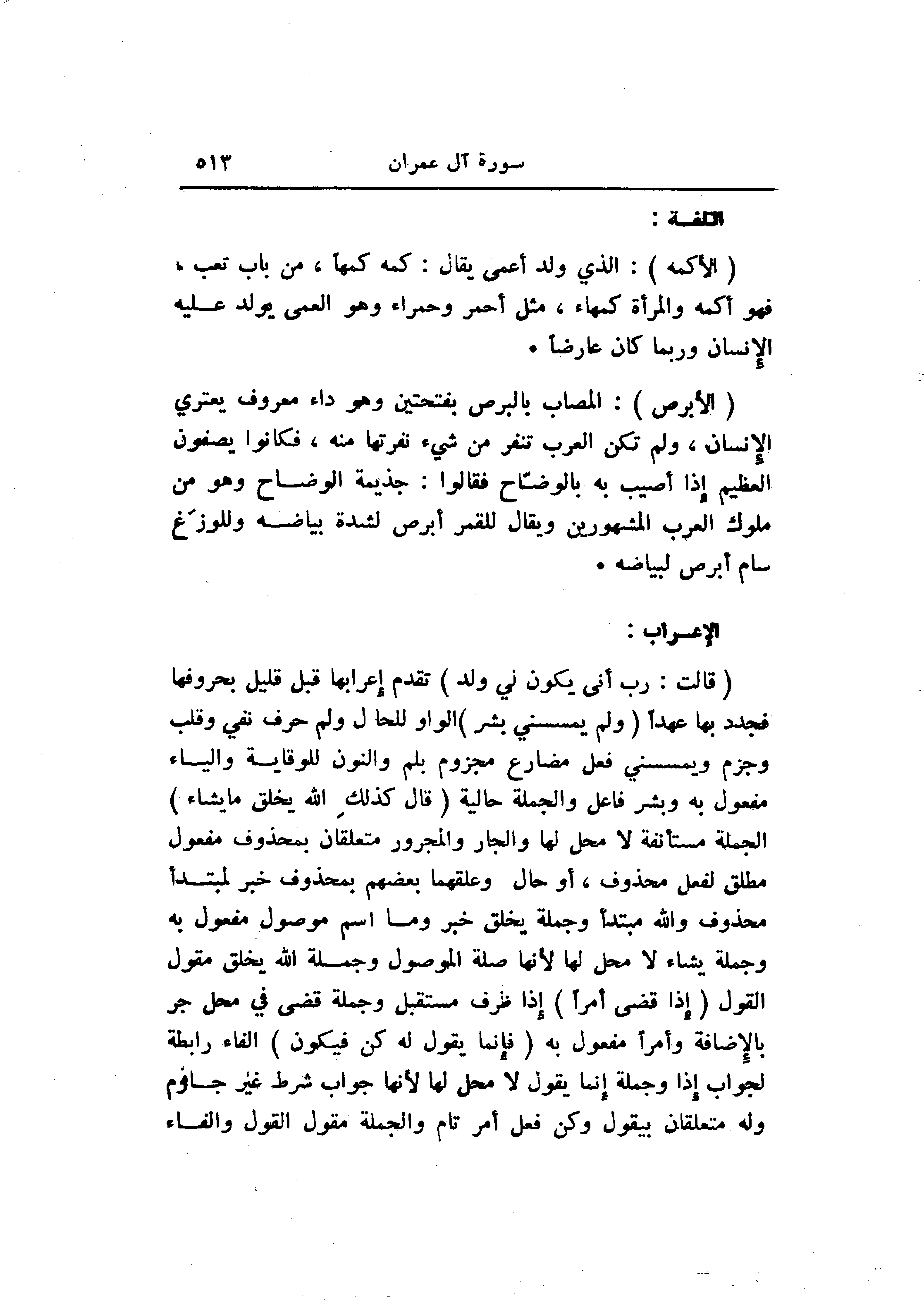 (قالَتْ: رَبِّ أَنَّى يَكُونُ لِي وَلَدٌ) تقدم إعرابها قبل قليل بحروفها فجدد بها عهدا (وَلَمْ يَمْسَسْنِي بَشَرٌ) الواو للحال ولم حرف نفي وقلب وجزم ويمسسني فعل مضارع مجزوم بلم والنون للوقاية والياء مفعول به وبشر فاعل والجملة حالية (قالَ كَذلِكِ اللَّهُ يَخْلُقُ ما يَشاءُ) الجملة مستأنفة لا محل لها والجار والمجرور متعلقان بمحذوف مفعول مطلق لفعل محذوف، أو حال وعلقهما بعضهم بمحذوف خبر لمبتدأ محذوف والله مبتدأ وجملة يخلق خبر وما اسم موصول مفعول به وجملة يشاء لا محل لها لأنها صلة الموصول وجملة الله يخلق مقول القول (إِذا قَضى أَمْراً) إذا ظرف مستقبل وجملة قضى في محل جر بالإضافة وأمرا مفعول به (فَإِنَّما يَقُولُ لَهُ كُنْ فَيَكُونُ) الفاء رابطة لجواب إذا وجملة إنما يقول لا محل لها لأنها جواب شرط غير جازم وله متعلقان بيقول وكن فعل أمر تام والجملة مقول القول والفاء