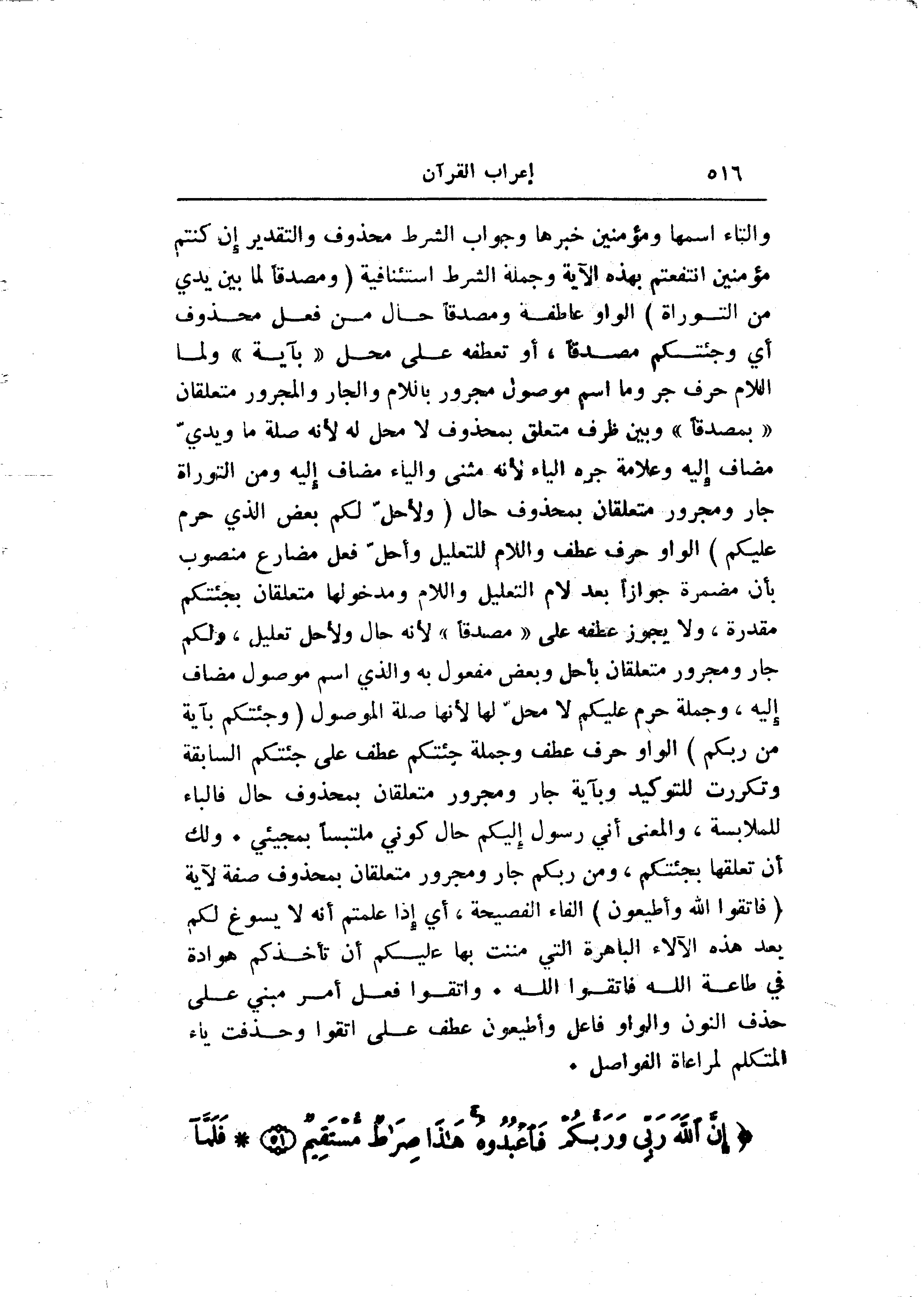 والتاء اسمها ومؤمنين خبرها وجواب الشرط محذوف والتقدير إن كنتم مؤمنين انتفعتم بهذه الآية وجملة الشرط استئنافية (وَمُصَدِّقاً لِما بَيْنَ يَدَيَّ مِنَ التَّوْراةِ) الواو عاطفة ومصدقا حال من فعل محذوف أي وجئتكم مصدقا، أو تعطفه على محل «بآية» ولما اللام حرف جر وما اسم موصول مجرور باللام والجار والمجرور متعلقان «بمصدقا» وبين ظرف متعلق بمحذوف لا محل له لأنه صلة ما ويديّ مضاف إليه وعلامة جره الياء لأنه مثنى والياء مضاف إليه ومن التوراة جار ومجرور متعلقان بمحذوف حال (وَلِأُحِلَّ لَكُمْ بَعْضَ الَّذِي حُرِّمَ عَلَيْكُمْ) الواو حرف عطف واللام للتعليل وأحلّ فعل مضارع منصوب بأن مضمرة جوازا بعد لام التعليل واللام ومدخولها متعلقان بجئتكم مقدرة، ولا يجوز عطفه على «مصدقا» لأنه حال ولأحل تعليل، ولكم جار ومجرور متعلقان بأحل وبعض مفعول به والذي اسم موصول مضاف إليه، وجملة حرم عليكم لا محلّ لها لأنها صلة الموصول (وَجِئْتُكُمْ بِآيَةٍ مِنْ رَبِّكُمْ) الواو حرف عطف وجملة جئتكم عطف على جئتكم السابقة وتكررت للتوكيد وبآية جار ومجرور متعلقان بمحذوف حال فالباء للملابسة، والمعنى أني رسول إليكم حال كوني ملتبسا بمجيئي. ولك أن تعلقها بجئتكم، ومن ربكم جار ومجرور متعلقان بمحذوف صفة لآية (فَاتَّقُوا اللَّهَ وَأَطِيعُونِ) الفاء الفصيحة، أي إذا علمتم أنه لا يسوغ لكم بعد هذه الآلاء الباهرة التي مننت بها عليكم أن تأخذكم هوادة في طاعة الله فاتقوا الله. واتقوا فعل أمر مبني على حذف النون والواو فاعل وأطيعون عطف على اتقوا وحذفت ياء المتكلم لمراعاة الفواصل.