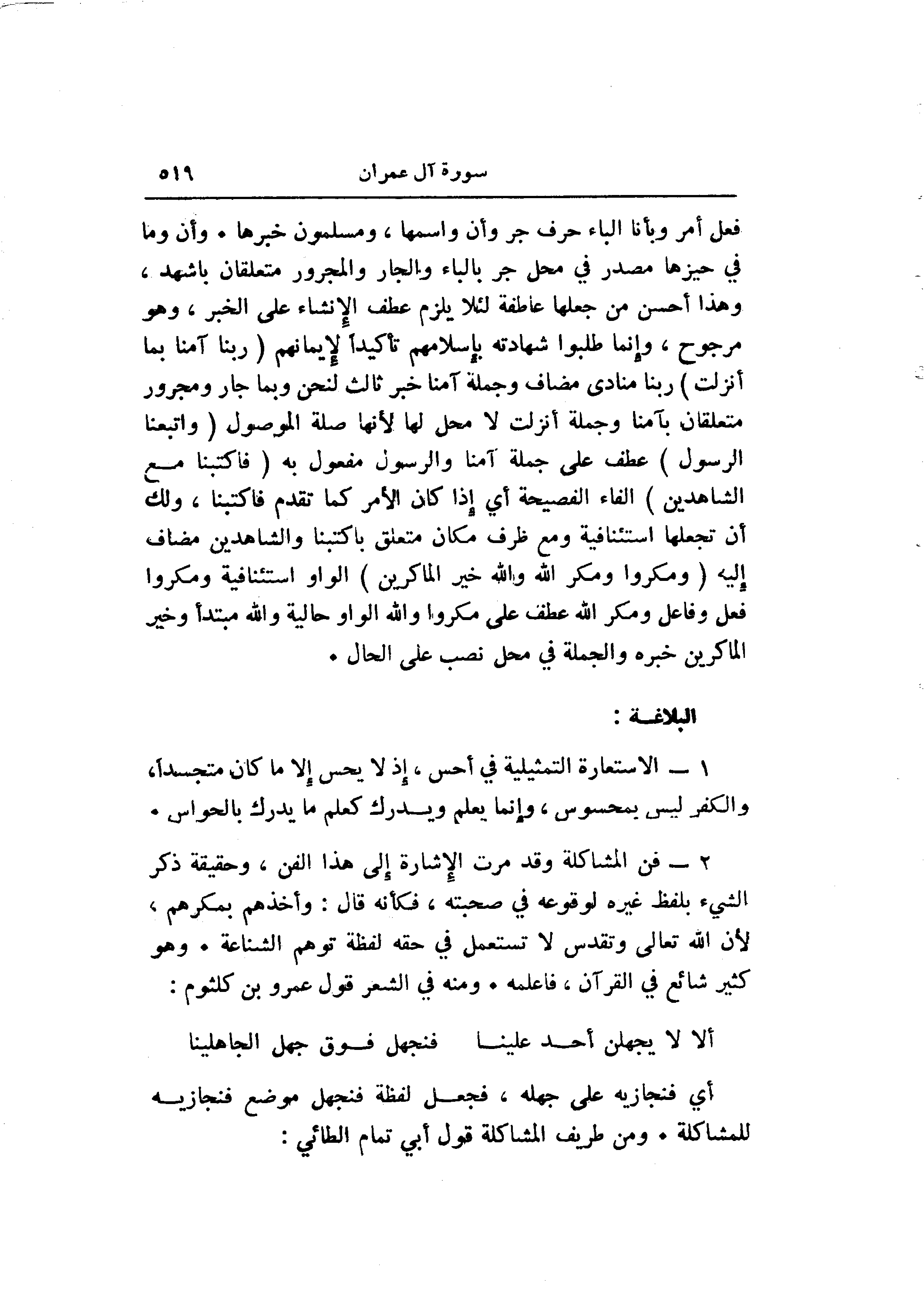 2- فن المشاكلة وقد مرت الإشارة إلى هذا الفن، وحقيقة ذكر الشيء بلفظ غيره لوقوعه في صحبته، فكأنه قال: وأخذهم بمكرهم، لأن الله تعالى وتقدس لا تستعمل في حقه لفظة توهم الشناعة. وهو كثير شائع في القرآن، فاعلمه. ومنه في الشعر قول عمرو بن كلثوم: