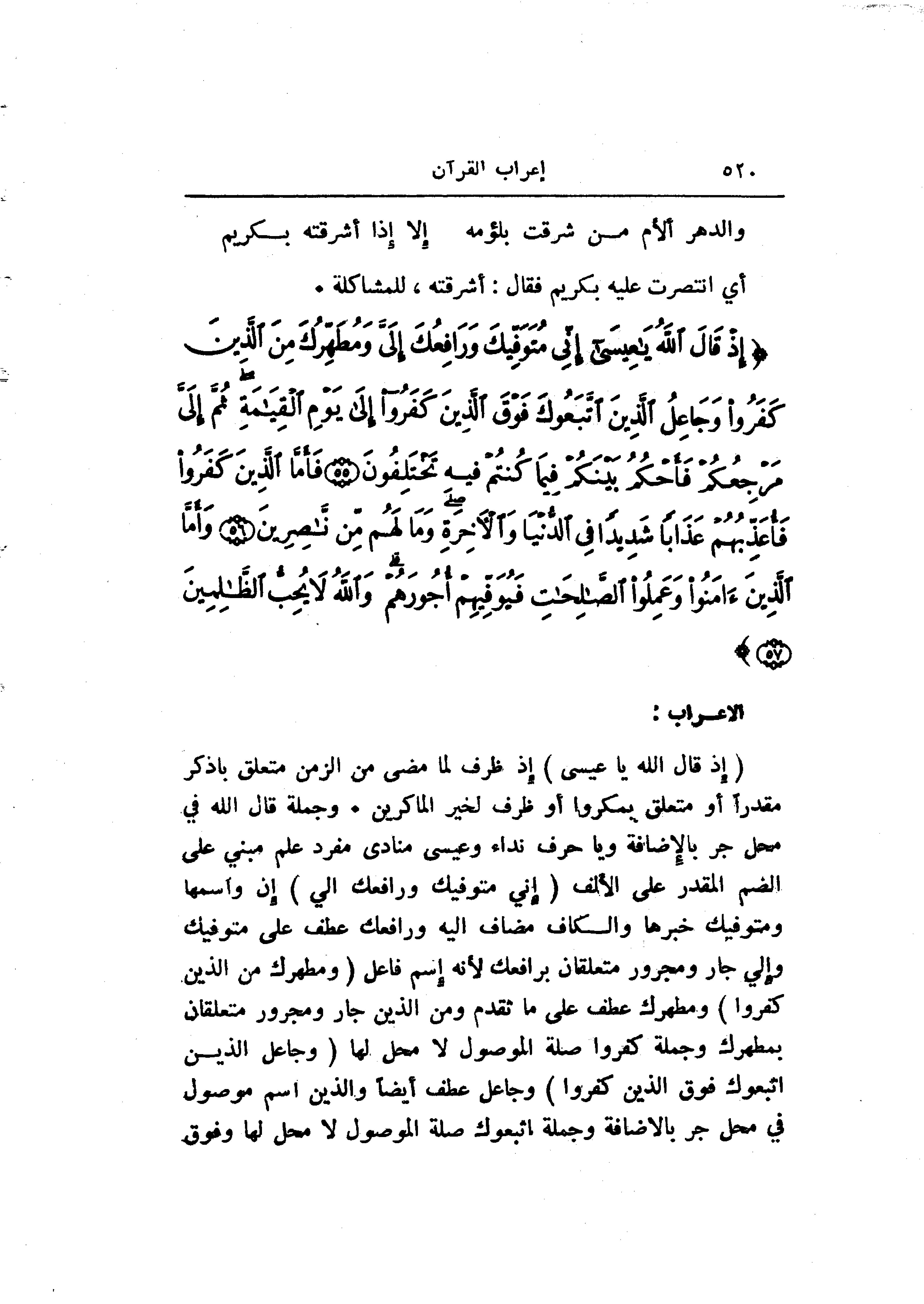 (إِذْ قالَ اللَّهُ يا عِيسى) إذ ظرف لما مضى من الزمن متعلق باذكر مقدرا أو متعلق بمكروا أو ظرف لخير الماكرين. وجملة قال الله في محل جر بالإضافة ويا حرف نداء وعيسى منادى مفرد علم مبني على الضم المقدر على الألف (إِنِّي مُتَوَفِّيكَ وَرافِعُكَ إِلَيَّ) إن واسمها ومتوفيك خبرها والكاف مضاف اليه ورافعك عطف على متوفيك وإلي جار ومجرور متعلقان برافعك لأنه اسم فاعل (وَمُطَهِّرُكَ مِنَ الَّذِينَ كَفَرُوا) ومطهرك عطف على ما تقدم ومن الذين جار ومجرور متعلقان بمطهرك وجملة كفروا صلة الموصول لا محل لها (وَجاعِلُ الَّذِينَ اتَّبَعُوكَ فَوْقَ الَّذِينَ كَفَرُوا) وجاعل عطف أيضا والذين اسم موصول في محل جر بالاضافة وجملة اتبعوك صلة الموصول لا محل لها وفوق