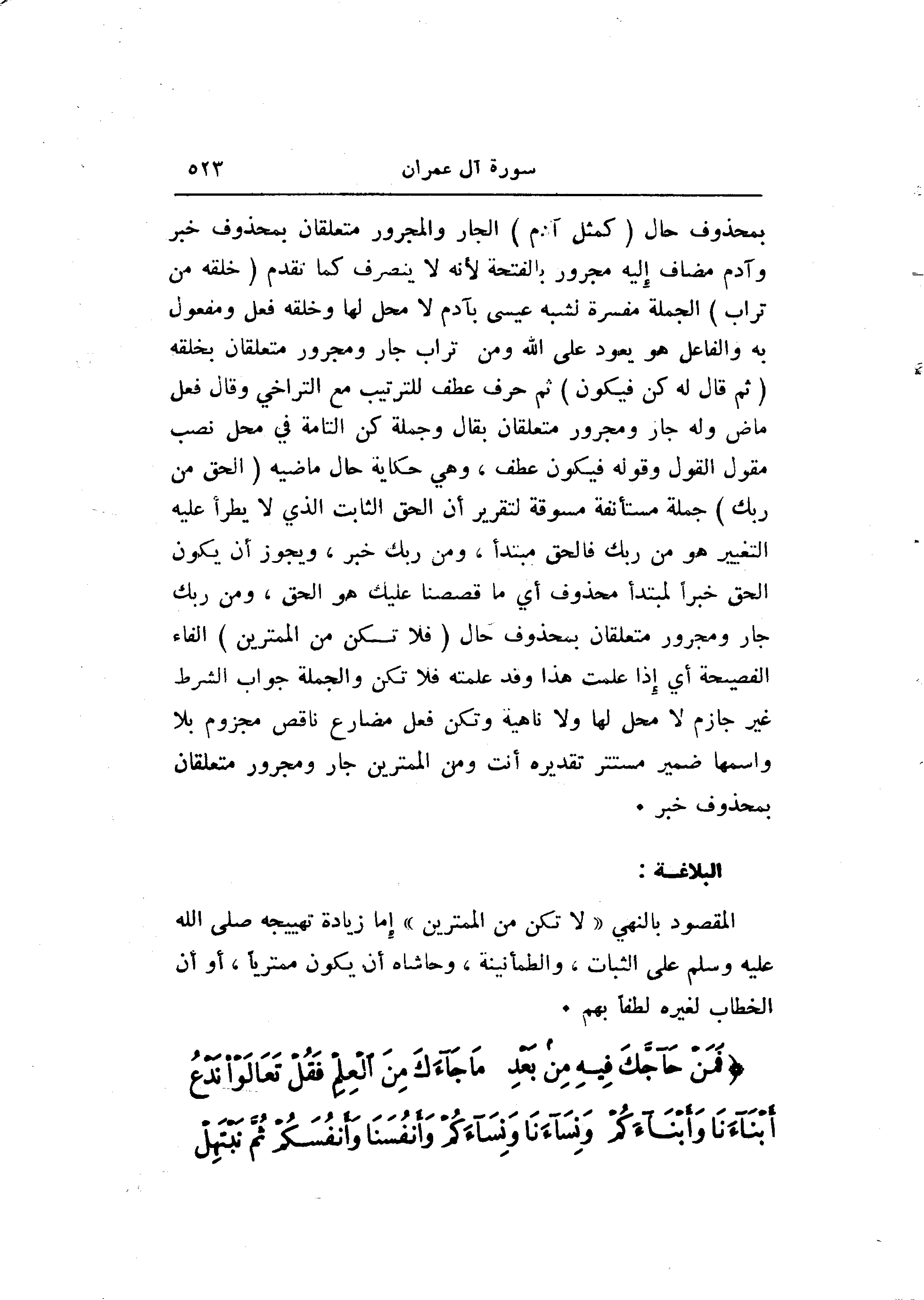 بمحذوف حال (كَمَثَلِ آدَمَ) الجار والمجرور متعلقان بمحذوف خبر وآدم مضاف إليه مجرور بالفتحة لأنه لا ينصرف كما تقدم (خَلَقَهُ مِنْ تُرابٍ) الجملة مفسرة لشبه عيسى بآدم لا محل لها وخلقه فعل ومفعول به والفاعل هو يعود على الله ومن تراب جار ومجرور متعلقان بخلقه (ثُمَّ قالَ لَهُ كُنْ فَيَكُونُ) ثم حرف عطف للترتيب مع التراخي وقال فعل ماض وله جار ومجرور متعلقان بقال وجملة كن التامة في محل نصب مقول القول وقوله فيكون عطف، وهي حكاية حال ماضيه (الْحَقُّ مِنْ رَبِّكَ) جملة مستأنفة مسوقة لتقرير أن الحق الثابت الذي لا يطرأ عليه التغيير هو من ربك فالحق مبتدأ، ومن ربك خبر، ويجوز أن يكون الحق خبرا لمبتدأ محذوف أي ما قصصنا عليك هو الحق، ومن ربك جار ومجرور متعلقان بمحذوف حال (فَلا تَكُنْ مِنَ الْمُمْتَرِينَ) الفاء الفصيحة أي إذا علمت هذا وقد علمته فلا تكن والجملة جواب الشرط غير جازم لا محل لها ولا ناهية وتكن فعل مضارع ناقص مجزوم بلا واسمها ضمير مستتر تقديره أنت ومن الممترين جار ومجرور متعلقان بمحذوف خبر.