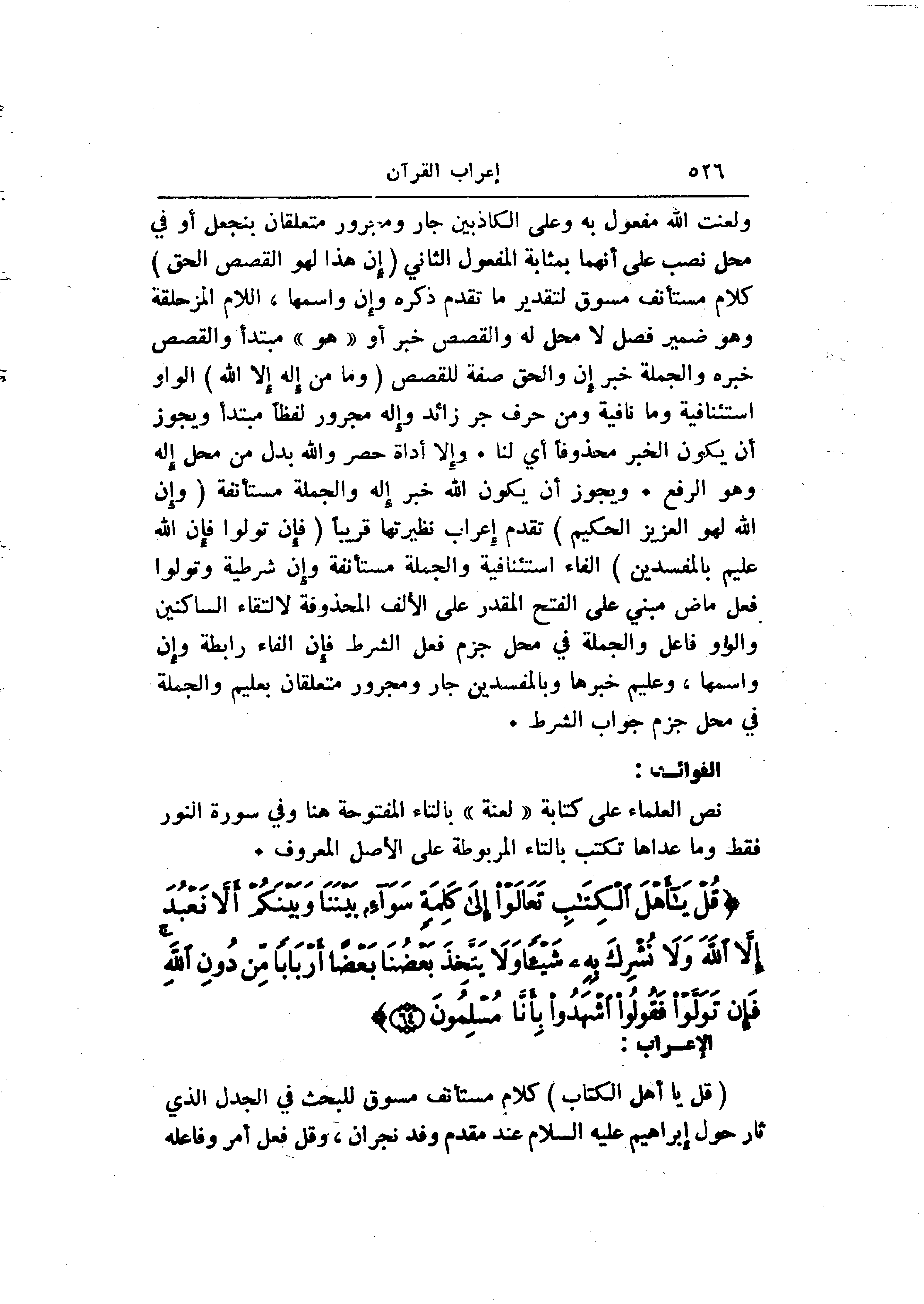 ولعنت الله مفعول به وعلى الكاذبين جار ومجرور متعلقان بنجعل أو في محل نصب على أنهما بمثابة المفعول الثاني (إِنَّ هذا لَهُوَ الْقَصَصُ الْحَقُّ) كلام مستأنف مسوق لتقدير ما تقدم ذكره وإن واسمها، اللام المزحلقة وهو ضمير فصل لا محل له والقصص خبر أو «هو» مبتدأ والقصص خبره والجملة خبر إن والحق صفة للقصص (وَما مِنْ إِلهٍ إِلَّا اللَّهُ) الواو استئنافية وما نافية ومن حرف جر زائد وإله مجرور لفظا مبتدأ ويجوز أن يكون الخبر محذوفا أي لنا. وإلا أداة حصر والله بدل من محل إله وهو الرفع. ويجوز أن يكون الله خبر إله والجملة مستأنفة (وَإِنَّ اللَّهَ لَهُوَ الْعَزِيزُ الْحَكِيمُ) تقدم إعراب نظيرتها قريبا (فَإِنْ تَوَلَّوْا فَإِنَّ اللَّهَ عَلِيمٌ بِالْمُفْسِدِينَ) الفاء استئنافية والجملة مستأنفة وإن شرطية وتولوا فعل ماض مبني على الفتح المقدر على الألف المحذوفة لالتقاء الساكنين والواو فاعل والجملة في محل جزم فعل الشرط فإن الفاء رابطة وإن واسمها، وعليم خبرها وبالمفسدين جار ومجرور متعلقان بعليم والجملة في محل جزم جواب الشرط.