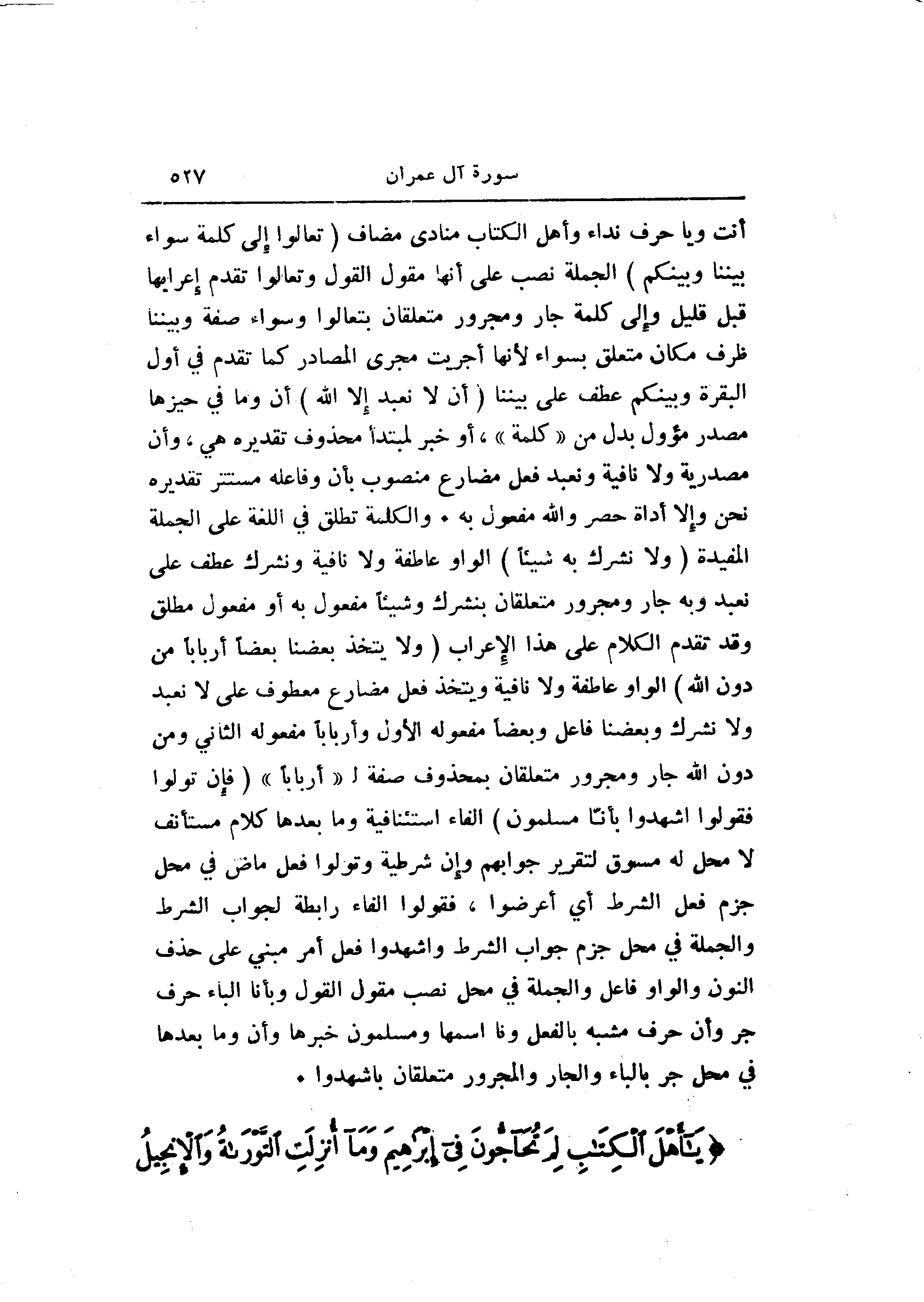 أنت ويا حرف نداء وأهل الكتاب منادى مضاف (تَعالَوْا إِلى كَلِمَةٍ سَواءٍ بَيْنَنا وَبَيْنَكُمْ) الجملة نصب على أنها مقول القول وتعالوا تقدم إعرابها قبل قليل وإلى كلمة جار ومجرور متعلقان بتعالوا وسواء صفة وبيننا ظرف مكان متعلق بسواء لأنها أجريت مجرى المصادر كما تقدم في أول البقرة وبينكم عطف على بيننا (أَلَّا نَعْبُدَ إِلَّا اللَّهَ) أن وما في حيزها مصدر مؤول بدل من «كلمة» ، أو خبر لمبتدأ محذوف تقديره هي، وأن مصدرية ولا نافية ونعبد فعل مضارع منصوب بأن وفاعله مستتر تقديره نحن وإلا أداة حصر والله مفعول به. والكلمة تطلق في اللغة على الجملة المفيدة (وَلا نُشْرِكَ بِهِ شَيْئاً) الواو عاطفة ولا نافية ونشرك عطف على نعبد وبه جار ومجرور متعلقان بنشرك وشيئا مفعول به أو مفعول مطلق وقد تقدم الكلام على هذا الإعراب (وَلا يَتَّخِذَ بَعْضُنا بَعْضاً أَرْباباً مِنْ دُونِ اللَّهِ) الواو عاطفة ولا نافية ويتخذ فعل مضارع معطوف على لا نعبد ولا نشرك وبعضنا فاعل وبعضا مفعوله الأول وأربابا مفعوله الثاني ومن دون الله جار ومجرور متعلقان بمحذوف صفة ل «أربابا» (فَإِنْ تَوَلَّوْا فَقُولُوا اشْهَدُوا بِأَنَّا مُسْلِمُونَ) الفاء استئنافية وما بعدها كلام مستأنف لا محل له مسوق لتقرير جوابهم وإن شرطية وتولوا فعل ماض في محل جزم فعل الشرط أي أعرضوا، فقولوا الفاء رابطة لجواب الشرط والجملة في محل جزم جواب الشرط واشهدوا فعل أمر مبني على حذف النون والواو فاعل والجملة في محل نصب مقول القول وبأنا الباء حرف جر وأن حرف مشبه بالفعل ونا اسمها ومسلمون خبرها وأن وما بعدها في محل جر بالباء والجار والمجرور متعلقان باشهدوا.