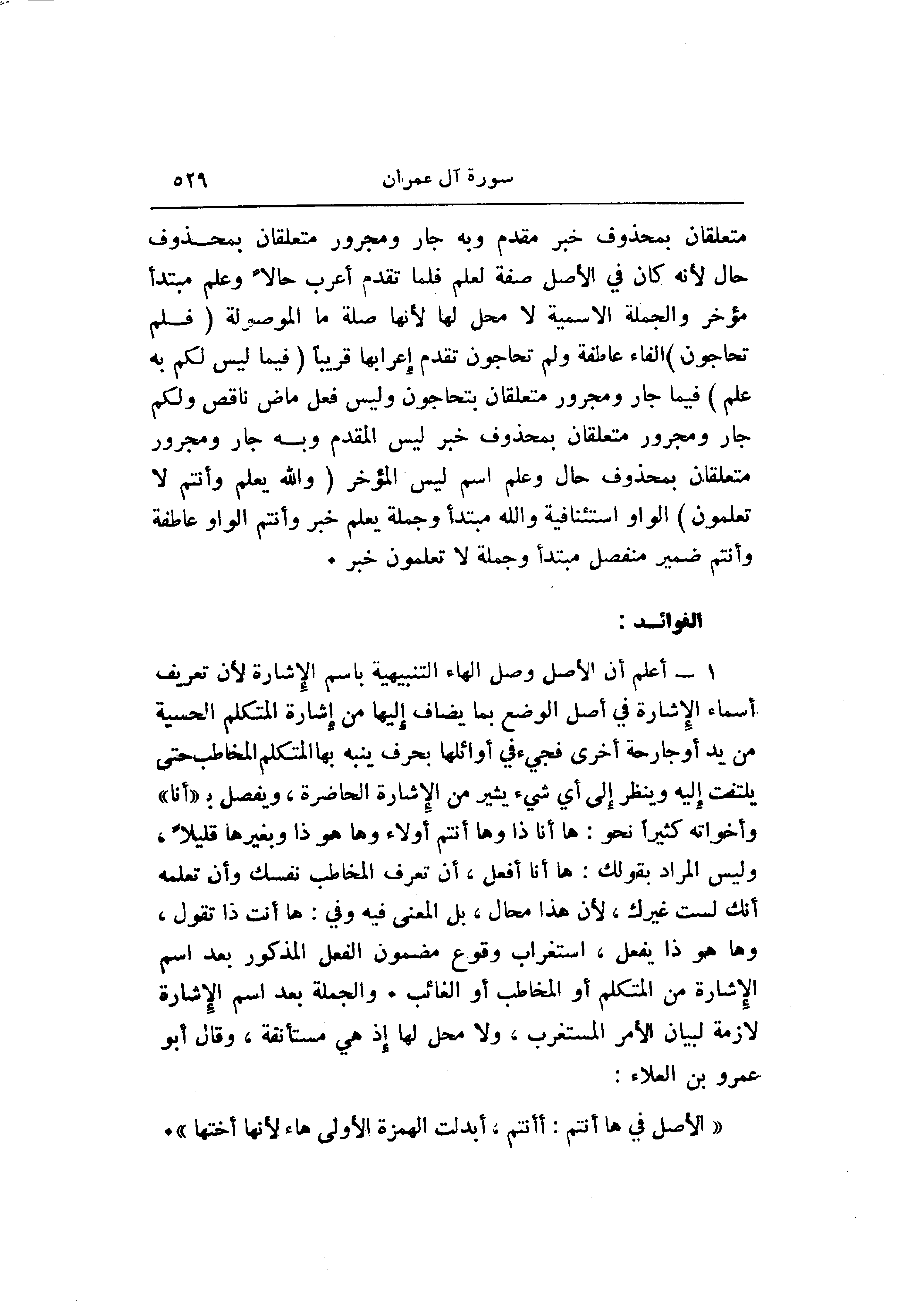1- أعلم أن الأصل وصل الهاء التنبيهية باسم الإشارة لأن تعريف أسماء الإشارة في أصل الوضع بما يضاف إليها من إشارة المتكلم الحسية من يد أو جارحة أخرى فجيء في أوائلها بحرف ينبه بها المتكلم المخاطب حتى يلتفت إليه وينظر إلى أي شيء يشير من الإشارة الحاضرة، ويفصل ب «أنا» وأخواته كثيرا نحو: ها أنا ذا وها أنتم أولاء وها هو ذا وبغيرها قليلا، وليس المراد بقولك: ها أنا أفعل، أن تعرف المخاطب نفسك وأن تعلمه أنك لست غيرك، لأن هذا محال، بل المعنى فيه وفي: ها أنت ذا تقول، وها هو ذا يفعل، استغراب وقوع مضمون الفعل المذكور بعد اسم الإشارة من المتكلم أو المخاطب أو الغائب. والجملة بعد اسم الإشارة لازمة لبيان الأمر المستغرب، ولا محل لها إذ هي مستأنفة، وقال أبو عمرو بن العلاء: