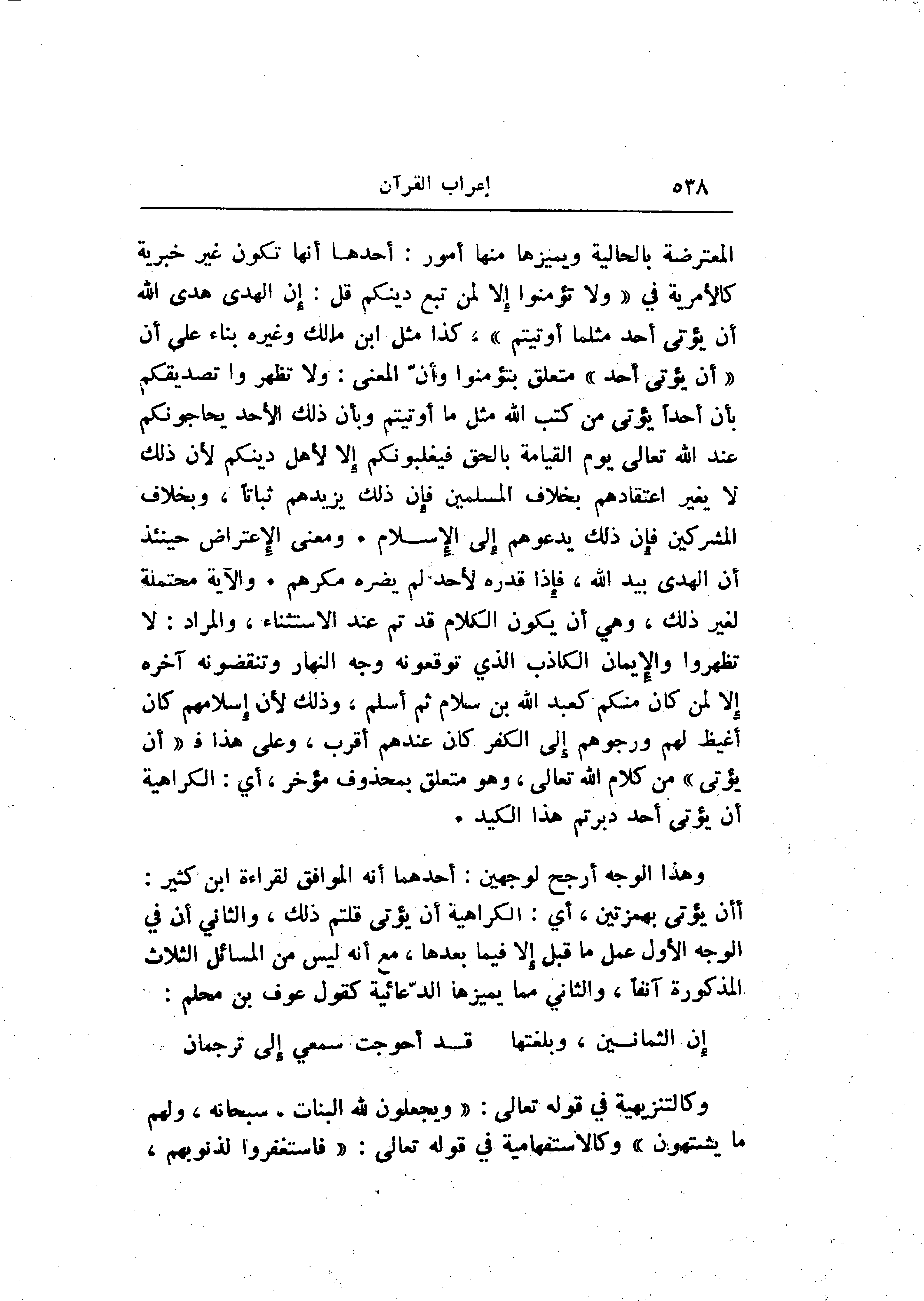المعترضة بالحالية ويميزها منها أمور: أحدها أنها تكون غير خبرية كالأمرية في «ولا تؤمنوا إلا لمن تبع دينكم قل: إن الهدى هدى الله أن يؤتى أحد مثلما أوتيتم» ، كذا مثل ابن مالك وغيره بناء على أن «أن يؤتى أحد» متعلق بتؤمنوا وأنّ المعنى: ولا تظهروا تصديقكم بأن أحدا يؤتى من كتب الله مثل ما أوتيتم وبأن ذلك الأحد يحاجونكم عند الله تعالى يوم القيامة بالحق فيغلبونكم إلا لأهل دينكم لأن ذلك لا يغير اعتقادهم بخلاف المسلمين فإن ذلك يزيدهم ثباتا، وبخلاف المشركين فإن ذلك يدعوهم إلى الإسلام. ومعنى الاعتراض حينئذ أن الهدى بيد الله، فإذا قدره لأحد لم يضره مكرهم. والآية محتملة لغير ذلك، وهي أن يكون الكلام قد تم عند الاستثناء، والمراد: لا تظهروا والإيمان الكاذب الذي توقعونه وجه النهار وتنقضونه آخره إلا لمن كان منكم كعبد الله بن سلام ثم أسلم، وذلك لأن إسلامهم كان أغيظ لهم ورجوهم إلى الكفر كان عندهم أقرب، وعلى هذا ف «أن يؤتى» من كلام الله تعالى، وهو متعلق بمحذوف مؤخر، أي: الكراهية أن يؤتى أحد دبرتم هذا الكيد.