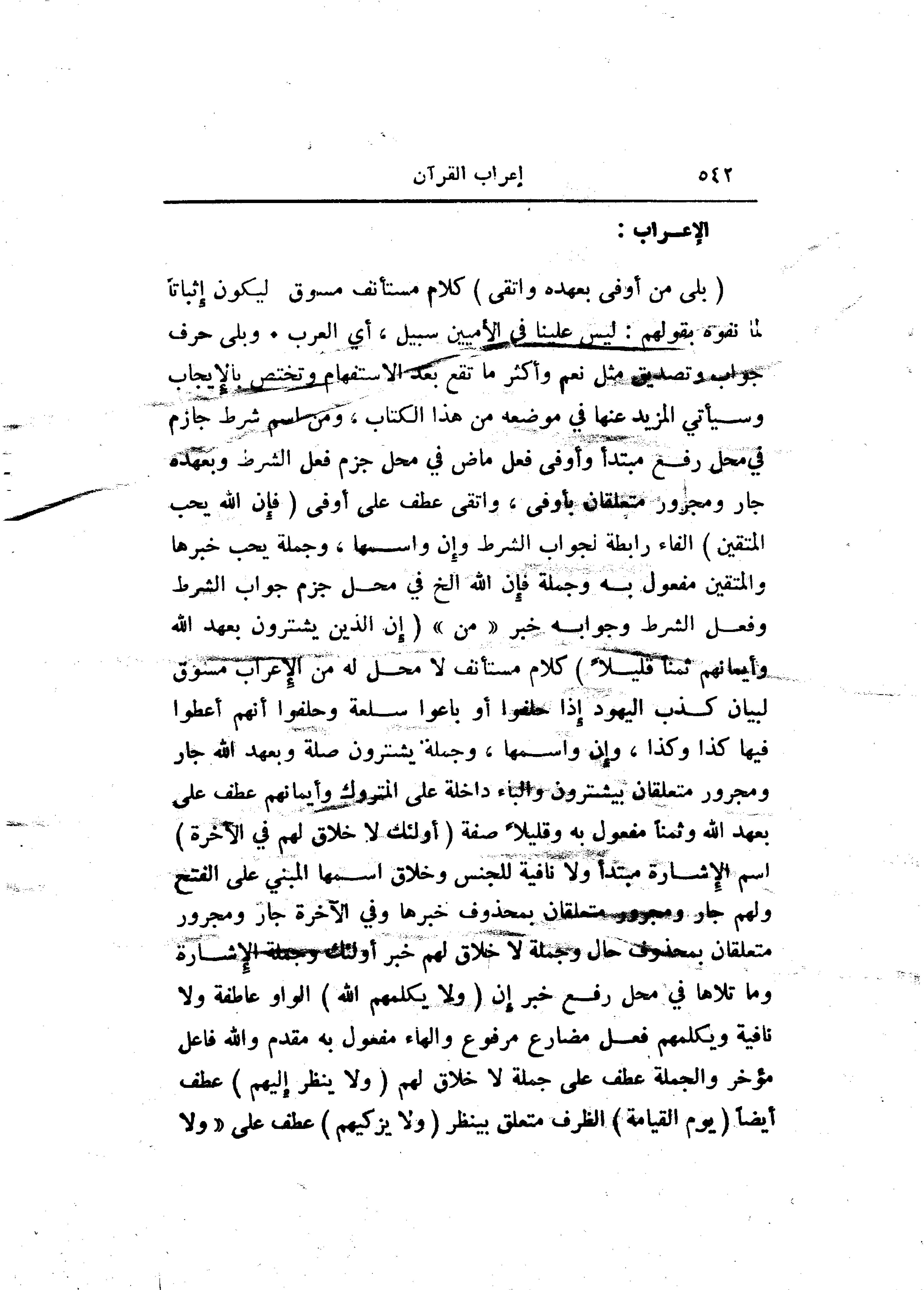 (بَلى مَنْ أَوْفى بِعَهْدِهِ وَاتَّقى) كلام مستأنف مسوق ليكون إثباتا لما نفوه بقولهم: ليس علينا في الأميين سبيل، أي العرب. وبلى حرف جواب وتصديق مثل نعم وأكثر ما تقع بعد الاستفهام وتختص بالإيجاب وسيأتي المزيد عنها في موضعه من هذا الكتاب، ومن اسم شرط جازم في محل رفع مبتدأ وأوفى فعل ماض في محل جزم فعل الشرط وبعهده جار ومجرور متعلقان بأوفى، واتقى عطف على أوفى (فَإِنَّ اللَّهَ يُحِبُّ الْمُتَّقِينَ) الفاء رابطة لجواب الشرط وإن واسمها، وجملة يحب خبرها والمتقين مفعول به وجملة فإن الله إلخ في محل جزم جواب الشرط وفعل الشرط وجوابه خبر «من» (إِنَّ الَّذِينَ يَشْتَرُونَ بِعَهْدِ اللَّهِ وَأَيْمانِهِمْ ثَمَناً قَلِيلًا) كلام مستأنف لا محل له من الإعراب مسوق لبيان كذب اليهود إذا حلفوا أو باعوا سلعة وحلفوا أنهم أعطوا فيها كذا وكذا، وإن واسمها، وجملة يشترون صلة وبعهد الله جار ومجرور متعلقان بيشترون والباء داخلة على المتروك وأيمانهم عطف على بعهد الله وثمنا مفعول به وقليلا صفة (أُولئِكَ لا خَلاقَ لَهُمْ فِي الْآخِرَةِ) اسم الإشارة مبتدأ ولا نافية للجنس وخلاق اسمها المبني على الفتح ولهم جار ومجرور متعلقان بمحذوف خبرها وفي الآخرة جار ومجرور متعلقان بمحذوف حال وجملة لا خلاق لهم خبر أولئك وجملة الإشارة وما تلاها في محل رفع خبر إن (وَلا يُكَلِّمُهُمُ اللَّهُ) الواو عاطفة ولا نافية ويكلمهم فعل مضارع مرفوع والهاء مفعول به مقدم والله فاعل مؤخر والجملة عطف على جملة لا خلاق لهم (وَلا يَنْظُرُ إِلَيْهِمْ) عطف أيضا (يَوْمَ الْقِيامَةِ) الظرف متعلق بينظر (وَلا يُزَكِّيهِمْ) عطف على «ولا