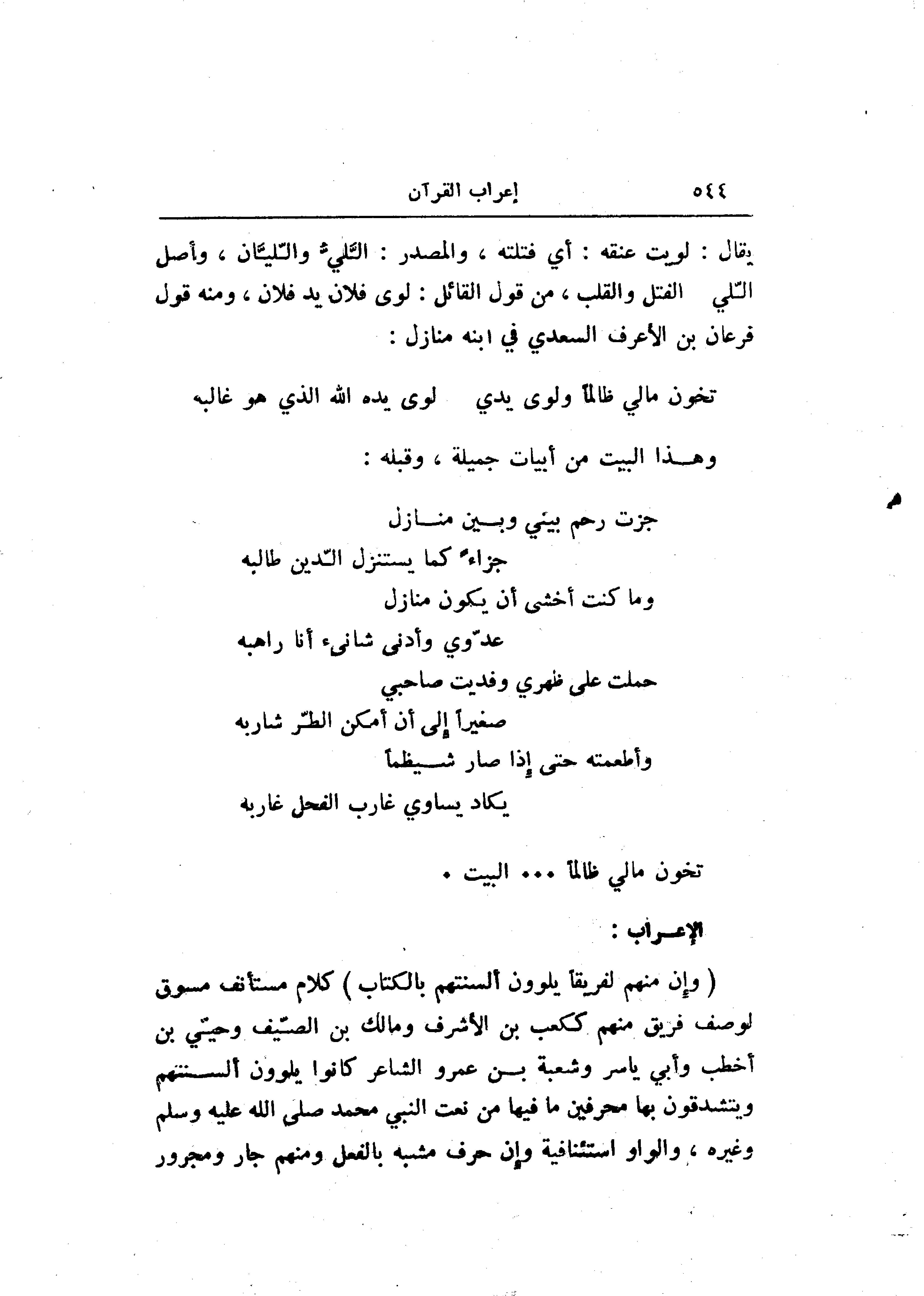 يقال: لويت عنقه: أي فتلته، والمصدر: اللّيّ واللّيّان، وأصل اللّي الفتل والقلب، من قول القائل: لوى فلان يد فلان، ومنه قول فرعان بن الأعرف السعدي في ابنه منازل: