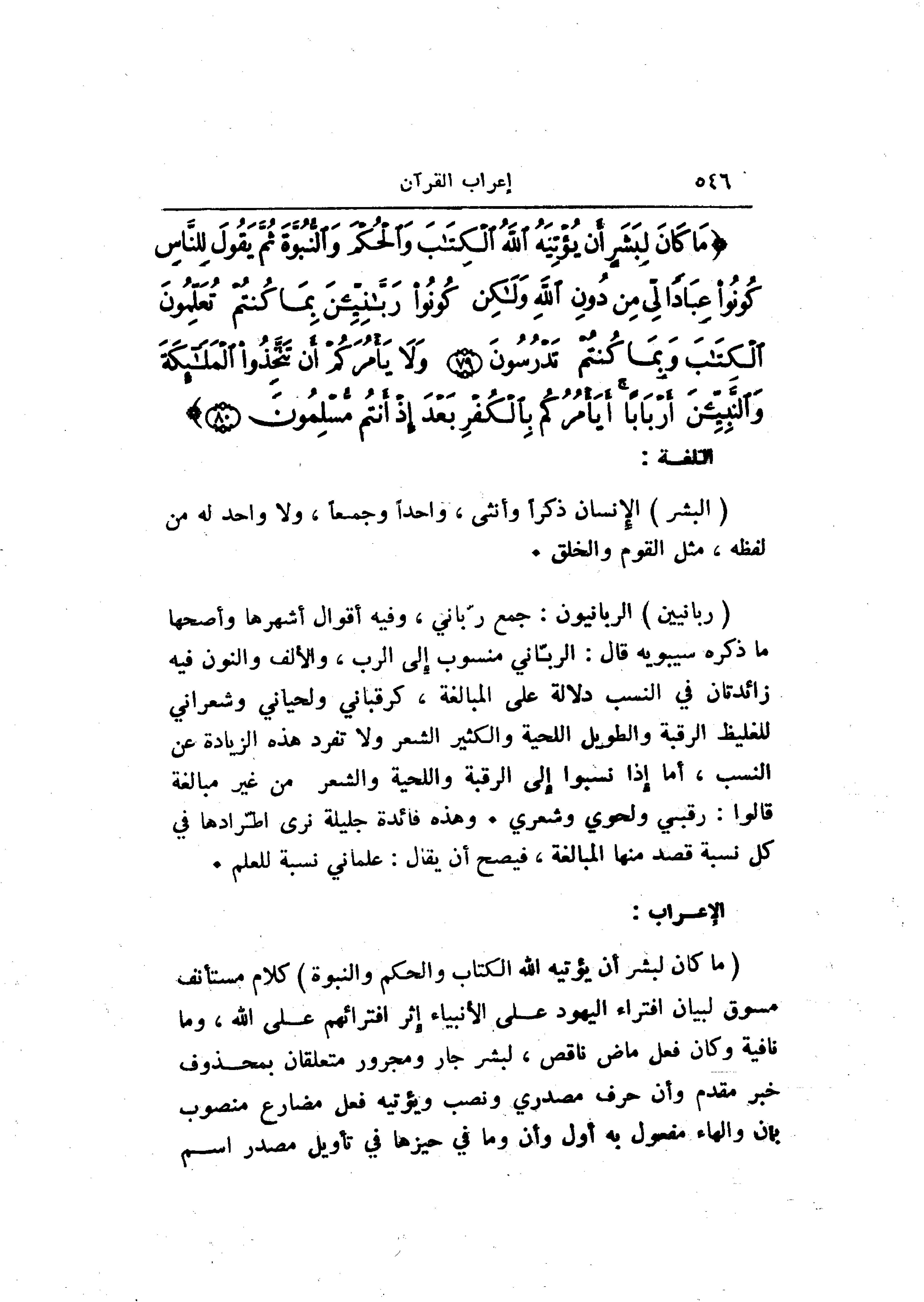 (رَبَّانِيِّينَ) الربانيون: جمع ربّاني، وفيه أقوال أشهرها وأصحها ما ذكره سيبويه قال: الربّاني منسوب إلى الرب، والألف والنون فيه زائدتان في النسب دلالة على المبالغة، كرقباني ولحياني وشعراني للغليظ الرقبة والطويل اللحية والكثير الشعر ولا تفرد هذه الزيادة عن النسب، أما إذا نسبوا إلى الرقبة واللحية والشعر من غير مبالغة قالوا: رقبي ولحوي وشعري. وهذه فائدة جليلة نرى اطّرادها في كل نسبة قصد منها المبالغة، فيصح أن يقال: علماني نسبة للعلم.