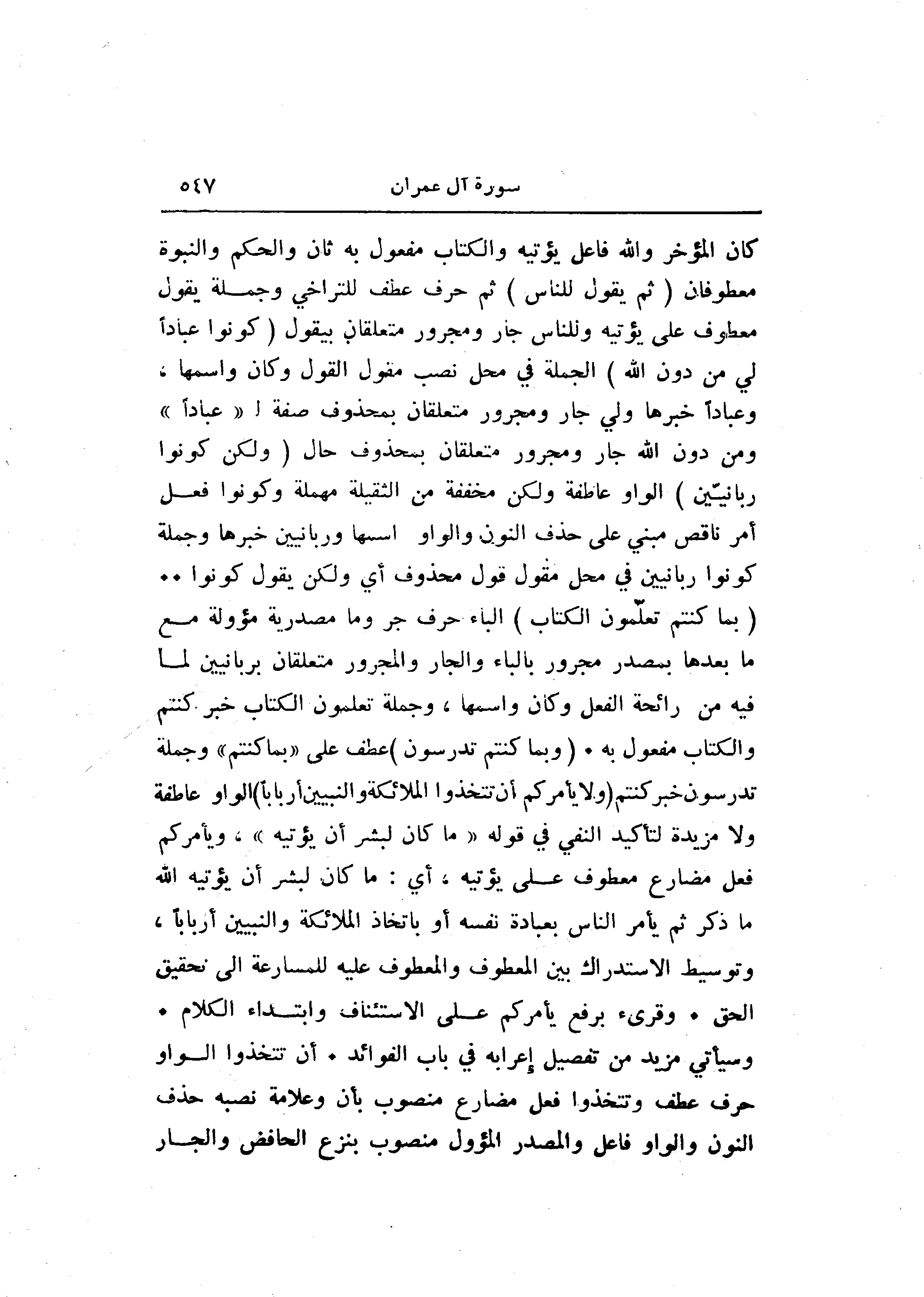 (بِما كُنْتُمْ تُعَلِّمُونَ الْكِتابَ) الباء حرف جر وما مصدرية مؤولة مع ما بعدها بمصدر مجرور بالباء والجار والمجرور متعلقان بربانيين لما فيه من رائحة الفعل وكان واسمها، وجملة تعلمون الكتاب خبر كنتم والكتاب مفعول به. (وَبِما كُنْتُمْ تَدْرُسُونَ) عطف على «بما كنتم» وجملة تدرسون خبر كنتم (وَلا يَأْمُرَكُمْ أَنْ تَتَّخِذُوا الْمَلائِكَةَ وَالنَّبِيِّينَ أَرْباباً) الواو عاطفة ولا مزيدة لتأكيد النفي في قوله «ما كان لبشر أن يؤتيه» ، ويأمركم فعل مضارع معطوف على يؤتيه، أي: ما كان لبشر أن يؤتيه الله ما ذكر ثم يأمر الناس بعبادة نفسه أو باتخاذ الملائكة والنبيين أربابا، وتوسيط الاستدراك بين المعطوف والمعطوف عليه للمسارعة الى تحقيق الحق. وقرىء برفع يأمركم على الاستئناف وابتداء الكلام.