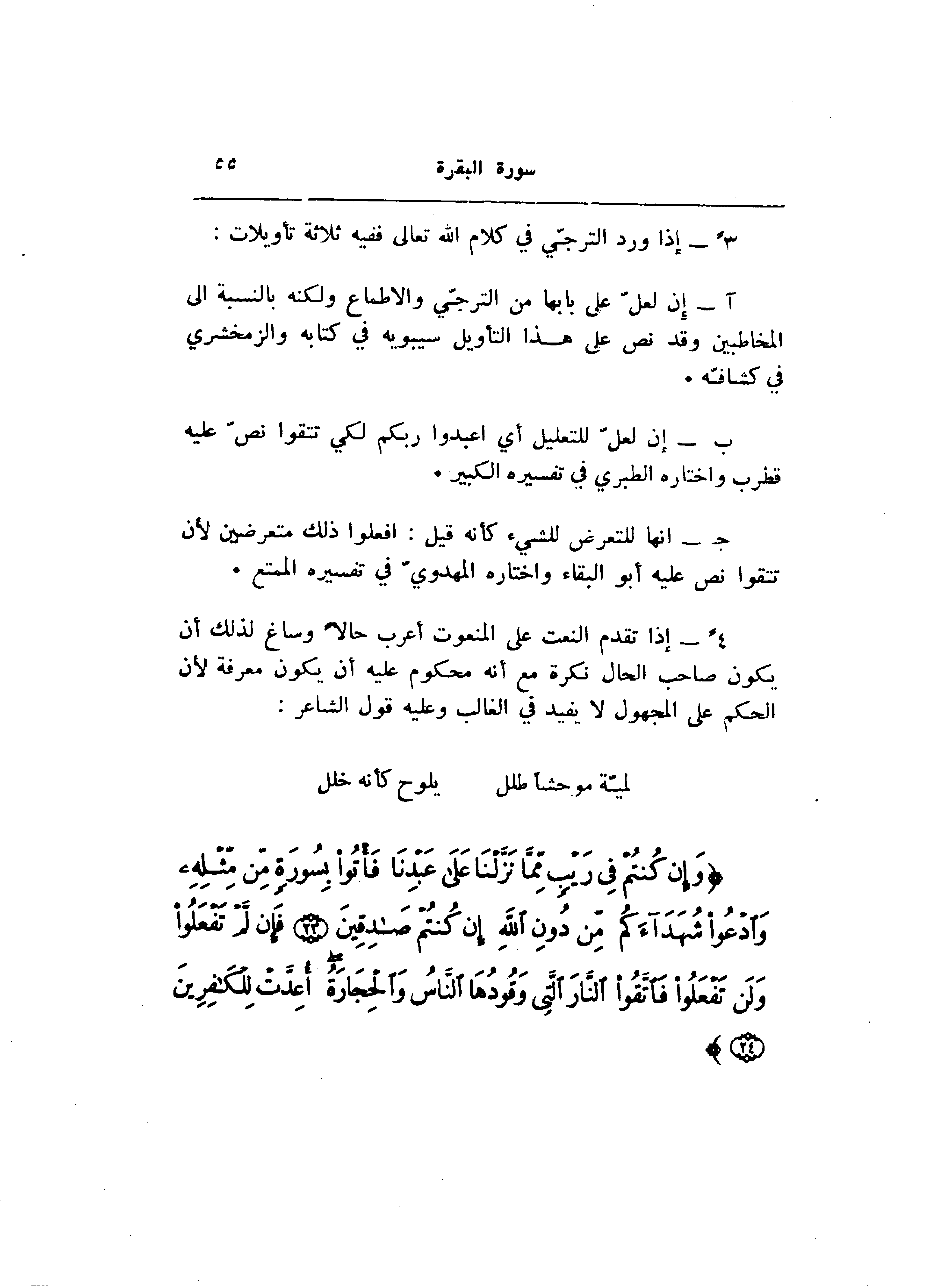 ب- إن لعلّ للتعليل أي اعبدوا ربكم لكي تتقوا نصّ عليه قطرب واختاره الطبري في تفسيره الكبير.