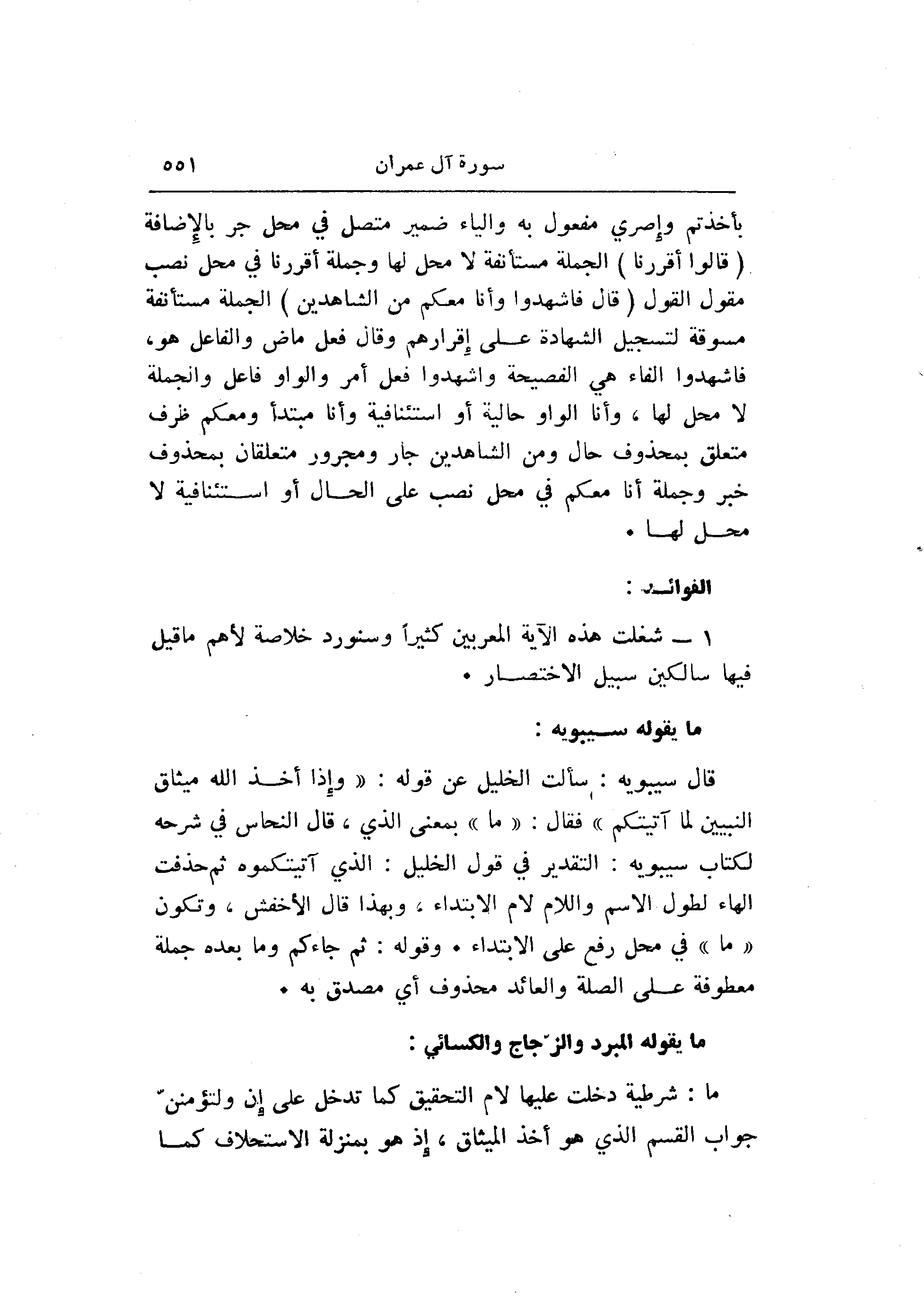 قال سيبويه: سألت الخليل عن قوله: «وإذا أخذ الله ميثاق النبيين لما آتيتكم» فقال: «ما» بمعنى الذي، قال النحاس في شرحه لكتاب سيبويه: التقدير في قول الخليل: الذي آتيتكموه ثم حذفت الهاء لطول الاسم واللام لام الابتداء، وبهذا قال الأخفش، وتكون «ما» في محل رفع على الابتداء. وقوله: ثم جاءكم وما بعده جملة معطوفة على الصلة والعائد محذوف أي مصدق به.