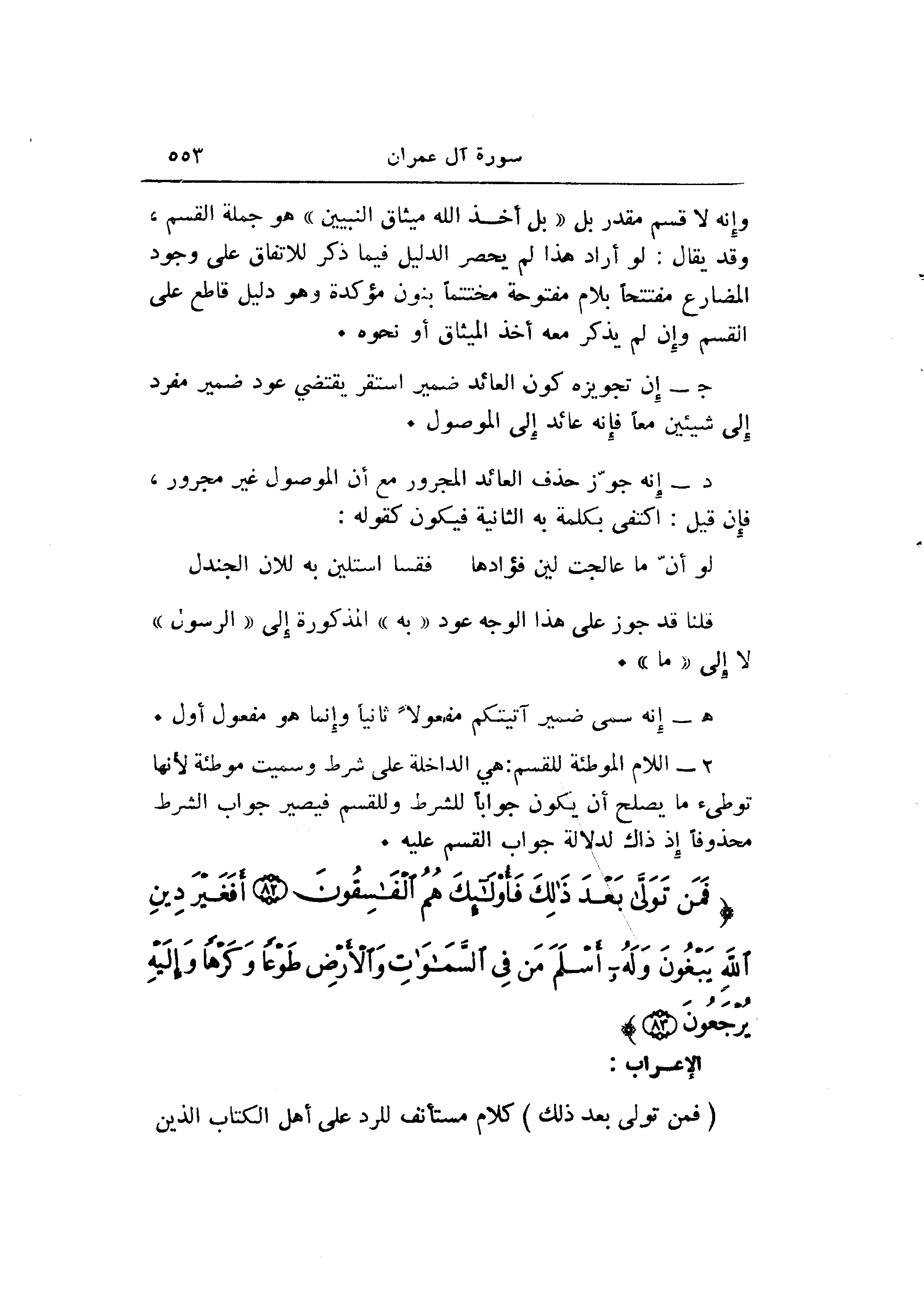 وإنه لا قسم مقدر بل «بل أخذ الله ميثاق النبيين» هو جملة القسم، وقد يقال: لو أراد هذا لم يحصر الدليل فيما ذكر للاتفاق على وجود المضارع مفتتحا بلام مفتوحة مختتما بنون مؤكدة وهو دليل قاطع على القسم وإن لم يذكر معه أخذ الميثاق أو نحوه.
