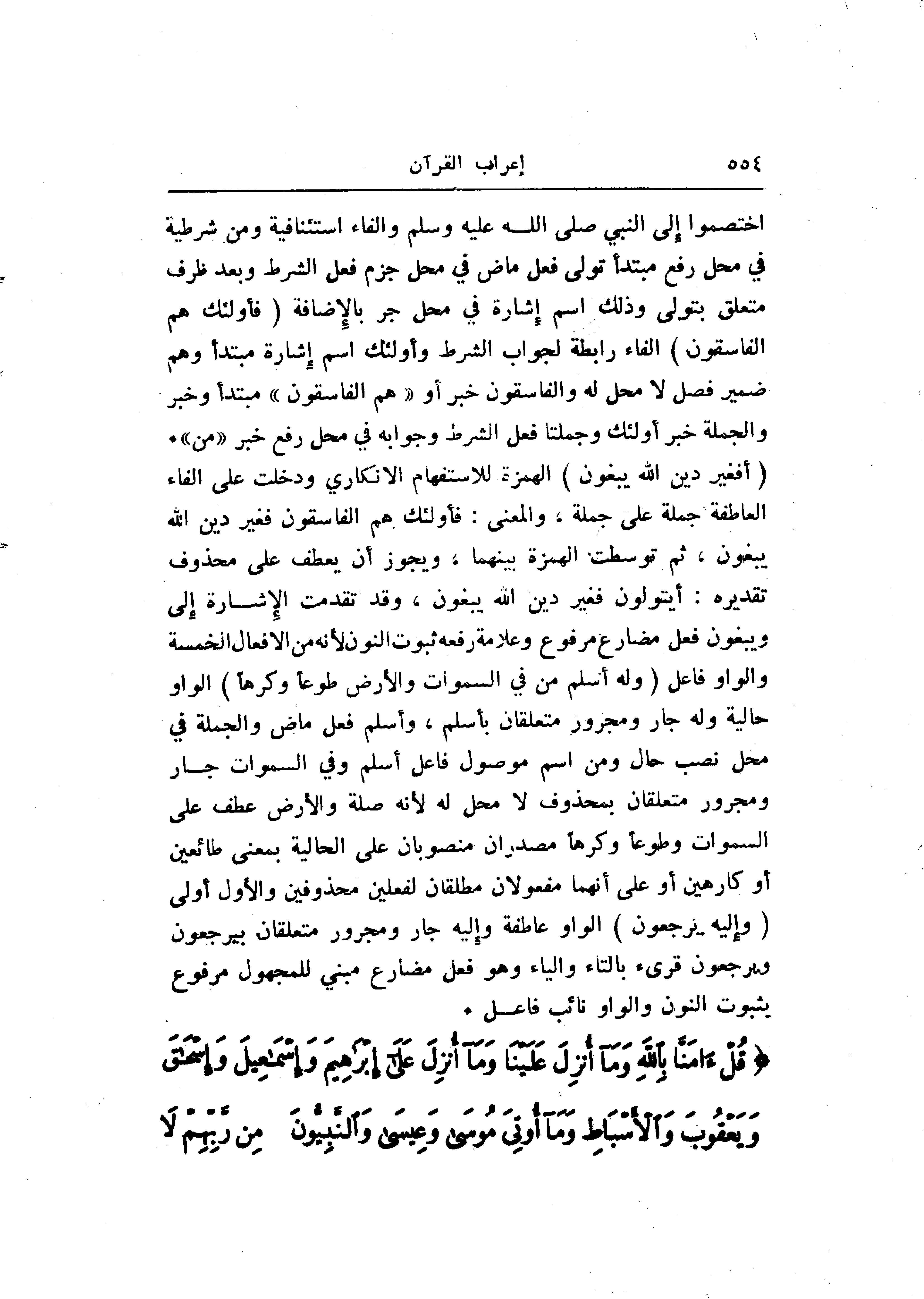 (أَفَغَيْرَ دِينِ اللَّهِ يَبْغُونَ) الهمزة للاستفهام الانكاري ودخلت على الفاء العاطفة جملة على جملة، والمعنى: فأولئك هم الفاسقون فغير دين الله يبغون، ثم توسطت الهمزة بينهما، ويجوز أن يعطف على محذوف تقديره: أيتولون فغير دين الله يبغون، وقد تقدمت الإشارة إلى ويبغون فعل مضارع مرفوع وعلامة رفعه ثبوت النون لأنه من الافعال الخمسة والواو فاعل (وَلَهُ أَسْلَمَ مَنْ فِي السَّماواتِ وَالْأَرْضِ طَوْعاً وَكَرْهاً) الواو حالية وله جار ومجرور متعلقان بأسلم، وأسلم فعل ماض والجملة في محل نصب حال ومن اسم موصول فاعل أسلم وفي السموات جار ومجرور متعلقان بمحذوف لا محل له لأنه صلة والأرض عطف على السموات وطوعا وكرها مصدران منصوبان على الحالية بمعنى طائعين أو كارهين أو على أنهما مفعولان مطلقان لفعلين محذوفين والأول أولى (وَإِلَيْهِ يُرْجَعُونَ) الواو عاطفة وإليه جار ومجرور متعلقان بيرجعون ويرجعون قرىء بالتاء والياء وهو فعل مضارع مبني للمجهول مرفوع بثبوت النون والواو نائب فاعل.