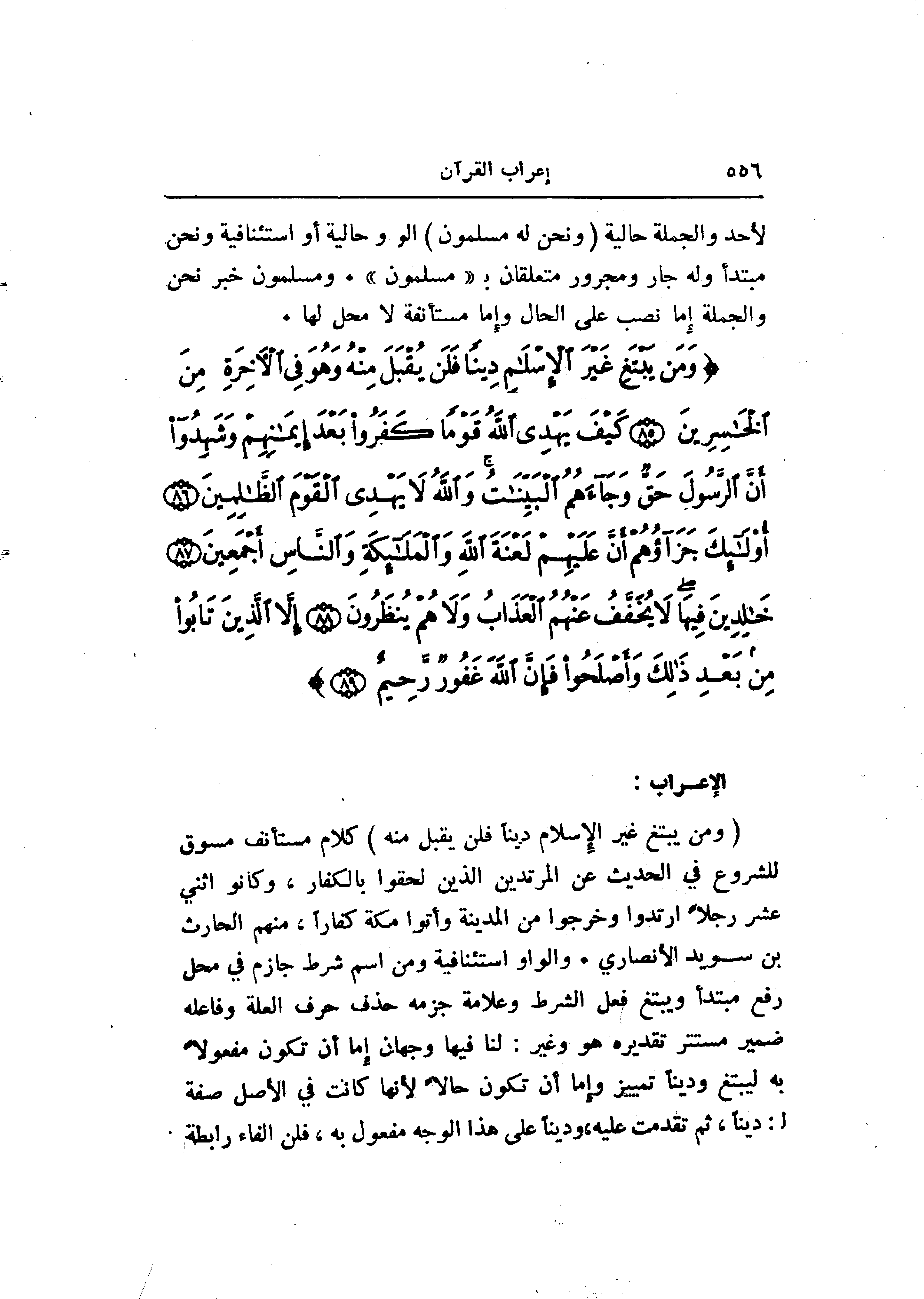 (وَمَنْ يَبْتَغِ غَيْرَ الْإِسْلامِ دِيناً فَلَنْ يُقْبَلَ مِنْهُ) كلام مستأنف مسوق للشروع في الحديث عن المرتدين الذين لحقوا بالكفار، وكانوا اثني عشر رجلا ارتدوا وخرجوا من المدينة وأتوا مكة كفارا، منهم الحارث بن سويد الأنصاري. والواو استئنافية ومن اسم شرط جازم في محل رفع مبتدأ ويبتغ فعل الشرط وعلامة جزمه حذف حرف العلة وفاعله ضمير مستتر تقديره هو وغير: لنا فيها وجهان إما أن تكون مفعولا به ليبتغ ودينا تمييز وإما أن تكون حالا لأنها كانت في الأصل صفة ل: دينا، ثم تقدمت عليه، ودينا على هذا الوجه مفعول به، فلن الفاء رابطة