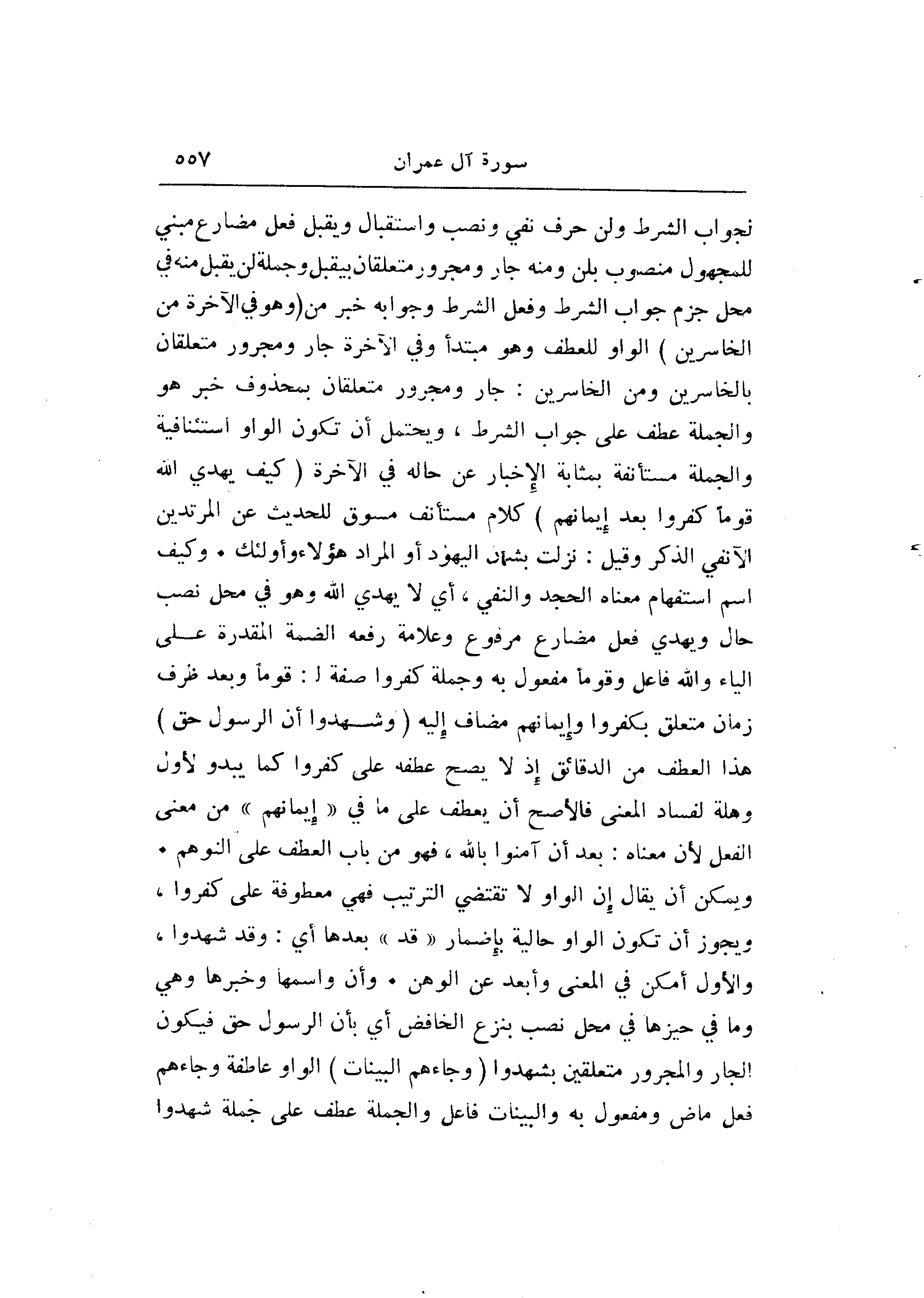 لجواب الشرط ولن حرف نفي ونصب واستقبال ويقبل فعل مضارع مبني للمجهول منصوب بلن ومنه جار ومجرور متعلقان بيقبل وجملة لن يقبل منه في محل جزم جواب الشرط وفعل الشرط وجوابه خبر من (وَهُوَ فِي الْآخِرَةِ مِنَ الْخاسِرِينَ) الواو للعطف وهو مبتدأ وفي الآخرة جار ومجرور متعلقان بالخاسرين ومن الخاسرين: جار ومجرور متعلقان بمحذوف خبر هو والجملة عطف على جواب الشرط، ويحتمل أن تكون الواو استئنافية والجملة مستأنفة بمثابة الإخبار عن حاله في الآخرة (كَيْفَ يَهْدِي اللَّهُ قَوْماً كَفَرُوا بَعْدَ إِيمانِهِمْ) كلام مستأنف مسوق للحديث عن المرتدين الآنفي الذكر وقيل: نزلت بشأن اليهود أو المراد هؤلاء وأولئك. وكيف اسم استفهام معناه الجحد والنفي، أي لا يهدي الله وهو في محل نصب حال ويهدي فعل مضارع مرفوع وعلامة رفعه الضمة المقدرة على الياء والله فاعل وقوما مفعول به وجملة كفروا صفة ل: قوما وبعد ظرف زمان متعلق بكفروا وإيمانهم مضاف إليه (وَشَهِدُوا أَنَّ الرَّسُولَ حَقٌّ) هذا العطف من الدقائق إذ لا يصح عطفه على كفروا كما يبدو لأول وهلة لفساد المعنى فالأصح أن يعطف على ما في «إيمانهم» من معنى الفعل لأن معناه: بعد أن آمنوا بالله، فهو من باب العطف على التوهم.