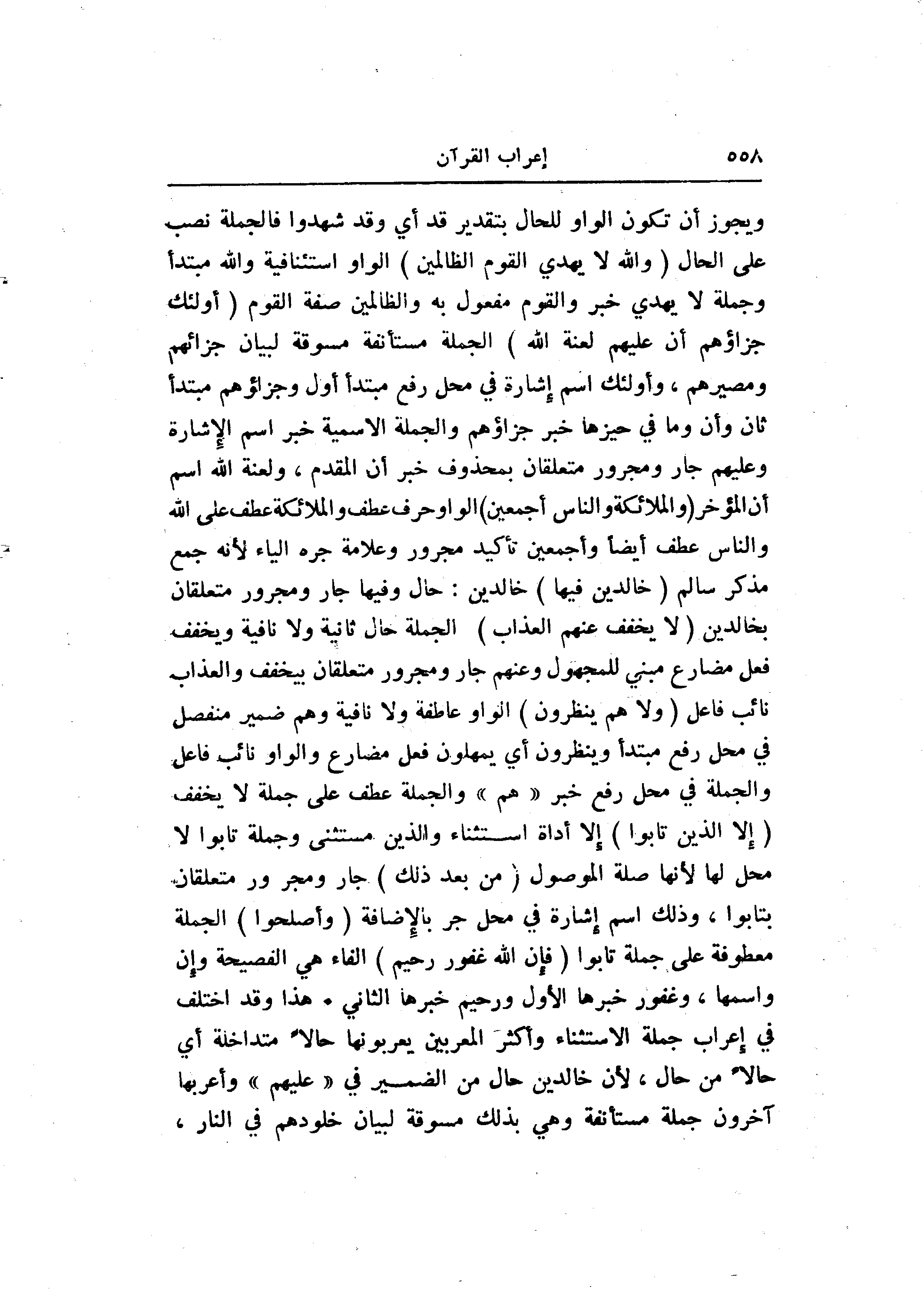 ويجوز أن تكون الواو للحال بتقدير قد أي وقد شهدوا فالجملة نصب على الحال (وَاللَّهُ لا يَهْدِي الْقَوْمَ الظَّالِمِينَ) الواو استئنافية والله مبتدأ وجملة لا يهدي خبر والقوم مفعول به والظالمين صفة القوم (أُولئِكَ جَزاؤُهُمْ أَنَّ عَلَيْهِمْ لَعْنَةَ اللَّهِ) الجملة مستأنفة مسوقة لبيان جزائهم ومصيرهم، وأولئك اسم إشارة في محل رفع مبتدأ أول وجزاؤهم مبتدأ ثان وأن وما في حيزها خبر جزاؤهم والجملة الاسمية خبر اسم الإشارة وعليهم جار ومجرور متعلقان بمحذوف خبر أن المقدم، ولعنة الله اسم أن المؤخر (وَالْمَلائِكَةِ وَالنَّاسِ أَجْمَعِينَ) الواو حرف عطف والملائكة عطف على الله والناس عطف أيضا وأجمعين تأكيد مجرور وعلامة جره الياء لأنه جمع مذكر سالم (خالِدِينَ فِيها) خالدين: حال وفيها جار ومجرور متعلقان بخالدين (لا يُخَفَّفُ عَنْهُمُ الْعَذابُ) الجملة حال ثانية ولا نافية ويخفف فعل مضارع مبني للمجهول وعنهم جار ومجرور متعلقان بيخفف والعذاب نائب فاعل (وَلا هُمْ يُنْظَرُونَ) الواو عاطفة ولا نافية وهم ضمير منفصل في محل رفع مبتدأ وينظرون أي يمهلون فعل مضارع والواو نائب فاعل والجملة في محل رفع خبر «هم» والجملة عطف على جملة لا يخفف (إِلَّا الَّذِينَ تابُوا) إلا أداة استثناء والذين مستثنى وجملة تابوا لا محل لها لأنها صلة الموصول (مِنْ بَعْدِ ذلِكَ) جار ومجرور متعلقان بتابوا، وذلك اسم إشارة في محل جر بالإضافة (وَأَصْلَحُوا) الجملة معطوفة على جملة تابوا (فَإِنَّ اللَّهَ غَفُورٌ رَحِيمٌ) الفاء هي الفصيحة وإن واسمها، وغفور خبرها الأول ورحيم خبرها الثاني. هذا وقد اختلف في إعراب جملة الاستثناء وأكثر المعربين يعربونها حالا متداخلة أي حالا من حال، لأن خالدين حال من الضمير في «عليهم» وأعربها آخرون جملة مستأنفة وهي بذلك مسوقة لبيان خلودهم في النار،