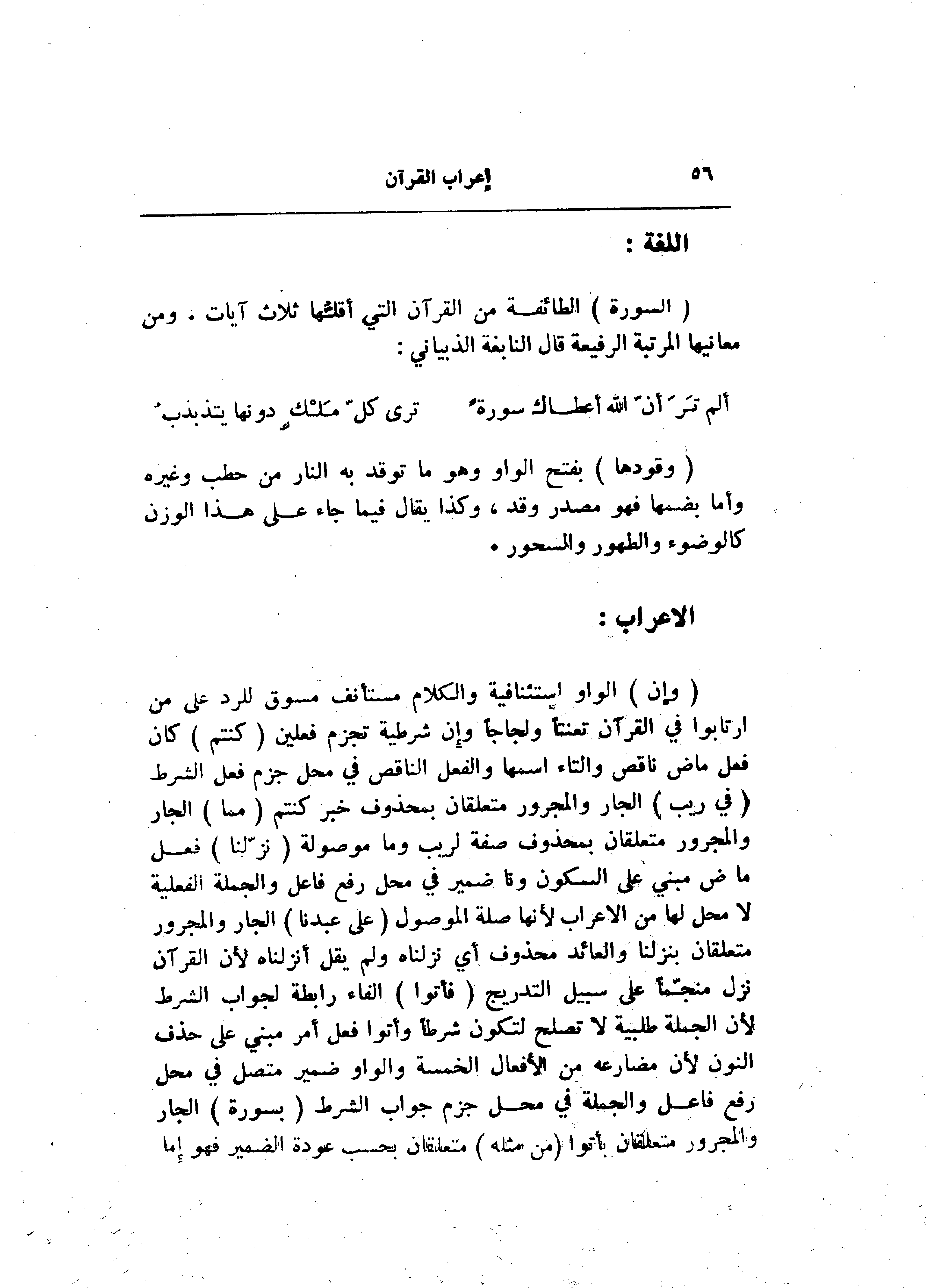 (وَإِنْ) الواو استئنافية والكلام مستأنف مسوق للرد على من ارتابوا في القرآن تعنتا ولجاجا وإن شرطية تجزم فعلين (كُنْتُمْ) كان فعل ماض ناقص والتاء اسمها والفعل الناقص في محل جزم فعل الشرط (فِي رَيْبٍ) الجار والمجرور متعلقان بمحذوف خبر كنتم (مِمَّا) الجار والمجرور متعلقان بمحذوف صفة لريب وما موصولة (نَزَّلْنا) فعل ماض مبني على السكون ونا ضمير في محل رفع فاعل والجملة الفعلية لا محل لها من الإعراب لأنها صلة الموصول (عَلى عَبْدِنا) الجار والمجرور متعلقان بنزلنا والعائد محذوف أي نزلناه ولم يقل أنزلناه لأن القرآن نزل منجّما على سبيل التدريج (فَأْتُوا) الفاء رابطة لجواب الشرط لأن الجملة طلبية لا تصلح لتكون شرطا وأتوا فعل أمر مبني على حذف النون لأن مضارعه من الأفعال الخمسة والواو ضمير متصل في محل رفع فاعل والجملة في محل جزم جواب الشرط (بِسُورَةٍ) الجار والمجرور متعلقان بأتوا (مِنْ مِثْلِهِ) متعلقان بحسب عودة الضمير فهو إما