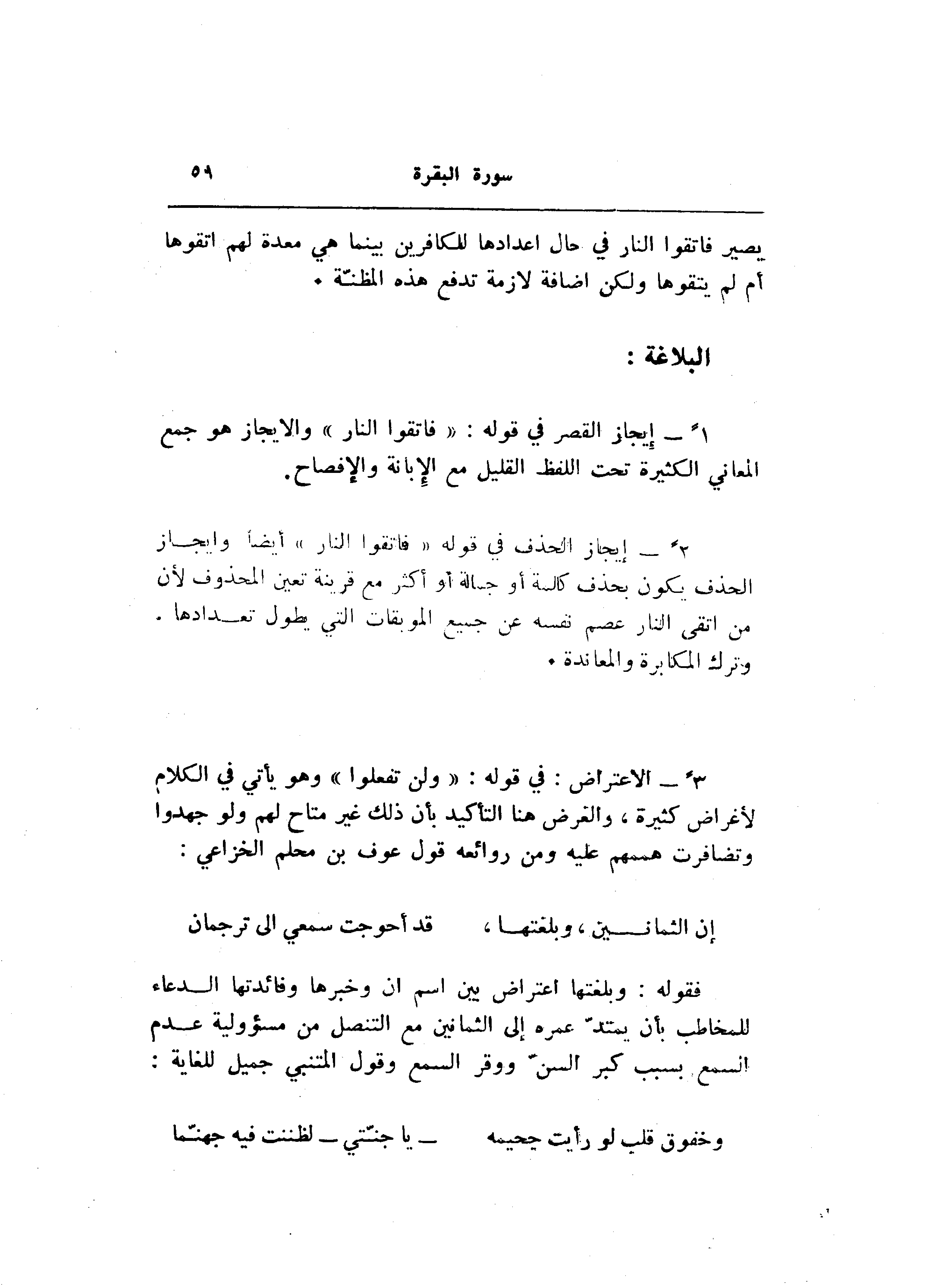 3- الاعتراض: في قوله: «ولن تفعلوا» وهو يأتي في الكلام الأغراض كثيرة، والغرض هنا التأكيد بأن ذلك غير متاح لهم ولو جهدوا وتضافرت هممهم عليه ومن روائعه قول عوف بن محلم الخزاعي: