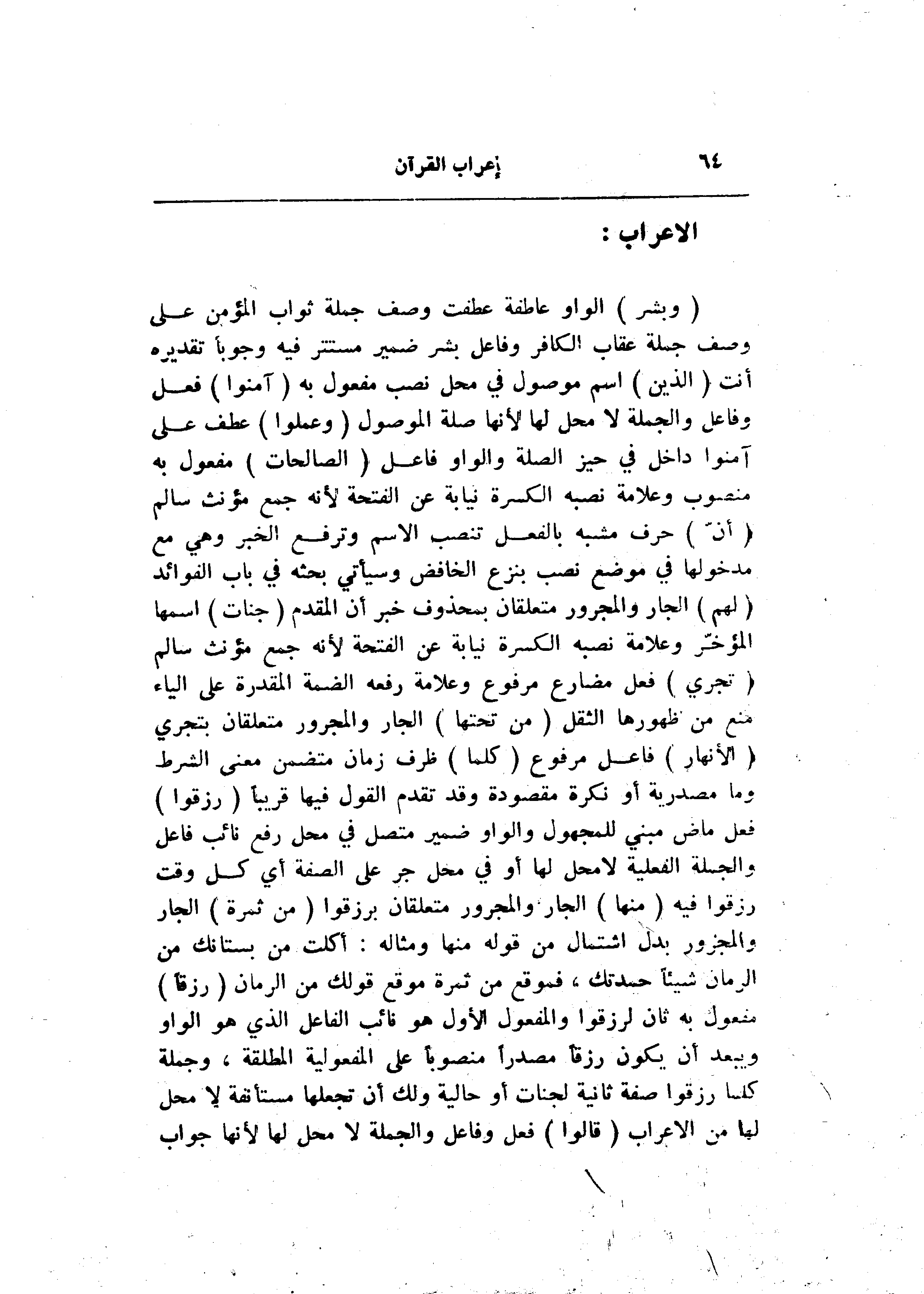 (وَبَشِّرِ) الواو عاطفة عطفت وصف جملة ثواب المؤمن على وصف جملة عقاب الكافر وفاعل بشر ضمير مستتر فيه وجوبا تقديره أنت (الَّذِينَ) اسم موصول في محل نصب مفعول به (آمَنُوا) فعل وفاعل والجملة لا محل لها لأنها صلة الموصول (وَعَمِلُوا) عطف على آمنوا داخل في حيز الصلة والواو فاعل (الصَّالِحاتِ) مفعول به منصوب وعلامة نصبه الكسرة نيابة عن الفتحة لأنه جمع مؤنث سالم (أَنَّ) حرف مشبه بالفعل تنصب الاسم وترفع الخبر وهي مع مدخولها في موضع نصب بنزع الخافض وسيأتي بحثه في باب الفوائد (لَهُمْ) الجار والمجرور متعلقان بمحذوف خبر أن المقدم (جَنَّاتٍ) اسمها المؤخّر وعلامة نصبه الكسرة نيابة عن الفتحة لأنه جمع مؤنث سالم (تَجْرِي) فعل مضارع مرفوع وعلامة رفعه الضمة المقدرة على الياء منع من ظهورها الثقل (مِنْ تَحْتِهَا) الجار والمجرور متعلقان بتجري (الْأَنْهارُ) فاعل مرفوع (كُلَّما) ظرف زمان متضمن معنى الشرط وما مصدرية أو نكرة مقصودة وقد تقدم القول فيها قريبا (رُزِقُوا) فعل ماض مبني للمجهول والواو ضمير متصل في محل رفع نائب فاعل والجملة الفعلية لا محل لها أو في محل جر على الصفة أي كل وقت رزقوا فيه (مِنْها) الجار والمجرور متعلقان برزقوا (مِنْ ثَمَرَةٍ) الجار والمجرور بدل اشتمال من قوله منها ومثاله: أكلت من بستانك من الرمان شيئا حمدتك، فموقع من ثمرة موقع قولك من الرمان (رِزْقاً) مفعول به ثان لرزقوا والمفعول الأول هو نائب الفاعل الذي هو الواو ويبعد أن يكون رزقا مصدرا منصوبا على المفعولية المطلقة، وجملة كلما رزقوا صفة ثانية لجنات أو حالية ولك أن تجعلها مستأنفة لا محل لها من الإعراب (قالُوا) فعل وفاعل والجملة لا محل لها لأنها جواب