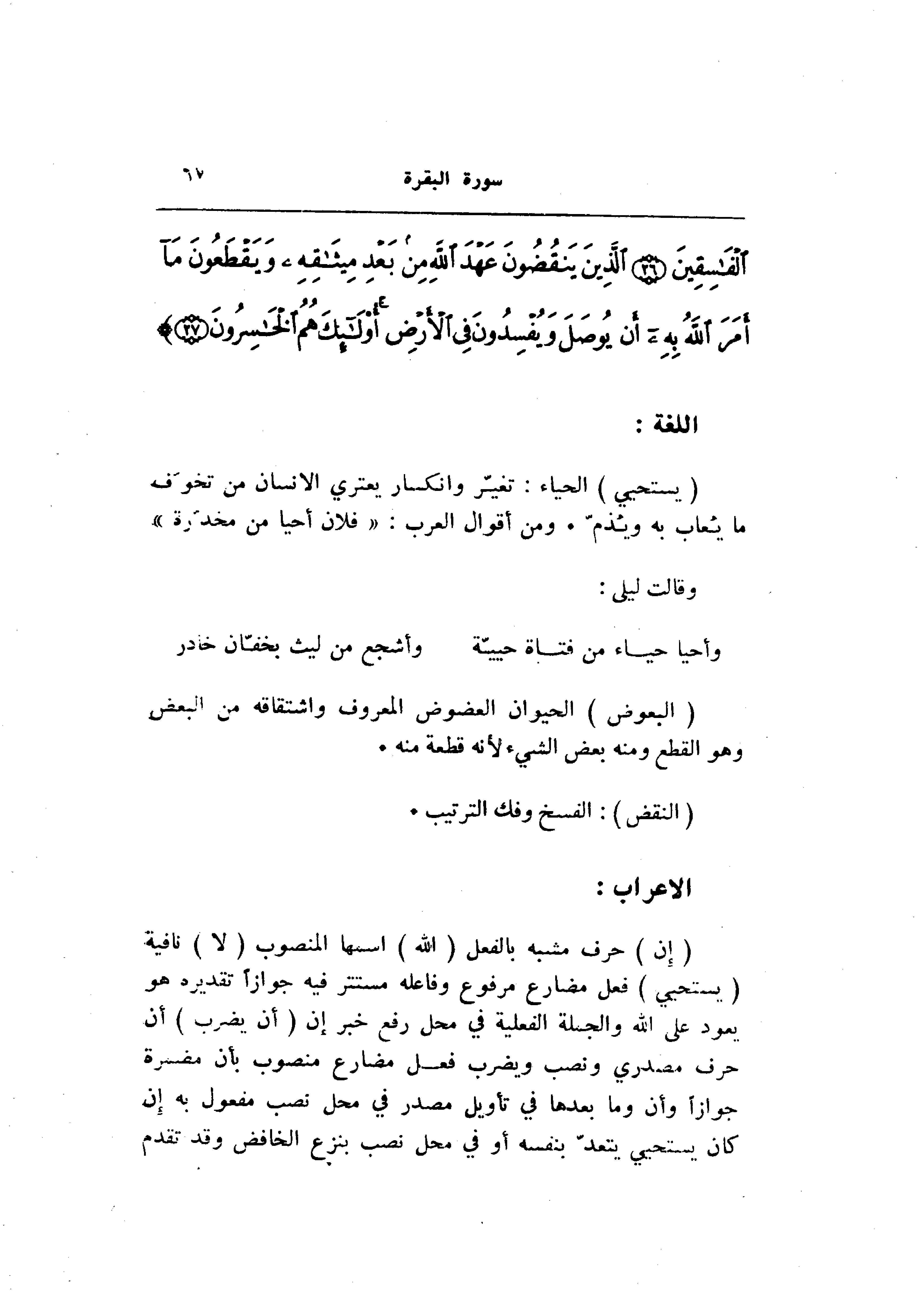 (يَسْتَحْيِي) الحياء: تغيّر وانكسار يعتري الإنسان من تخوّف ما يعاب به ويذمّ. ومن أقوال العرب: «فلان أحيا من مخدّرة» وقالت ليلى: