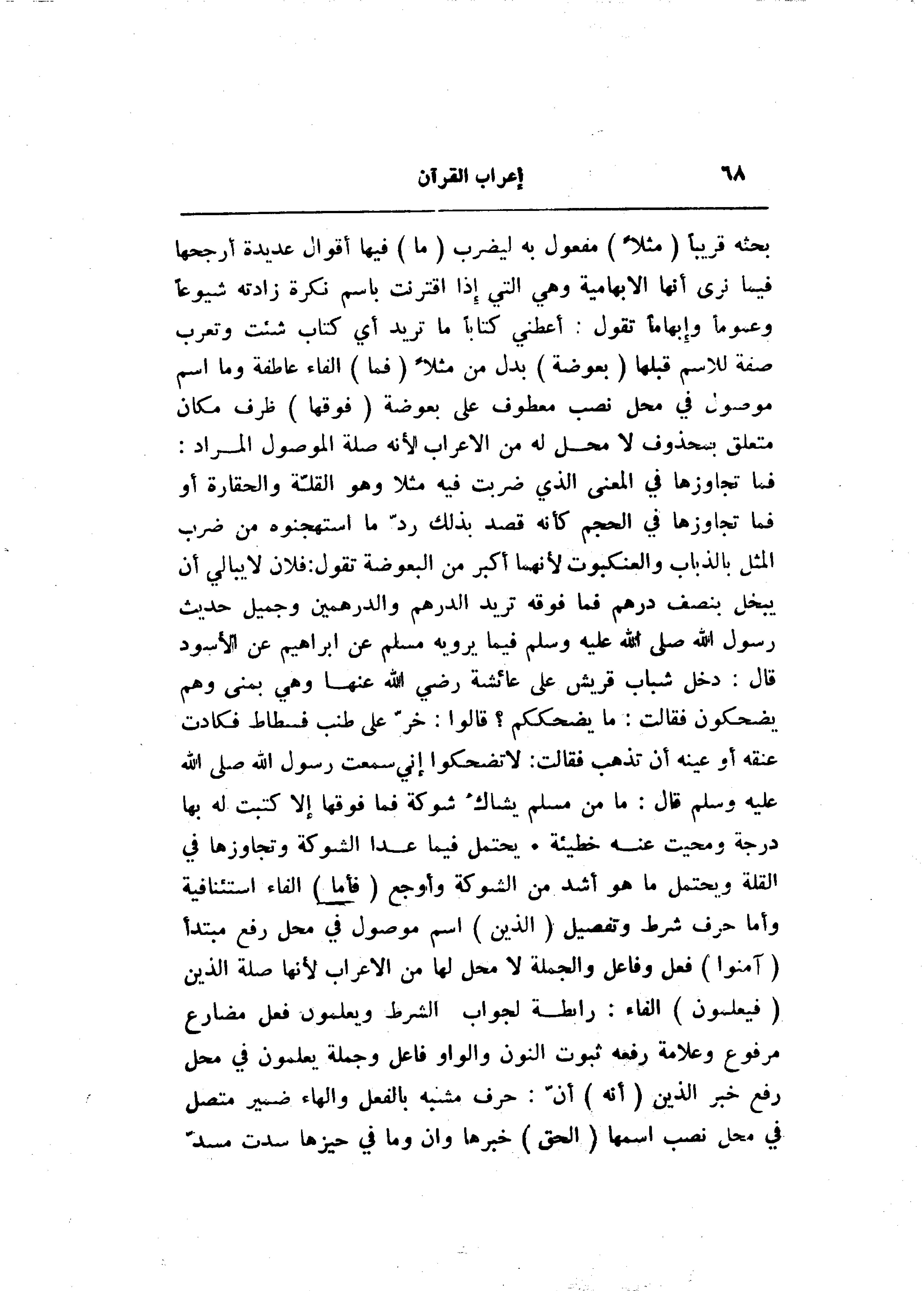 بحثه قريبا (مَثَلًا) مفعول به ليضرب (ما) فيها أقوال عديدة أرجحها فيما نرى أنها الإبهامية وهي التي إذا اقترنت باسم نكرة زادته شيوعا وعموما وإبهاما تقول: أعطني كتابا ما تريد أي كتاب شئت وتعرب صفة للاسم قبلها (بَعُوضَةً) بدل من مثلا (فَما) الفاء عاطفة وما اسم موصول في محل نصب معطوف على بعوضة (فَوْقَها) ظرف مكان متعلق بمحذوف لا محل له من الإعراب لأنه صلة الموصول المراد: