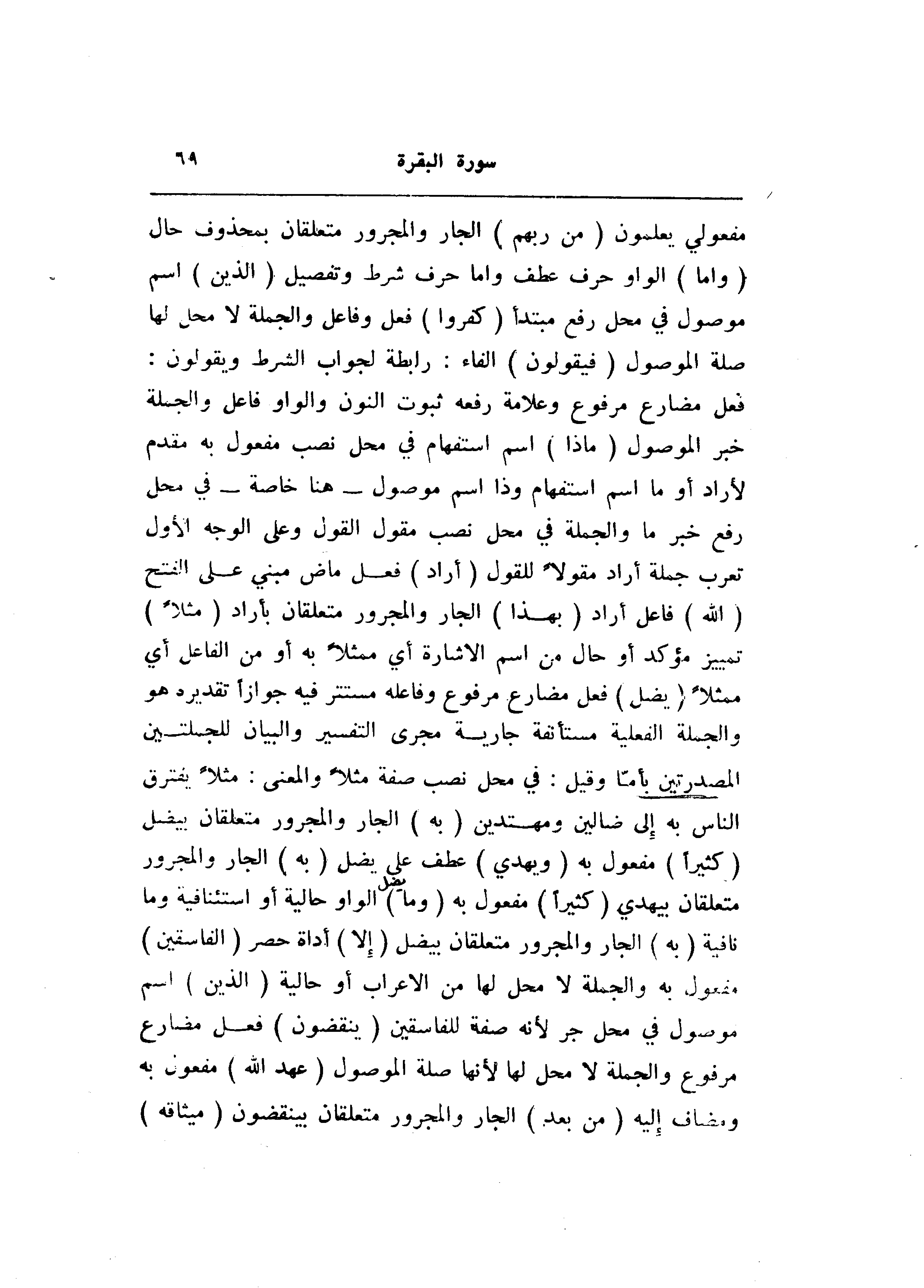 فعل مضارع مرفوع وعلامة رفعه ثبوت النون والواو فاعل والجملة خبر الموصول (ماذا) اسم استفهام في محل نصب مفعول به مقدم لأراد أو ما اسم استفهام وذا اسم موصول- هنا خاصة- في محل رفع خبر ما والجملة في محل نصب مقول القول وعلى الوجه الأول تعرب جملة أراد مقولا للقول (أَرادَ) فعل ماض مبني على الفتح (اللَّهَ) فاعل أراد (بِهذا) الجار والمجرور متعلقان بأراد (مَثَلًا) تمييز مؤكد أو حال من اسم الاشارة أي ممثلا به أو من الفاعل أي ممثلا (يُضِلُّ) فعل مضارع مرفوع وفاعله مستتر فيه جوازا تقديره هو والجملة الفعلية مستأنفة جارية مجرى التفسير والبيان للجملتين المصدرتين بأمّا وقيل: في محل نصب صفة مثلا والمعنى: مثلا يفترق الناس به إلى ضالين ومهتدين (بِهِ) الجار والمجرور متعلقان بيضل (كَثِيراً) مفعول به (وَيَهْدِي) عطف على يضل (بِهِ) الجار والمجرور متعلقان بيهدي (كَثِيراً) مفعول به (وَما يُضِلُّ) الواو حالية أو استئنافية وما نافية (بِهِ) الجار والمجرور متعلقان بيضل (إِلَّا) أداة حصر (الْفاسِقِينَ) مفعول به والجملة لا محل لها من الإعراب أو حالية (الَّذِينَ) اسم موصول في محل جر لأنه صفة للفاسقين (يَنْقُضُونَ) فعل مضارع مرفوع والجملة لا محل لها لأنها صلة الموصول (عَهْدَ اللَّهِ) مفعول به ومضاف إليه (مِنْ بَعْدِ) الجار والمجرور متعلقان بينقضون (مِيثاقِهِ)