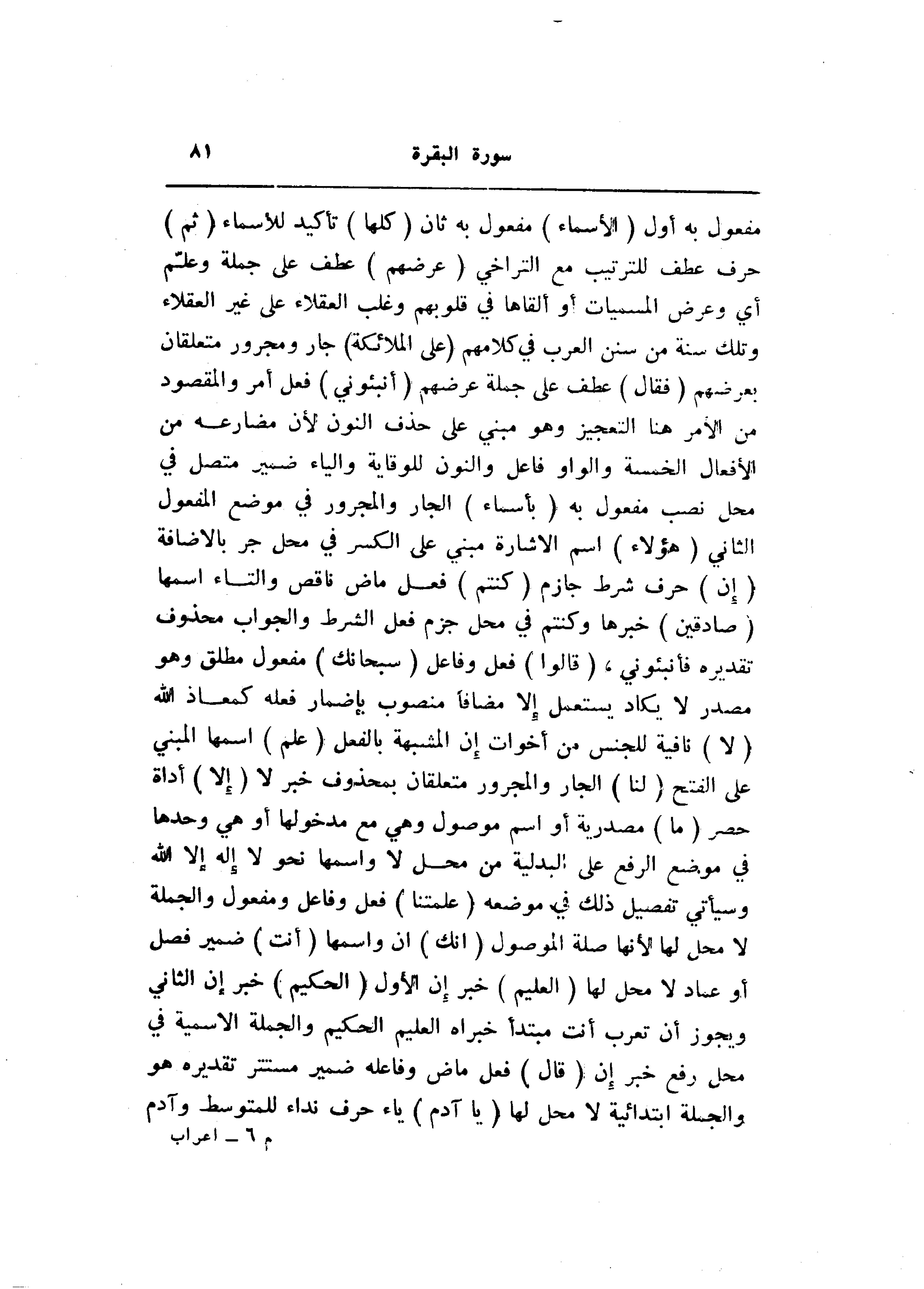 مفعول به أول (الْأَسْماءَ) مفعول به ثان (كُلَّها) تأكيد للأسماء (ثُمَّ) حرف عطف للترتيب مع التراخي (عَرَضَهُمْ) عطف على جملة وعلّم أي وعرض المسميات أو ألقاها في قلوبهم وغلب العقلاء على غير العقلاء وتلك سنة من سنن العرب في كلامهم (عَلَى الْمَلائِكَةِ) جار ومجرور متعلقان بعرضهم (فَقالَ) عطف على جملة عرضهم (أَنْبِئُونِي) فعل أمر والمقصود من الأمر هنا التعجيز وهو مبني على حذف النون لأن مضارعه من الأفعال الخمسة والواو فاعل والنون للوقاية والياء ضمير متصل في محل نصب مفعول به (بِأَسْماءِ) الجار والمجرور في موضع المفعول الثاني (هؤُلاءِ) اسم الاشارة مبني على الكسر في محل جر بالاضافة (إِنْ) حرف شرط جازم (كُنْتُمْ) فعل ماض ناقص والتاء اسمها (صادِقِينَ) خبرها وكنتم في محل جزم فعل الشرط والجواب محذوف تقديره فأنبئوني، (قالُوا) فعل وفاعل (سُبْحانَكَ) مفعول مطلق وهو مصدر لا يكاد يستعمل إلا مضافا منصوب بإضمار فعله كمعاذ الله (لا) نافية للجنس من أخوات إن المشبهة بالفعل (عِلْمَ) اسمها المبني على الفتح (لَنا) الجار والمجرور متعلقان بمحذوف خبر لا (إِلَّا) أداة حصر (ما) مصدرية أو اسم موصول وهي مع مدخولها أو هي وحدها في موضع الرفع على البدلية من محل لا واسمها نحو لا إله إلا الله وسيأتي تفصيل ذلك في موضعه (عَلَّمْتَنا) فعل وفاعل ومفعول والجملة لا محل لها لأنها صلة الموصول (إِنَّكَ) ان واسمها (أَنْتَ) ضمير فصل أو عماد لا محل لها (الْعَلِيمُ) خبر إن الأول (الْحَكِيمُ) خبر إن الثاني ويجوز أن تعرب أنت مبتدأ خبراه العليم الحكيم والجملة الاسمية في محل رفع خبر إن (قالَ) فعل ماض وفاعله ضمير مستتر تقديره هو والجملة ابتدائية لا محل لها (يا آدَمُ) ياء حرف نداء للمتوسط وآدم