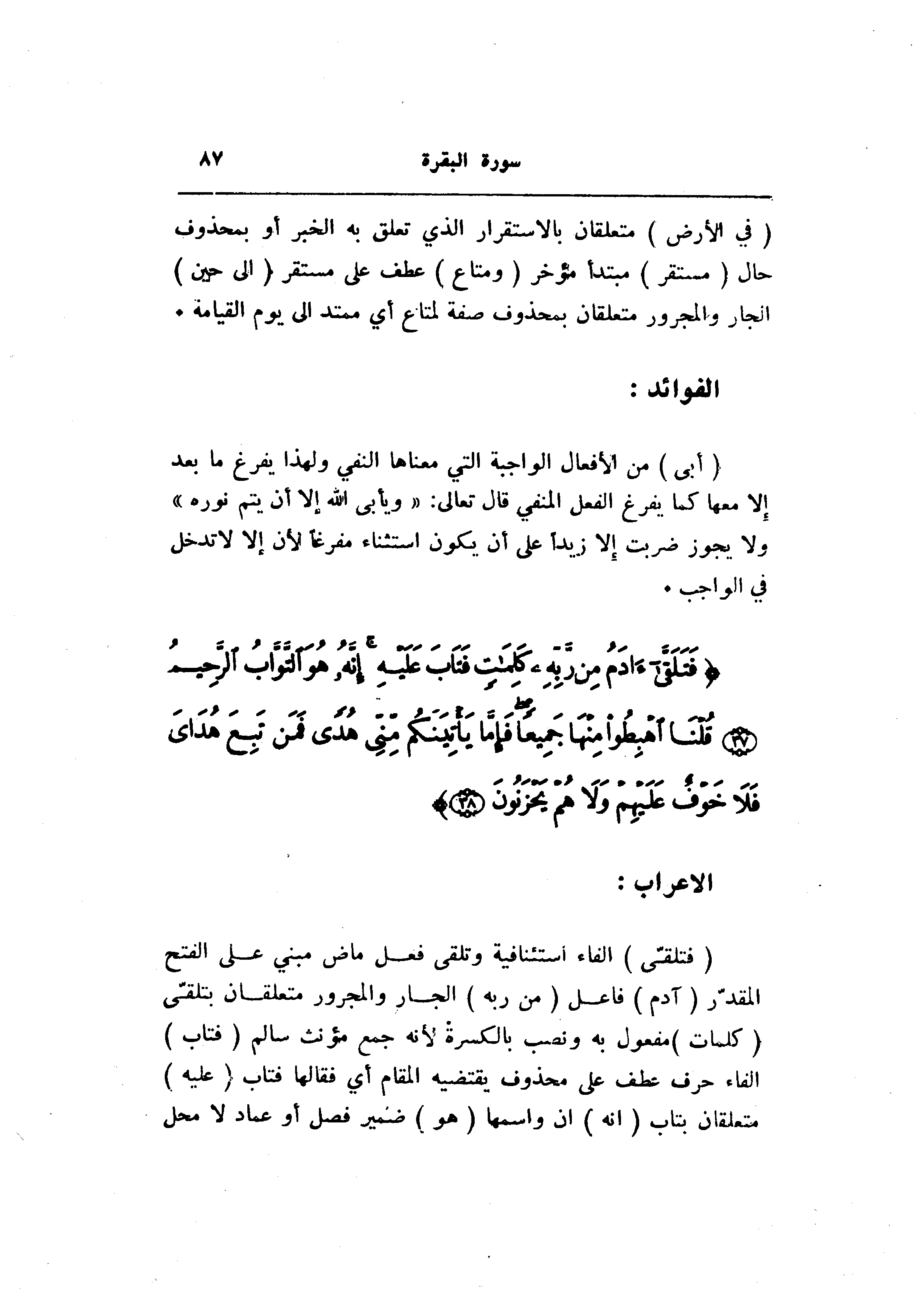 (فَتَلَقَّى) الفاء استئنافية وتلقى فعل ماض مبني على الفتح المقدّر (آدَمُ) فاعل (مِنْ رَبِّهِ) الجار والمجرور متعلقان بتلقّى (كَلِماتٍ) مفعول به ونصب بالكسرة لأنه جمع مؤنث سالم (فَتابَ) الفاء حرف عطف على محذوف يقتضيه المقام أي فقالها فتاب (عَلَيْهِ) متعلقان بتاب (إِنَّهُ) ان واسمها (هُوَ) ضمير فصل أو عماد لا محل