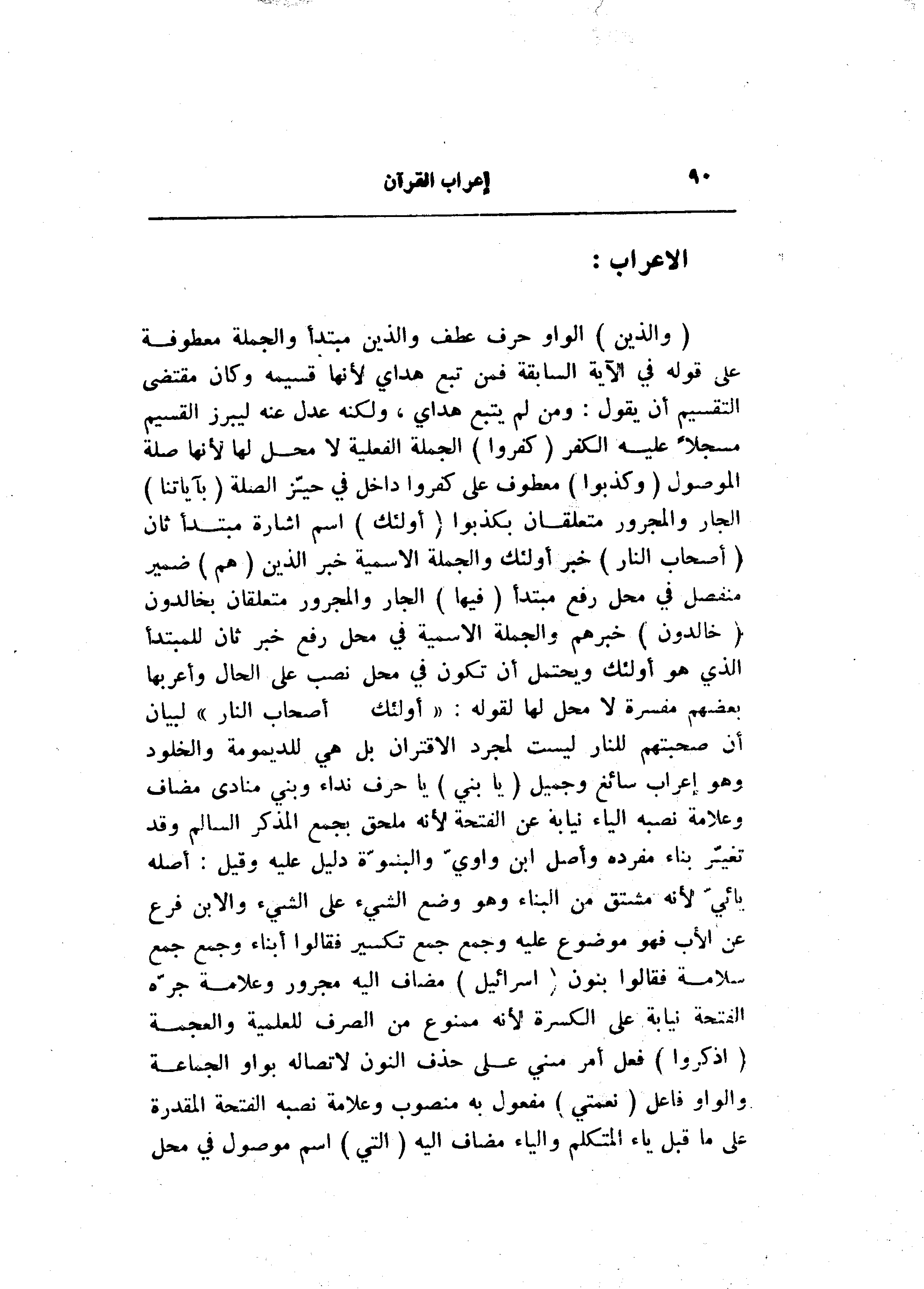 (وَالَّذِينَ) الواو حرف عطف والذين مبتدأ والجملة معطوفة على قوله في الآية السابقة فمن تبع هداي لأنها قسيمه وكان مقتضى التقسيم أن يقول: ومن لم يتبع هداي، ولكنه عدل عنه ليبرز القسيم مسجلا عليه الكفر (كَفَرُوا) الجملة الفعلية لا محل لها لأنها صلة الموصول (وَكَذَّبُوا) معطوف على كفروا داخل في حيّز الصلة (بِآياتِنا) الجار والمجرور متعلقان بكذبوا (أُولئِكَ) اسم اشارة مبتدأ ثان (أَصْحابُ النَّارِ) خبر أولئك والجملة الاسمية خبر الذين (هُمْ) ضمير منفصل في محل رفع مبتدأ (فِيها) الجار والمجرور متعلقان بخالدون (خالِدُونَ) خبرهم والجملة الاسمية في محل رفع خبر ثان للمبتدأ الذي هو أولئك ويحتمل أن تكون في محل نصب على الحال وأعربها بعضهم مفسرة لا محل لها لقوله: «أولئك أصحاب النار» لبيان أن صحبتهم للنار ليست لمجرد الاقتران بل هي للديمومة والخلود وهو إعراب سائغ وجميل (يا بَنِي) يا حرف نداء وبني منادى مضاف وعلامة نصبه الياء نيابه عن الفتحة لأنه ملحق بجمع المذكر السالم وقد تغيّر بناء مفرده وأصل ابن واويّ والبنوّة دليل عليه وقيل: أصله يائيّ لأنه مشتق من البناء وهو وضع الشيء على الشيء والابن فرع عن الأب فهو موضوع عليه وجمع جمع تكسير فقالوا أبناء وجمع جمع سلامة فقالوا بنون (إِسْرائِيلَ) مضاف اليه مجرور وعلامة جرّه الفتحة نيابة على الكسرة لأنه ممنوع من الصرف للعلمية والعجمة (اذْكُرُوا) فعل أمر مبني على حذف النون لاتصاله بواو الجماعة والواو فاعل (نِعْمَتِيَ) مفعول به منصوب وعلامة نصبه الفتحة المقدرة على ما قبل ياء المتكلم والياء مضاف اليه (الَّتِي) اسم موصول في محل