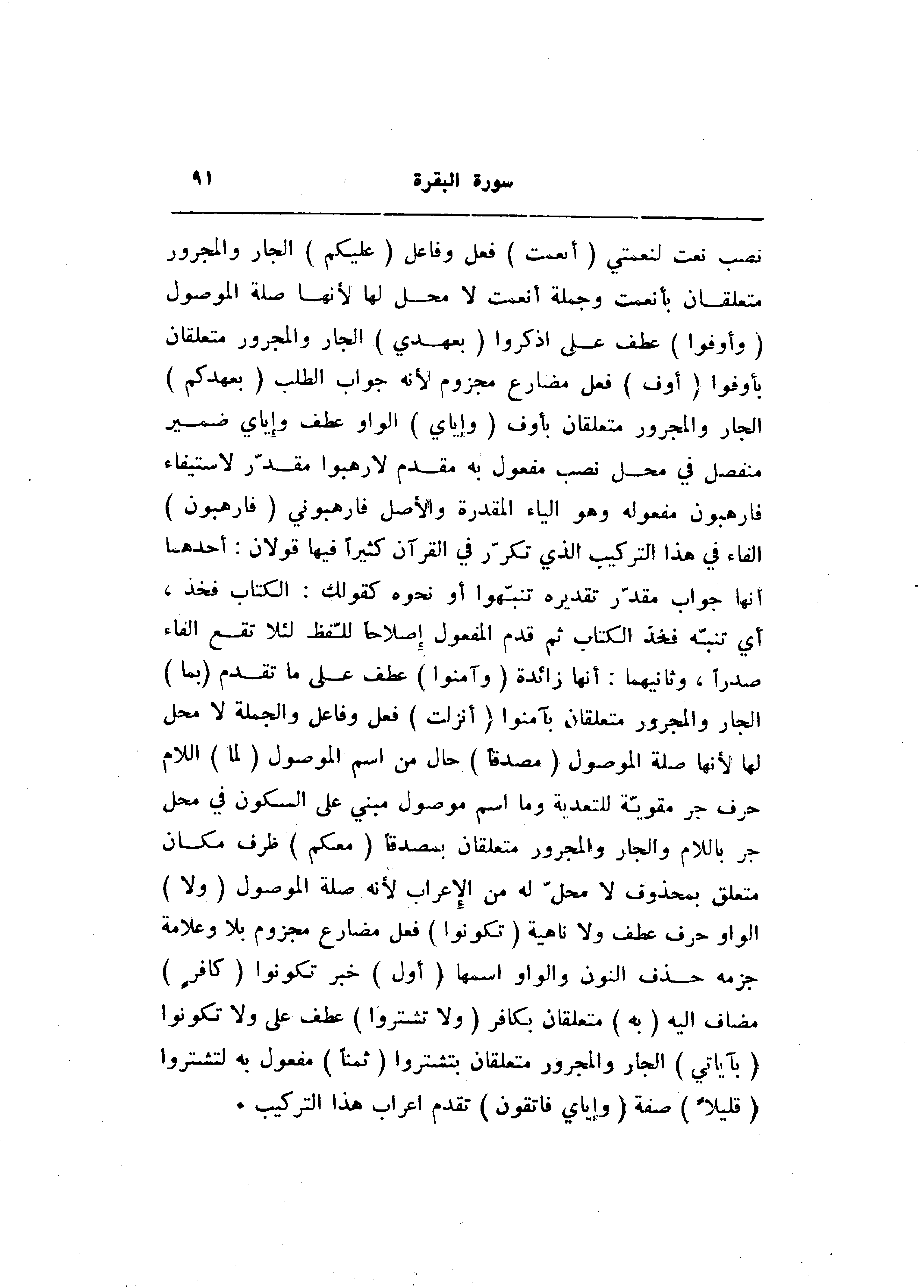 نصب نعت لنعمتي (أَنْعَمْتُ) فعل وفاعل (عَلَيْكُمْ) الجار والمجرور متعلقان بأنعمت وجملة أنعمت لا محل لها لأنها صلة الموصول (وَأَوْفُوا) عطف على اذكروا (بِعَهْدِي) الجار والمجرور متعلقان بأوفوا (أُوفِ) فعل مضارع مجزوم لأنه جواب الطلب (بِعَهْدِكُمْ) الجار والمجرور متعلقان بأوف (وَإِيَّايَ) الواو عطف وإياي ضمير منفصل في محل نصب مفعول به مقدم لا رهبوا مقدّر لاستيفاء فارهبون مفعوله وهو الياء المقدرة والأصل فارهبوني (فَارْهَبُونِ) الفاء في هذا التركيب الذي تكرّر في القرآن كثيرا فيها قولان: أحدهما أنها جواب مقدّر تقديره تنبّهوا أو نحوه كقولك: الكتاب فخذ، أي تنبّه فخذ الكتاب ثم قدم المفعول إصلاحا للّفظ لئلا تقع الفاء صدرا، وثانيهما: أنها زائدة (وَآمِنُوا) عطف على ما تقدم (بِما) الجار والمجرور متعلقان بآمنوا (أَنْزَلْتُ) فعل وفاعل والجملة لا محل لها لأنها صلة الموصول (مُصَدِّقاً) حال من اسم الموصول (لِما) اللام حرف جر مقويّة للتعدية وما اسم موصول مبني على السكون في محل جر باللام والجار والمجرور متعلقان بمصدقا (مَعَكُمْ) ظرف مكان متعلق بمحذوف لا محلّ له من الإعراب لأنه صلة الموصول (وَلا) الواو حرف عطف ولا ناهية (تَكُونُوا) فعل مضارع مجزوم بلا وعلامة جزمه حذف النون والواو اسمها (أَوَّلَ) خبر تكونوا (كافِرٍ) مضاف اليه (بِهِ) متعلقان بكافر (وَلا تَشْتَرُوا) عطف على ولا تكونوا (بِآياتِي) الجار والمجرور متعلقان بتشتروا (ثَمَناً) مفعول به لتشتروا (قَلِيلًا) صفة (وَإِيَّايَ فَاتَّقُونِ) تقدم اعراب هذا التركيب.