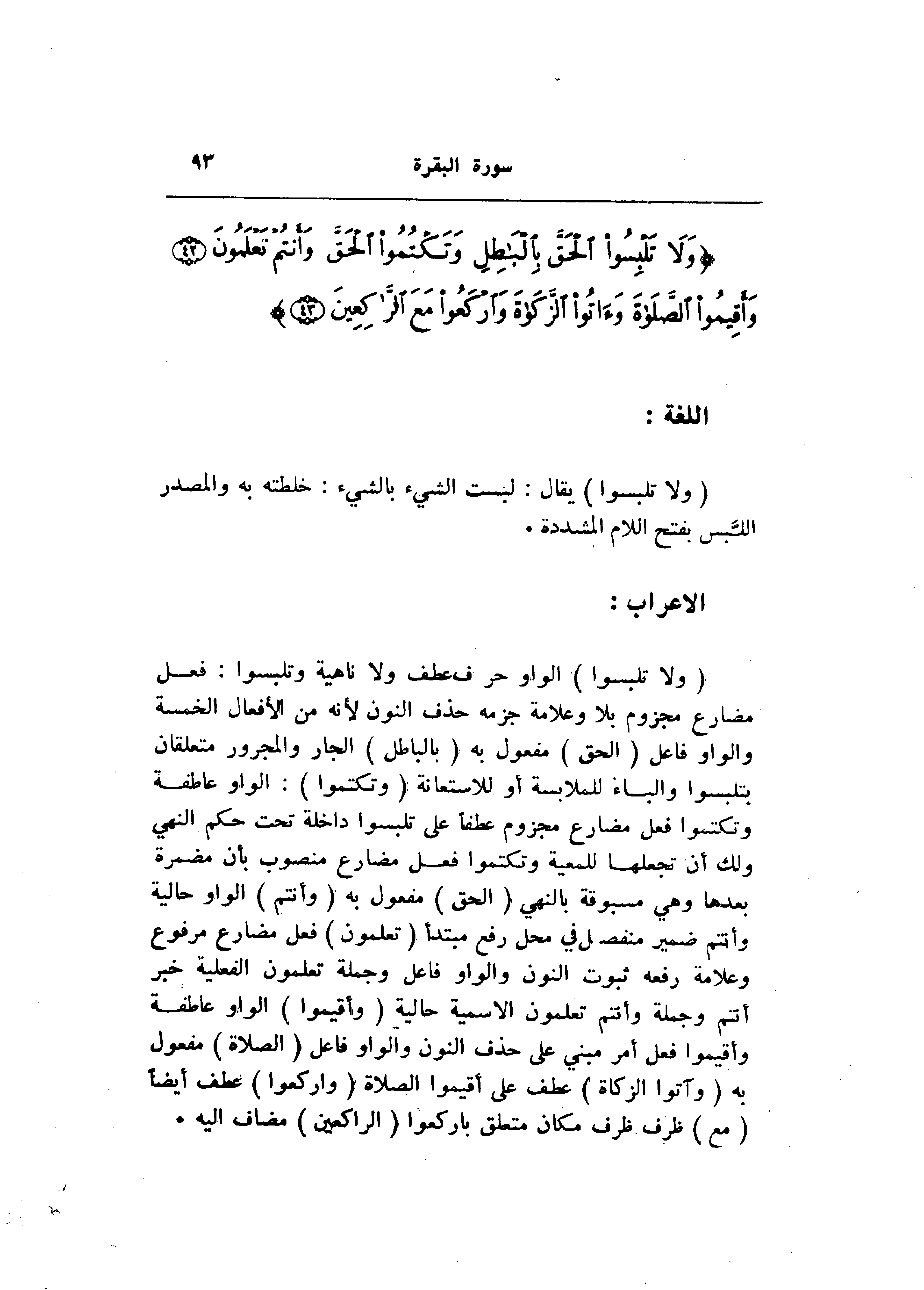 (وَلا تَلْبِسُوا) الواو حرف عطف ولا ناهية وتلبسوا: فعل مضارع مجزوم بلا وعلامة جزمه حذف النون لأنه من الأفعال الخمسة والواو فاعل (الْحَقَّ) مفعول به (بِالْباطِلِ) الجار والمجرور متعلقان بتلبسوا والباء للملابسة أو للاستعانة (وَتَكْتُمُوا) : الواو عاطفة وتكتموا فعل مضارع مجزوم عطفا على تلبسوا داخلة تحت حكم النهي ولك أن تجعلها للمعية وتكتموا فعل مضارع منصوب بأن مضمرة بعدها وهي مسبوقة بالنهي (الْحَقَّ) مفعول به (وَأَنْتُمْ) الواو حالية وأنتم ضمير منفصل في محل رفع مبتدأ (تَعْلَمُونَ) فعل مضارع مرفوع وعلامة رفعه ثبوت النون والواو فاعل وجملة تعلمون الفعلية خبر أنتم وجملة وأنتم تعلمون الاسمية حالية (وَأَقِيمُوا) الواو عاطفة وأقيموا فعل أمر مبني على حذف النون والواو فاعل (الصَّلاةَ) مفعول به (وَآتُوا الزَّكاةَ) عطف على أقيموا الصلاة (وَارْكَعُوا) عطف أيضا (مَعَ) ظرف ظرف مكان متعلق باركعوا (الرَّاكِعِينَ) مضاف اليه.
