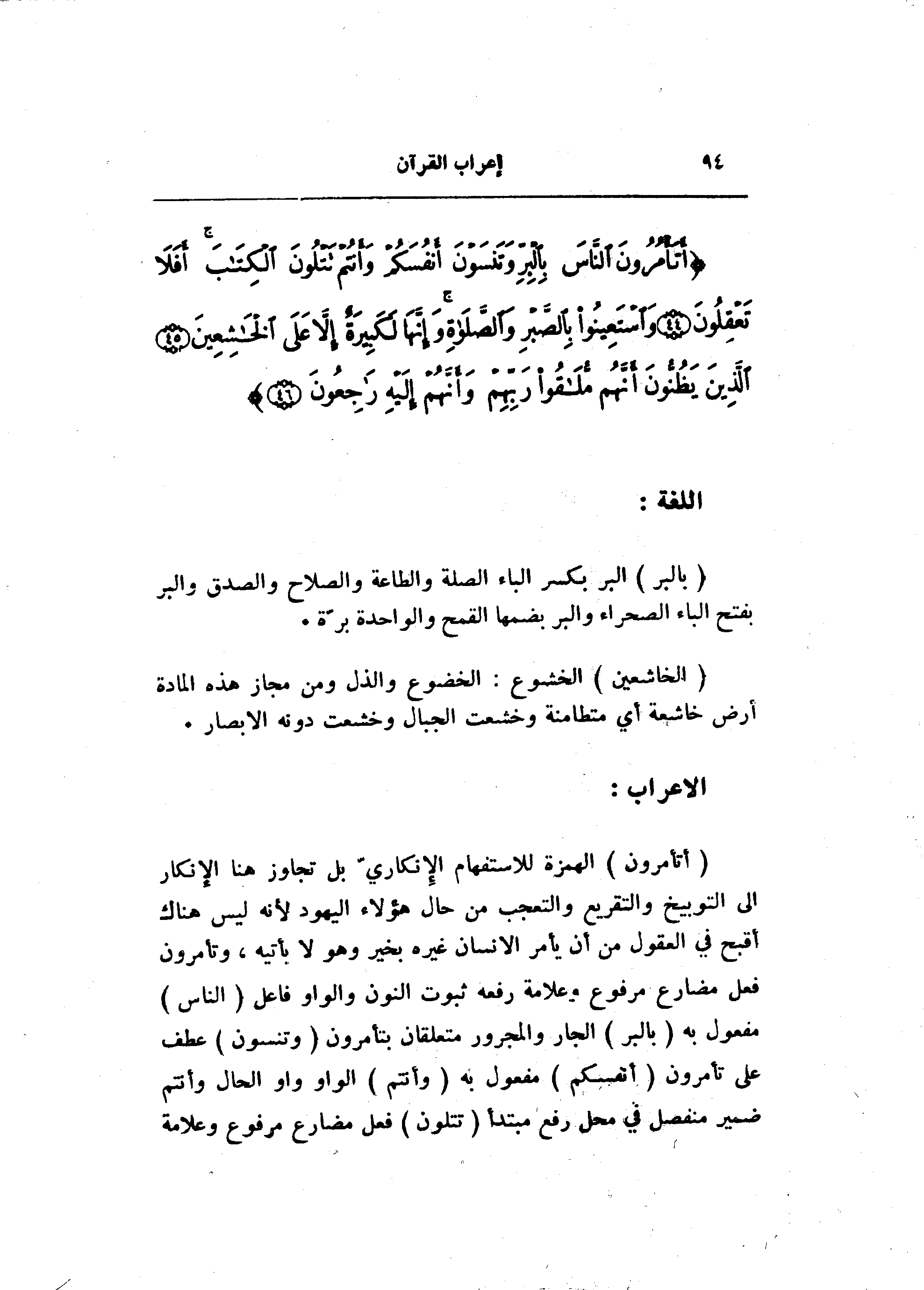 (أَتَأْمُرُونَ) الهمزة للاستفهام الإنكاريّ بل تجاوز هنا الإنكار الى التوبيخ والتقريع والتعجب من حال هؤلاء اليهود لأنه ليس هناك أقبح في العقول من أن يأمر الإنسان غيره بخير وهو لا بأتيه، وتأمرون فعل مضارع مرفوع وعلامة رفعه ثبوت النون والواو فاعل (النَّاسَ) مفعول به (بِالْبِرِّ) الجار والمجرور متعلقان بتأمرون (وَتَنْسَوْنَ) عطف على تأمرون (أَنْفُسَكُمْ) مفعول به (وَأَنْتُمْ) الواو واو الحال وأنتم ضمير منفصل في محل رفع مبتدأ (تَتْلُونَ) فعل مضارع مرفوع وعلامة