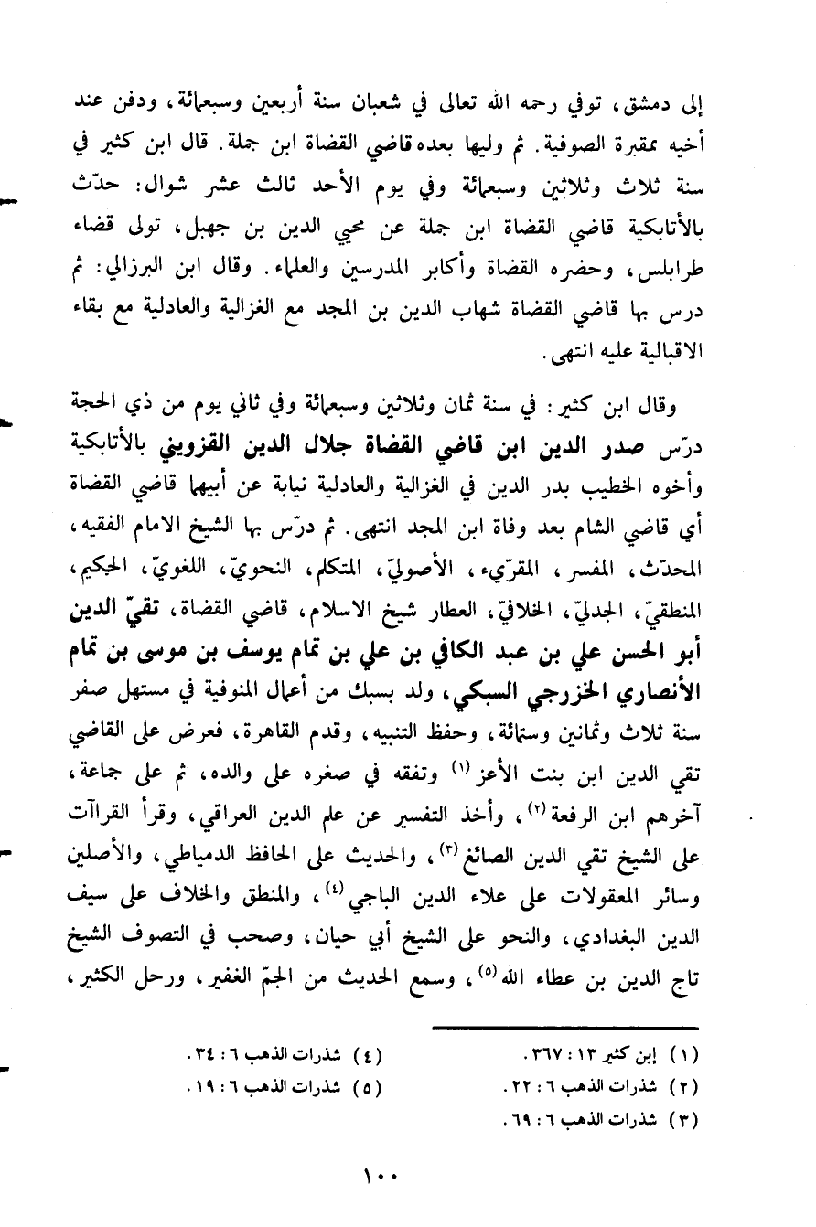وقال ابن كثير: في سنة ثمان وثلاثين وسبعمائة وفي ثاني يوم من ذي الحجة درس صدر الدين ابن قاضي القضاة جلال الدين القزويني بالأتابكية وأخوه الخطيب بدر الدين في الغزالية والعادلية نيابة عن ابيهما قاضي القضاة أي قاضي الشام بعد وفاة ابن المجد انتهى. ثم درس بها الشيخ الامام الفقيه المحدث المفسر المقرئ الأصولي المتكلم النحوي اللغوي الحكيم المنطقي الجدلي الخلافي العطار شيخ الاسلام قاضي القضاة تقي الدين أبو الحسن علي بن عبد الكافي بن علي بن تمام يوسف بن موسى بن تمام الانصاري الخزرجي السبكي ولد بسبك من أعمال المنوفية في مستهل صفر سنة ثلاث وثمانين وستمائة وحفظ التنبيه وقدم القاهرة فعرض على القاضي تقي الدين ابن بنت الأعز1 وتفقه في صغره على والده ثم على جماعة آخرهم ابن الرفعة2 وأخذ التفسير عن علم الدين العراقي وقرأ القراءات على الشيخ تقي الدين الصائغ3 والحديث على الحافظ الدمياطي والأصلين وسائر المعقولات على علاء الدين الباجي4 والمنطق والخلاف على سيف الدين البغدادي والنحو على الشيخ أبي حيان وصحب في التصوف الشيخ تاج الدين بن عطاء الله5، وسمع الحديث من الجم الغفير ورحل الكثير