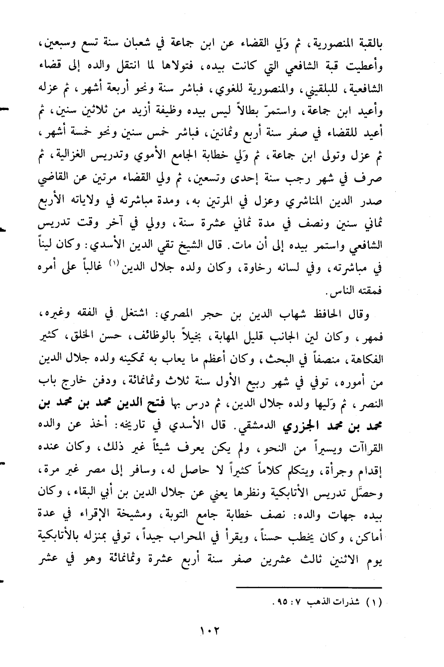 وقال الحافظ شهاب الدين بن حجر المصري: أشتغل في الفقه وغيره، فمهر، وكان لين الجانب قليل المهابة، بخيلا بالوظائف، حسن الخلق، كثير الفكاهة، منصفا في البحث وكان أعظم ما يعاب به تمكينه ولده جلال الدين من أموره توفي في شهر ربيع الأول سنة ثلاث وثمانمائة ودفن خارج باب النصر ثم وليها ولده جلال الدين ثم درس بها فتح الدين محمد بن محمد بن محمد بن محمد الجزري الدمشقي. قال الأسدي في تاريخه: أخذ عن والده القراءات ويسيرا من النحو ولم يكن يعرف شيئا غير ذلك وكان عنده أقدام وجرأة ويتكلم كلاما كثيرا لا حاصل له وسافر إلى مصر غير مرة وحصل تدريس الأتابكية ونظرها يعني عن جلال الدين بن أبي البقاء وكان بيده جهات والده نصف خطابة جامع التوبة ومشيخة الأقراء في عدة أماكن وكان يخطب حسنا ويقرأ في المحراب جيدا توفي بمنزله بالأتابكية يوم الأثنين ثالث عشرين صفر سنة أربع عشر وثمانمائة وهو في عشر