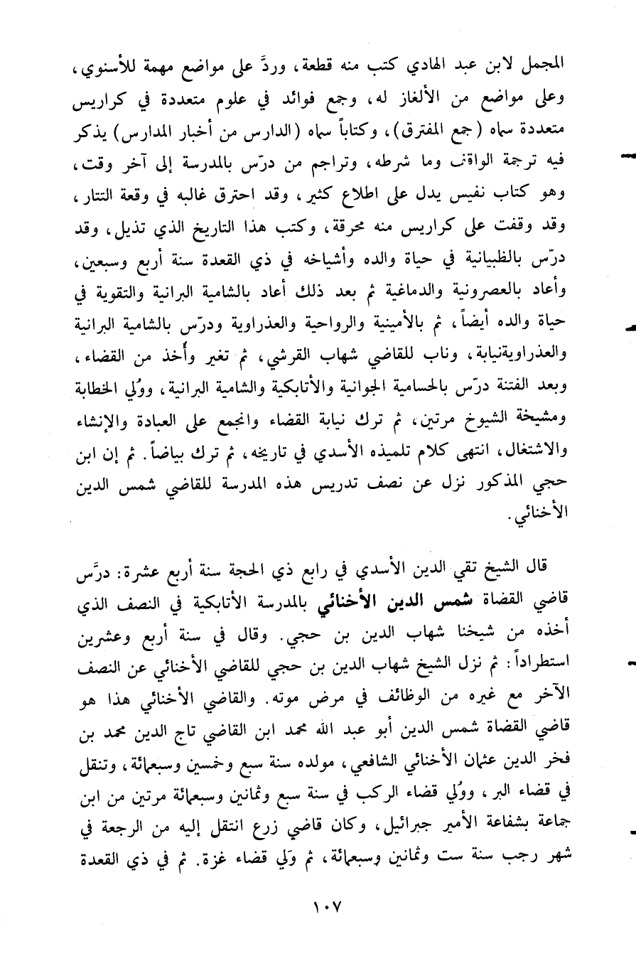 قال الشيخ تقي الدين الأسدي في رابع ذي الحجة سنة أربع عشرة: درس قاضي القضاة شمس الدين الأخنائي بالمدرسة الأتابكية في النصف الذي أخذه من شيخنا شهاب الدين بن حجي. وقال في سنة أربع وعشرين: استطرادا ثم نزل الشيخ شهاب الدين بن حجي للقاضي الأخنائي عن النصف الآخر مع غيره من الوظائف في مرض موته والقاضي الأخنائي هذا هو قاضي القضاة شمس الدين أبو عبد الله محمد ابن القاضي تاج الدين محمد بن فخر الدين عثمان الأخنائي الشافعي مولده سنة سبع وخمسين وسبعمائة وتنقل في قضاء البر وولي قضاء الركب في سنة سبع وثمانين وسبعمائة مرتين من ابن جماعة بشفاعة الأمير جبرائيل وكان قاضي زرع انتقل إليه من الرجعة في شهر رجب سنة ست وثمانين وسبعمائة ثم ولي قضاء غزة ثم في ذي القعدة