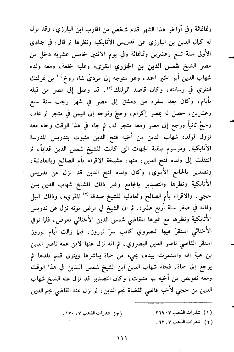 وثمانمائة وفي أواخر هذا الشهر قدم شخص من أقارب ابن البارزي وقد نزل له كمال الدين بن البارزي عن تدريس الأتابكية ونظرها ثم قال في جمادى الأولى سنة تسع وعشرين وثمانمائة وفي يوم الاثنين خامس عشريه دخل من مصر الشيخ شمس الدين بن الجزري المقريء وعليه خلعة ومعه ولده شهاب الدين أبو الخير احمد وهو متوجه إلى مردي شاه روخ1 بن تمرلنك التتري في رسالته وكان قاصد تمرلنك2 قد وصل إلى مصر من قبله بأيام وكان بعد سفره من دمشق إلى مصر في شهر رجب سنة سبع وعشرين حصل له بمصر اكرم وحج وتوجه الى اليمن في متجر ثم عاد وحج ثانيا ورجع الى مصر ومعه متجر له ثم جاء في هذا الوقت وجاء معه نزول لولده شهاب الدين من أخيه فتح الدين مثبوت بتدريس المدرسه الأتابكيه ومرسوم ببقيه الجهات التي كانت للشيخ شمس الدين قديما ثم انتقلت الى ولده فتح الدين منها مشيخة الإقراء بأم الصالح وبالعادلية وتصدير بالجامع الأموي وكان ولده فتح الدين قد نزل عن تدريس الأتابكية ونظرها والتصدير بالجامع وغير ذلك للشيخ شهاب الدين بن حجي والاقراء بأم الصالح والعادليه للشيخ صدقه3 المقرئ وذلك قبيل وفاته في صفر سنة أربع عشرة ثم أن الشيخ في مرض موته نزل عن تدريس الأتابكية ونظرها مع غيرها للقاضي شمس الدين الأخنائي بعوض فلما توفي الأخنائي استقر فيها البصروي كاتب سر نوروز فلما زالت أيام نوروز استقر القاضي ناصر الدين البصروي ثم أنه نزل عنها لابن عمه ناصر الدين بن هبة الله واستمرت بيده يجيء من حماة يباشرها ويتولى قسم بلدها ثم يرجع إلى حماة فجاء شهاب الدين ابن الشيخ شمس الدين في هذا الوقت ومعه تفويض من أخيه بها مثبوت وكان التصدير قد نزل عنه الشيخ شهاب الدين بن حجي لأخيه قاضي القضاة نجم الدين ثم نزل عنه القاضي نجم الدين