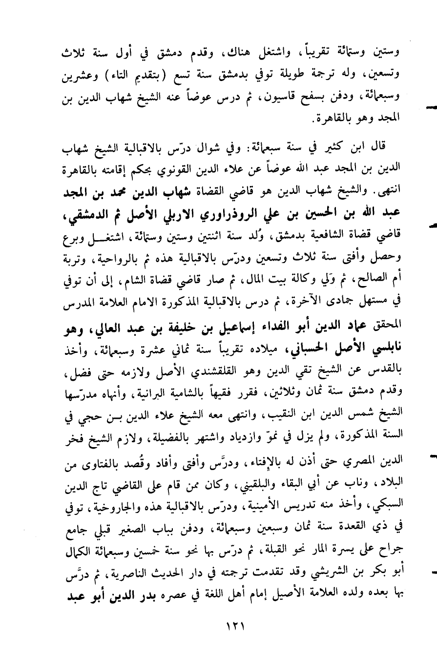 قال ابن كثير في سنة سبعمائة وفي شوال درس بالإقبالية الشيخ شهاب الدين بن المجد عبد الله عوضا عن علاء الدين القونوي بحكم إقامته بالقاهرة انتهى والشيخ شهاب الدين هو قاضي القضاة شهاب الدين محمد بن المجد عبد الله بن الحسين بن علي الروذراوري الاربلي الأصل ثم الدمشقي قاضي قضاة الشافعية بدمشق ولد سنة اثنتين وستين وستمائة اشتغل وبرع وحصل وأفتى سنة ثلاث وتسعين ودرس بالاقبالية هذه ثم بالرواحية وتربة أم الصالح ثم ولي وكالة بيت المال ثم صار قاضي قضاة الشام إلى أن توفي في مستهل جمادى الآخرة ثم درس بالاقبالية المذكورة الإمام العلامة المدرس المحقق عماد الدين أبو الفداء إسماعيل بن خليفة بن عبد العالي وهو نابلسي الأصل الحسباني ميلاده تقريبا سنة ثماني عشرة وسبعمائة وأخذ بالقدس عن الشيخ تقي الدين وهو القلقشندي الأصل ولازمه حتى فضل وقدم دمشق سنة ثمان وثلاثين فقرر فقيها بالشامية البرانية وأنهاه مدرسها الشيخ شمس الدين ابن النقيب وانتهى معه الشيخ علاء الدين بن حجي في السنة المذكورة ولم يزل في نمو وازدياد واشتهر بالفضيلة ولازم الشيخ فخر الدين المصري حتى أذن له بالإفتاء ودرس وأفتى وأفاد وقصد بالفتاوى من البلاد وناب عن أبي البقاء والبلقيني وكان ممن قام على القاضي تاج الدين السبكي وأخذ منه تدريس الأمينية ودرس بالاقبالية هذه والجاروخية توفي في ذي القعدة سنة ثمان وسبعين وسبعمائة ودفن بباب الصغير قبلي جامع جراح على يسرة المار نحو القبلة ثم درس بها نحو سنة خمسين وسبعمائة الكمال أبو بكر بن الشريشي وقد تقدمت ترجمته في دار الحديث الناصرية ثم درس بها بعده ولده العلامة الأصيل إمام أهل اللغة في عصره بدر الدين أبو عبد
