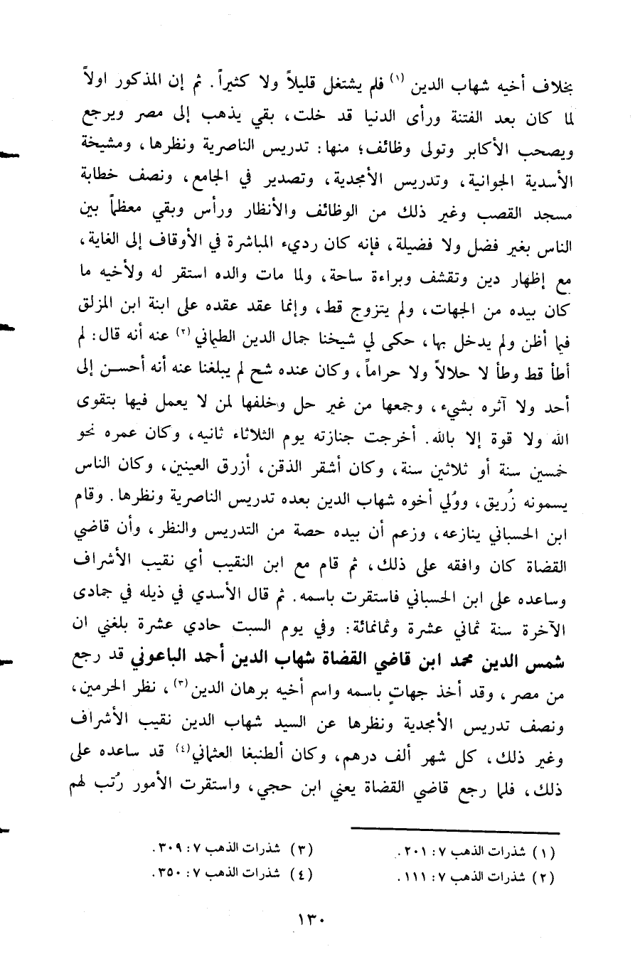 بخلاف أخيه شهاب الدينب1 فلم يشتغل قليلا ولا كثيرا ثم إن المذكور أولا لما كان بعد الفتنة ورأى الدنيا قد خلت بقي يذهب إلى مصر ويرجع ويصحب الأكابر وتولى وظائف منها تدريس الناصرية ونظرها ومشيخة الأسدية الجوانية وتدريس الأمجدية وتصدير في الجامع ونصف خطابة مسجد القصب وغير ذلك من الوظائف والأنظار ورأس وبقي معظما بين الناس بغير فضل ولا فضيلة فإنه كان رديء المباشرة في الأوقاف إلى الغاية مع إظهار دين وتقشف وبراءة ساحة ولما مات والده استقر له ولأخيه ما كان بيده من الجهات ولم يتزوج قط وإنما عقد عقدة على ابنة ابن المزلق فيما أظن ولم يدخل بها حكى لي شيخنا جمال الدين الطيماني2 عنه أنه قال: لم أطأ قط وطأ لا حلالا ولا حراما وكان عنده شح لم يبلغنا عنه أنه أحسن إلى أحد ولا آثره بشيء وجمعها من غير حل وخلفها لمن لا يعمل فيها بتقوى الله ولا قوة إلا بالله أخرجت جنازته يوم الثلاثاء ثانيه وكان عمره نحو خمسين سنة أو ثلاثين سنة وكان أشقر الذقن أزرق العينين وكان الناس يسمونه زريق وولي أخوه شهاب الدين بعده تدريس الناصرية ونطرها وقام ابن الحسباني ينازعه وزعم أن بيده حصة من التدريس والنظر وأن قاضي القضاة كان وافقه على ذلك ثم قام مع ابن النقيب أي نقيب الأشراف وساعده على ابن الحسباني فاستقرت باسمه ثم قال الأسدي في ذيله في جمادى الآخر سنة ثماني عشرة وثمانمائة وفي يوم السبت حادي عشر بلغني أن شمس الدين محمد ابن قاضي القضاة شهاب الدين احمد الباعوني قد رجع من مصر وقد آخذ جهات باسمه واسم أخيه برهان الدين3 نظر الحرمين ونصف تدريس الأمجدية ونظرها عن السيد شهاب الدين نقيب الأشراف وغير ذلك كل شهر ألف درهم وكان الطنبغا العثماني4 قد ساعده على ذلك فلما رجع قاضي القضاة يعني ابن حجي واستقرت الأمور رتب لهم