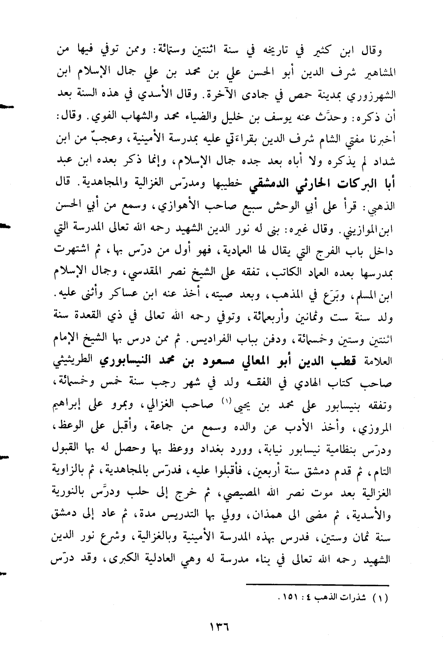 وقال ابن كثير في تاريخه في سنة اثنتين وستمائة: وممن توفي فيها من المشاهير شرف الدين أبو الحسن علي بن محمد بن علي جمال الإسلام ابن الشهرزوري بمدينة حمص في جمادى الآخرة. وقال الأسدي في هذه السنة بعد أن ذكره: وحدث عنه يوسف بن خليل والضياء محمد والشهاب الفوي. وقال: أخبرنا مفتي الشام شرف الدين بقراءتي عليه بمدرسة الأمينية وعجب من ابن شداد لم يذكره ولا أباه بعد جده جمال الإسلام وإنما ذكر بعده ابن عبد أبا البركات الحارثي الدمشقي خطيبها ومدرس الغزالية والمجاهدية. قال الذهبي: قرأ على أبي الوحش سبيع صاحب الأهوازي وسمع من أبي الحسن ابن الموازيني. وقال غيره: بنى له نور الدين الشهيد رحمه الله تعالى المدرسة التي داخل باب الفرج التي يقال لها العمادية فهو أول من درس بها ثم اشتهرت بمدرسها بعده العماد الكاتب تفقه على الشيخ نصر المقدسي وجمال الإسلام ابن المسلم وبرع في المذهب وبعد صيته أخذ عنه ابن عساكر وأثنى عليه ولد سنة ست وثمانين وأربعمائة وتوفي رحمه الله تعالى في ذي القعدة سنة اثنتين وستين وخمسمائة ودفن بباب الفراديس. ثم ممن درس بها الشيخ الإمام العلامة قطب الدين أبو المعالي مسعود بن محمد النيسابوري الطريثيثي صاحب كتاب الهادي في الفقه ولد في شهر رجب سنة خمس وخمسمائة وتفقه بنسابور على محمد بن يحيى1 صاحب الغزالي وبمرو على إبراهيم المروزي وأخذ الأدب عن والده وسمع من جماعة وأقبل على الوعظ ودرس بنظامية نيسابور نيابة وورد بغداد ووعظ بها وحصل له بها القبول التام ثم قدم دمشق سنة أربعين فأقبلوا عليه فدرس بالمجاهدية ثم بالزاوية الغزالية بعد موت نصر الله المصيصي ثم خرج إلى حلب ودرس بالنورية والأسدية ثم مضى إلى همذان وولي بها التدريس مدة ثم عاد إلى دمشق سنة ثمان وستين فدرس بهذه المدرسة الأمينية وبالغزالية وشرع نور الدين الشهيد رحمه الله تعالى في بناء مدرسة له وهي العادلية الكبرى وقد درس