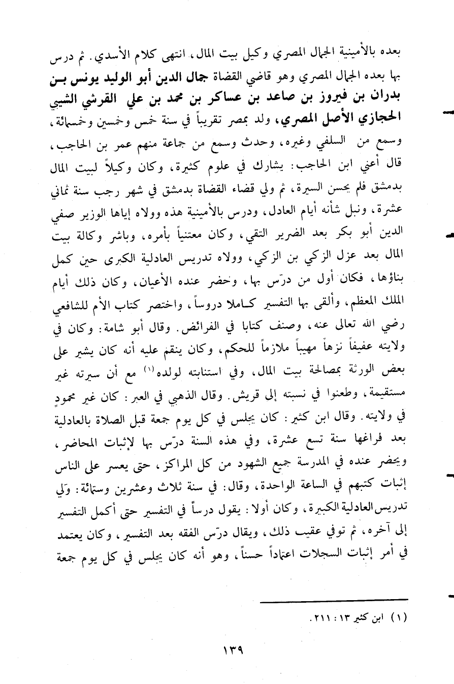 بعده بالأمينية الجمال المصري وكيل بيت المال انتهى كلام الأسدي. ثم درس بها بعده الجمال المصري وهو قاضي القضاة جمال الدين أبو الوليد يونس بن بدران بن فيروز بن صاعد بن عساكر بن محمد بن علي القرشي الشيبي الحجازي الأصل المصري ولد بمصر تقريبا في سنة خمس وخمسين وخمسمائة وسمع من السلفي وغيره وحدث وسمع من جماعة منهم عمر بن الحاجب قال أعني ابن الحاجب: يشارك في علوم كثيرة وكان وكيلا لبيت المال بدمشق فلم يحسن السيرة ثم ولي قضاء القضاة بدمشق في شهر رجب سنة ثماني عشرة ونبل شأنه أيام العادل ودرس بالأمينية هذه وولاه إياها الوزير صفي الدين أبو بكر بعد الضرير التقي وكان معتنيا بأمره وباشر وكالة بيت المال بعد عزل الزكي بن الزكي وولاه تدريس العادلية الكبرى حين كمل بناؤها فكان أول من درس بها وحضر عنده الأعيان وكان ذلك أيام الملك المعظم وألقى بها التفسير كاملا دروسا وأختصر كتاب الأم للشافعي رضي الله تعالى عنه وصنف كتابا في الفرائض وقال أبو شامة: وكان في ولايته عفيفا نزها مهيبا ملازما للحكم وكان ينقم عليه أنه كان يشير على بعض الورثه بمصالحة بيت المال وفي استنابته لولده1 مع أن سيرته غير مستقيمة وطعنوا في نسبته إلى قريش وقال الذهبي في العبر: كان غير محمود في ولايته وقال ابن كثير كان يجلس في كل يوم جمعة قبل الصلاة بالعادلية بعد فراغها سنة تسع عشرة وفي هذه السنة درس بها لإثبات المحاضر ويحضر عنده في المدرسة جميع الشهود من كل المراكز حتى يعسر على الناس إثبات كتبهم في الساعة الواحدة وقال في سنة ثلاث وعشرين وستمائة: ولي تدريس العادلية الكبيرة وكان أولا: يقول درسا في التفسير حتى أكمل التفسير إلى آخره ثم توفي عقيب ذلك ويقال درس الفقه بعد التفسير وكان يعتمد في أمر إثبات السجلات اعتمادا حسنا وهو أنه كان يجلس في كل يوم جمعة