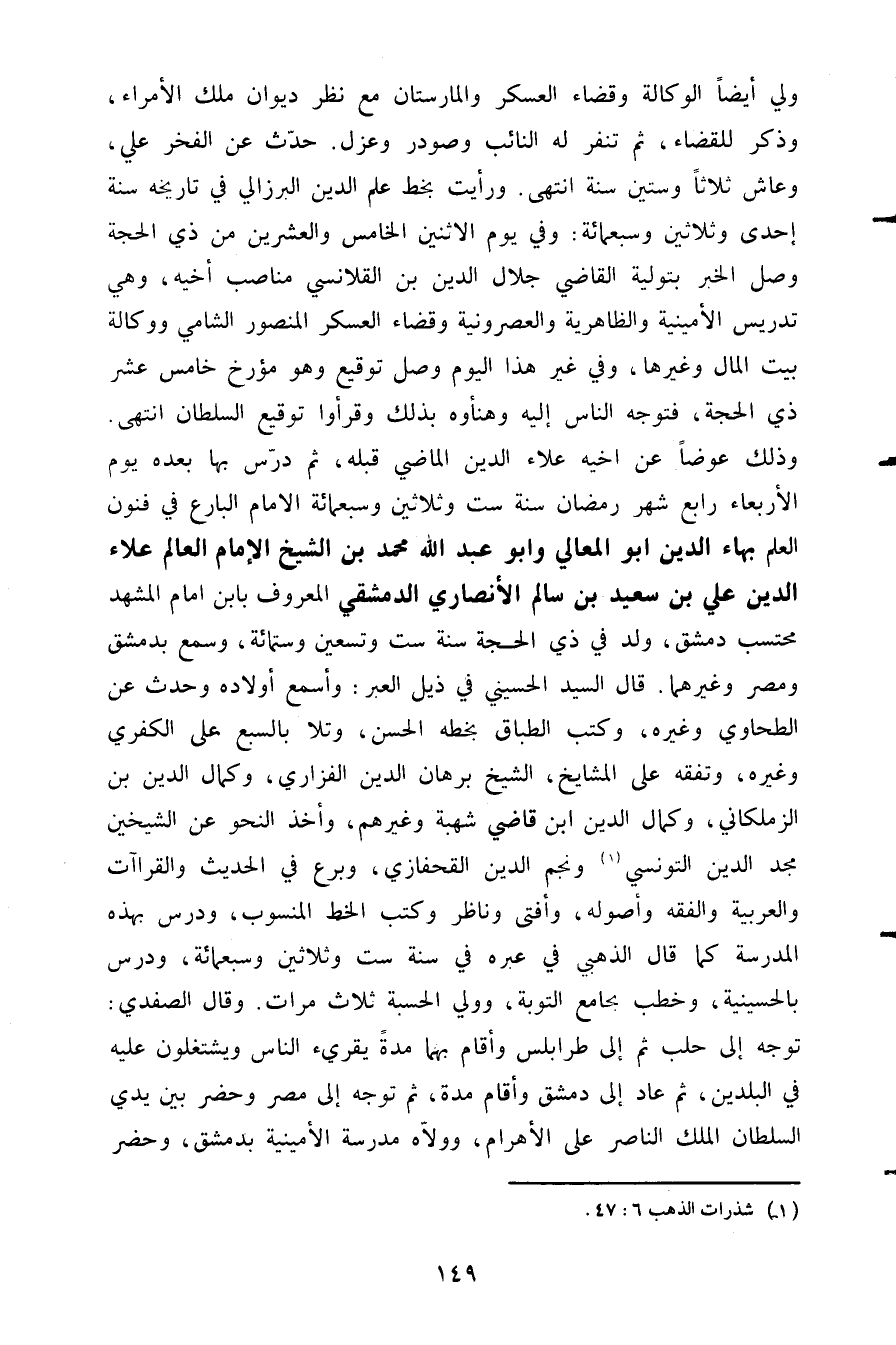 ولي أيضا الوكالة وقضاء العسكر والمارستان مع نظر ديوان ملك الأمراء وذكر للقضاء ثم تنفر له النائب وصودر وعزل حدث عن الفخر علي وعاش ثلاثا وستين سنة انتهى ورأيت بخط علم الدين البرزالي في تاريخه سنة إحدى وثلاثين وسبعمائة وفي يوم الاثنين الخامس والعشرين من ذي الحجة وصل الخبر بتولية القاضي جلال الدين بن القلانسي مناصب أخيه وهي تدريس الأمينية والظاهرية والعصرونية وقضاء العسكر المنصور الشامي ووكالة بيت المال وغيرها وفي غير هذا اليوم وصل توقيع وهو مؤرخ خامس عشر ذي الحجة فتوجه الناس إليه وهنأوه بذلك وقرأوا توقيع السلطان انتهى. وذلك عوضا عن أخيه علاء الدين الماضي قبله ثم درس بها بعده يوم الأربعاء رابع شهر رمضان سنة ست وثلاثين وسبعمائة الإمام البارع في فنون العلم بهاء الدين أبو المعالي وأبو عبد الله محمد بن الشيخ الإمام العالم علاء الدين علي بن سعيد بن سالم الأنصاري الدمشقي المعروف بابن إمام المشهد محتسب دمشق ولد في ذي الحجة سنة ست وتسعين وستمائة وسمع بدمشق ومصر وغيرهما. قال السيد الحسيني في ذيل العبر: وأسمع أولاده وحدث عن الطحاوي وغيره وكتب الطباق بخطه الحسن وتلا بالسبع على الكفري وغيره وتفقه على المشايخ الشيخ برهان الدين الفزاري وكمال الدين بن الزملكاني وكمال الدين ابن قاضي شهبة وغيرهم وأخذ النحو عن الشيخين مجد الدين التونسي1 ونجم الدين القحفازي وبرع في الحديث والقراآت والعربية والفقه وأصوله وأفتى وناظر وكتب الخط المنسوب ودرس بهذه المدرسة كما قال الذهبي في عبره في سنة ست وثلاثين وسبعمائة ودرس بالحسينية وخطب بجامع التوبة وولي الحسبة ثلاث مرات وقال الصفدي: توجه إلى حلب ثم إلى طرابلس وأقام بهما مدة يقريء الناس ويشتغلون عليه في البلدين ثم عاد إلى دمشق وأقام مدة ثم توجه إلى مصر وحضر بين يدي السلطان الملك الناصر على الأهرام وولاه مدرسة الأمينية بدمشق وحضر